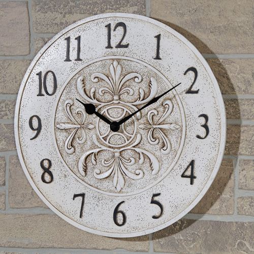 The classic motifs on the Fleur Indoor/Outdoor Wall Clock are a traditional way to add refinement to your decor. Made of polymer with a weather-resistant antique white finish, this wall clock has a raised fleur-de-lis pattern in the center, black numbers, and black metal hands. Requires one of your AA batteries. May be used indoors or outdoors in a covered area. Measures 15"dia.x2"D.