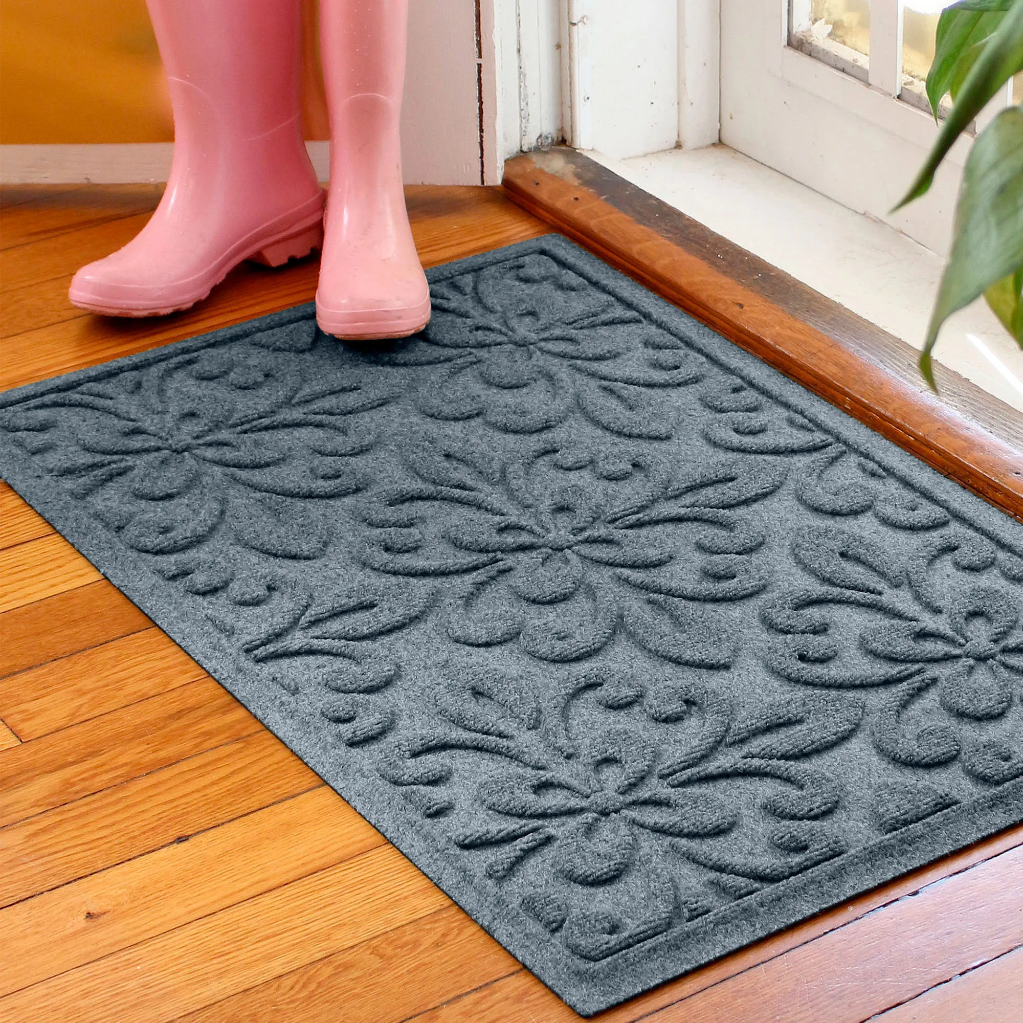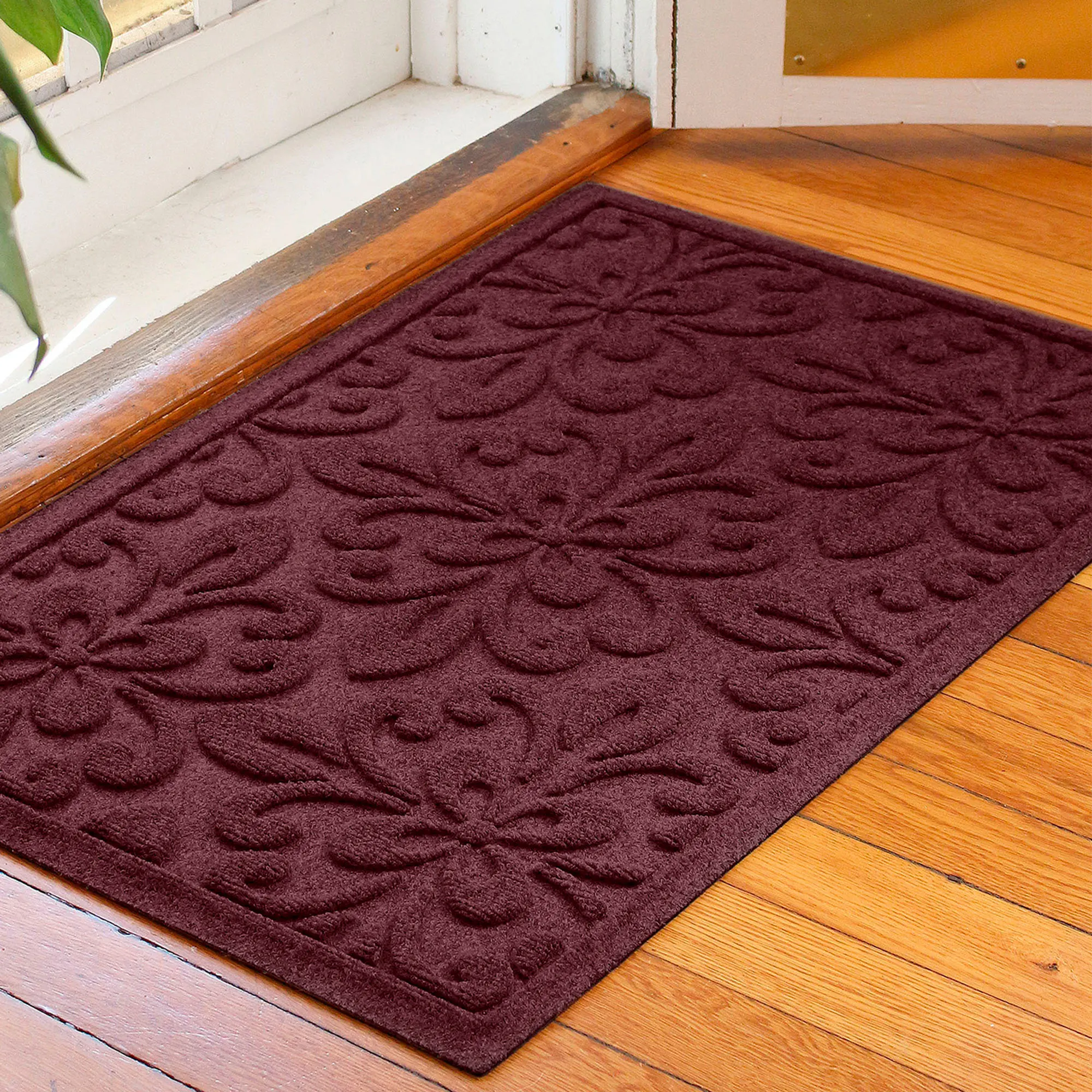 The Fleur Medallion Doormat decorates with a fun and flirty look. The antistatic PET polyester fiber floor accent has a fleur medallion design with a nonskid SBR rubber backing that is slip-resistant and certified by the National Floor Safety Institute. The WaterHog(R) exclusive Water Dam border keeps dirt and water on the mat and not your floor. Premium-grade mat is mildew-, mold-, and rot-resistant. Specify Charcoal, Burgundy, Dark Brown, Dark Green, Gray, Khaki, Navy, or Slate Blue. Doormat is 35"x23". Indoor or outdoor year-round use. Shake to remove loose dirt and hose off to clean.