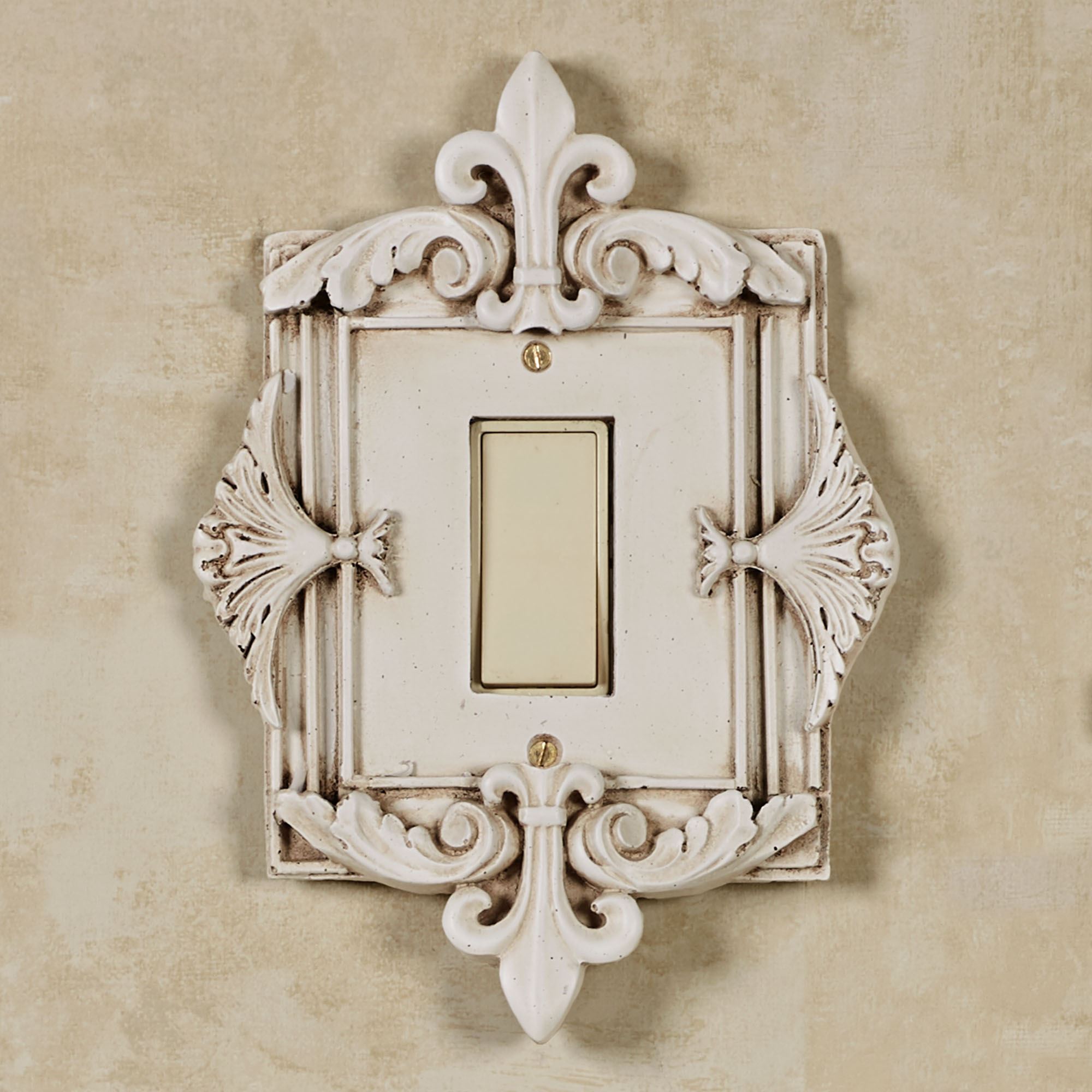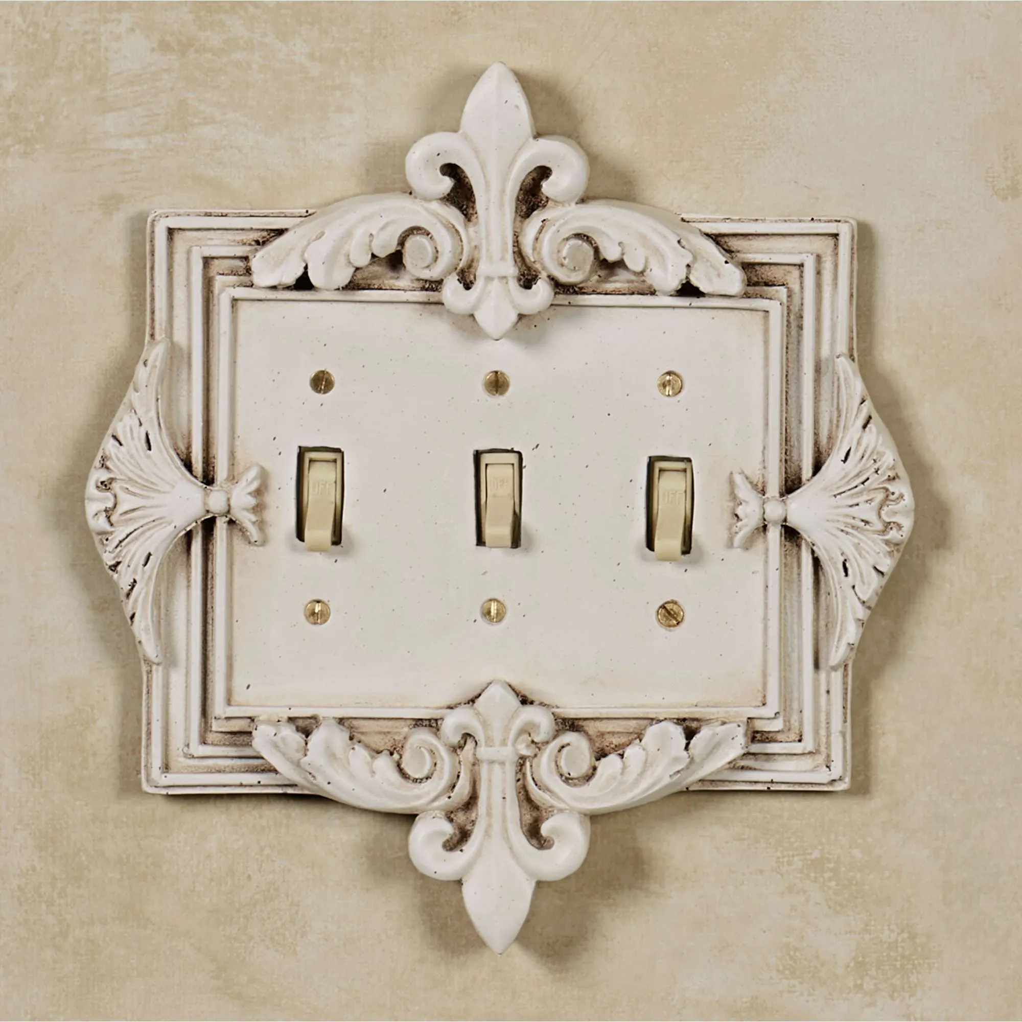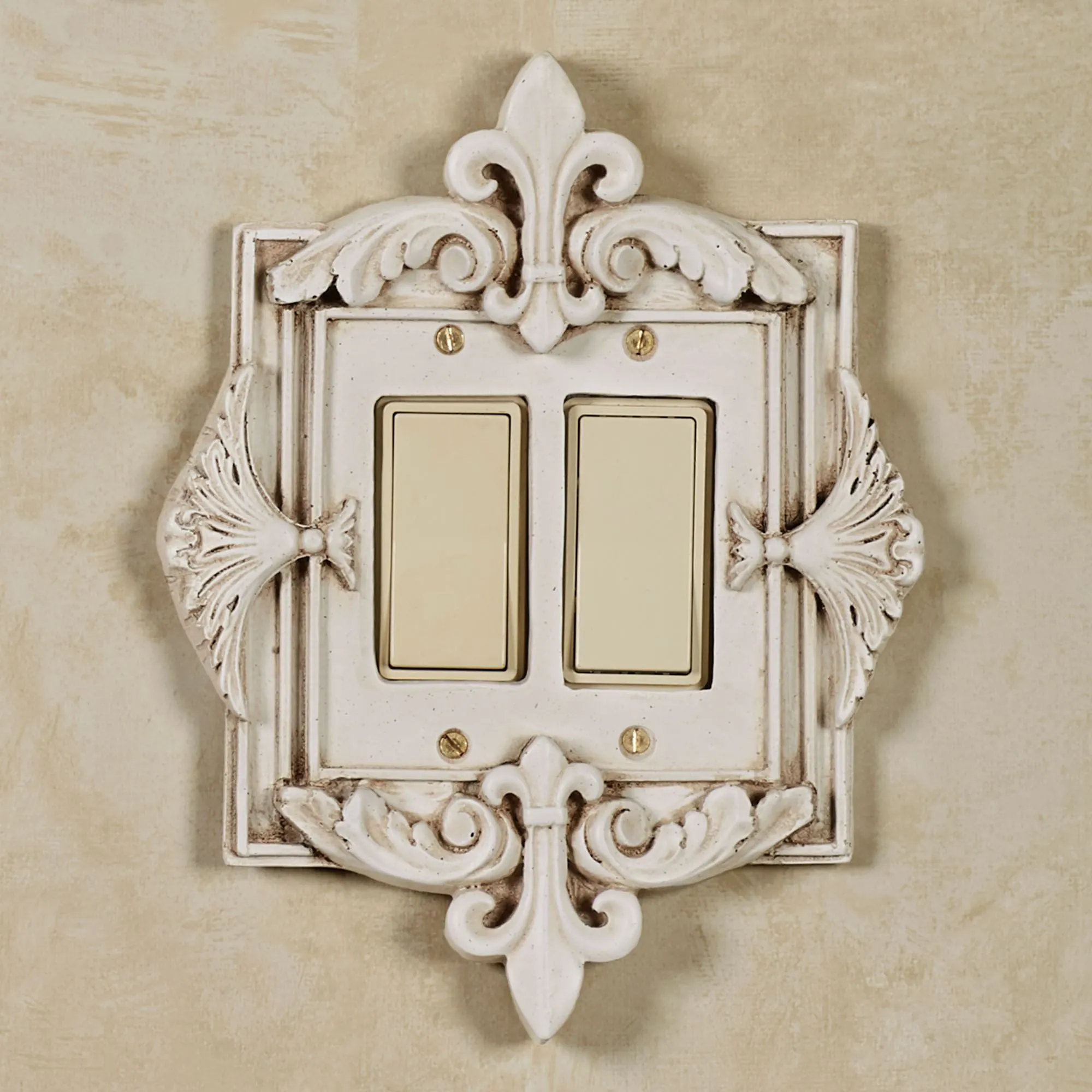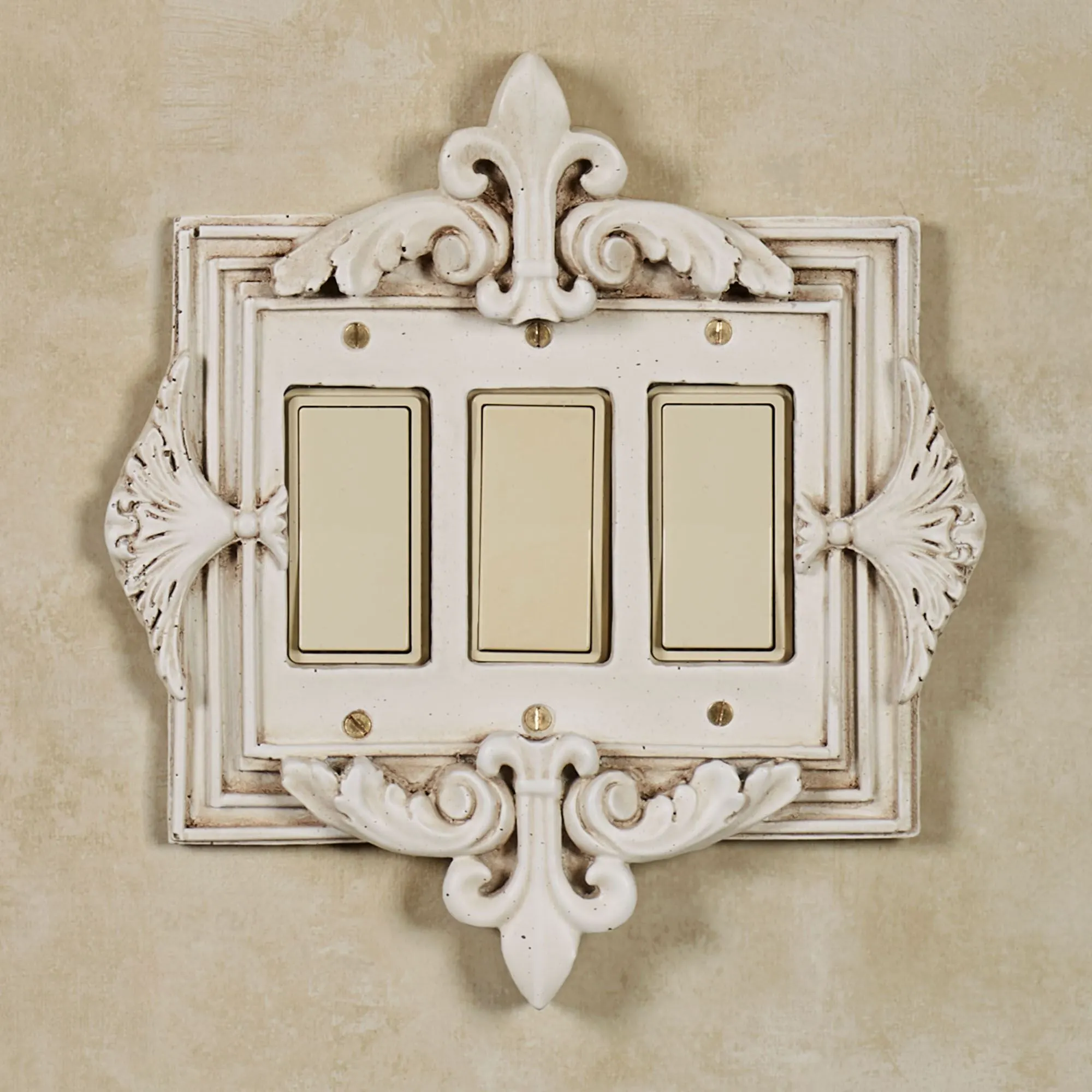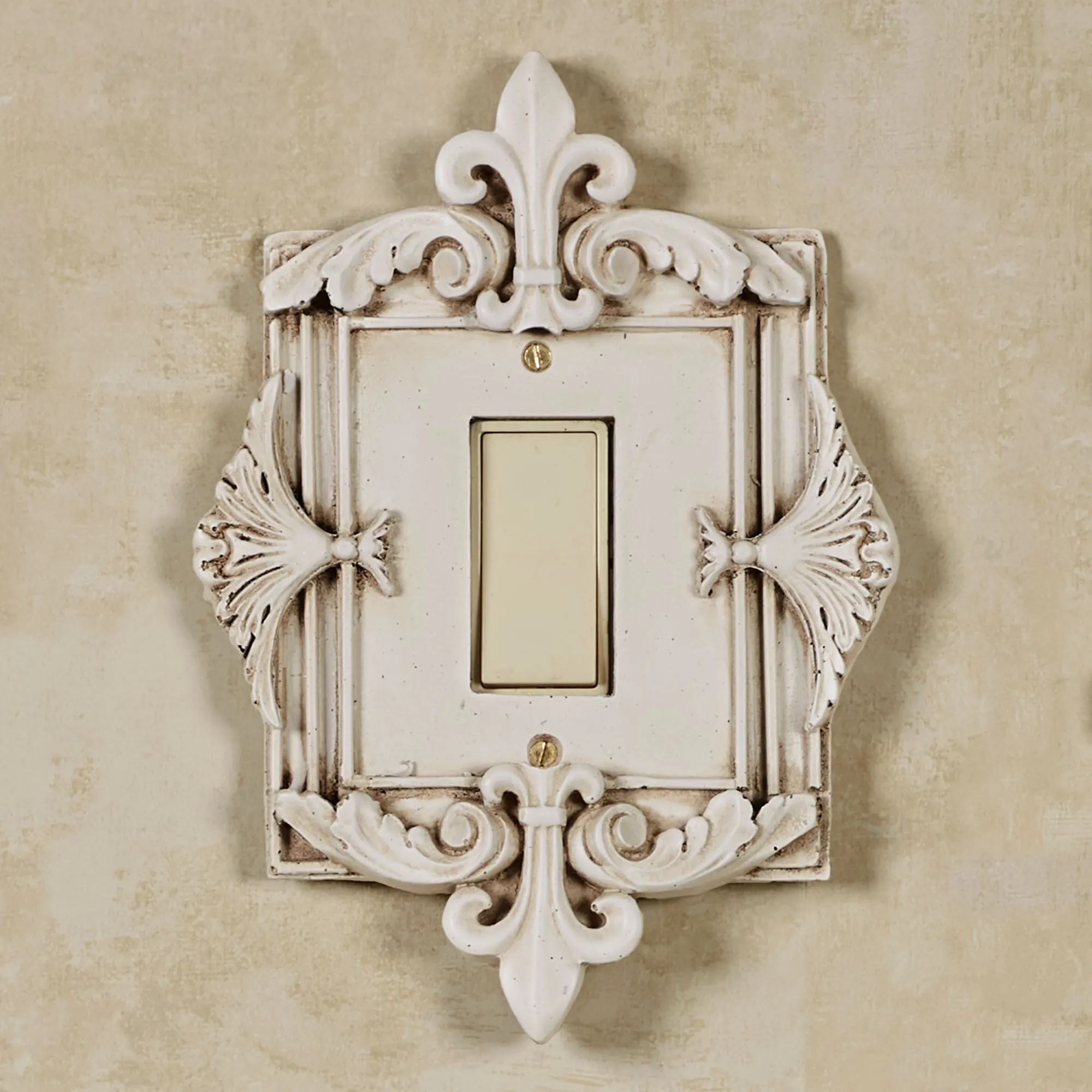 The Fleurance Old World White Decorative Switchplates add the perfect final touch to any room. Handcrafted, ornate resin switchplates feature a fleur-de-lis motif on the top and bottom and acanthus leaves on the side. Each fleur switchplate has a handpainted Old World white finish. Switches are available in Double and Triple. Dimmers/Rockers are available in Single, Double, and Triple. Outlet is available in Single. Each is approx. 9-9.5"H. Do not over-tighten screws.