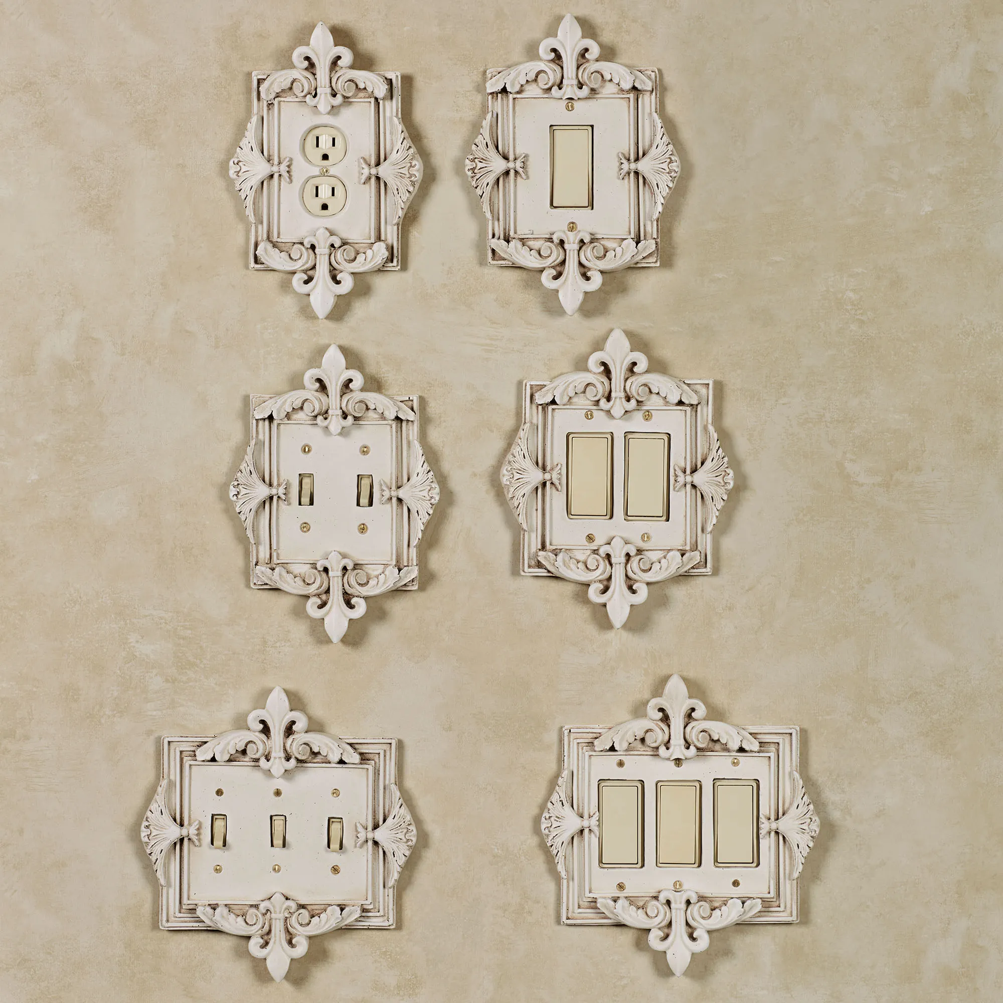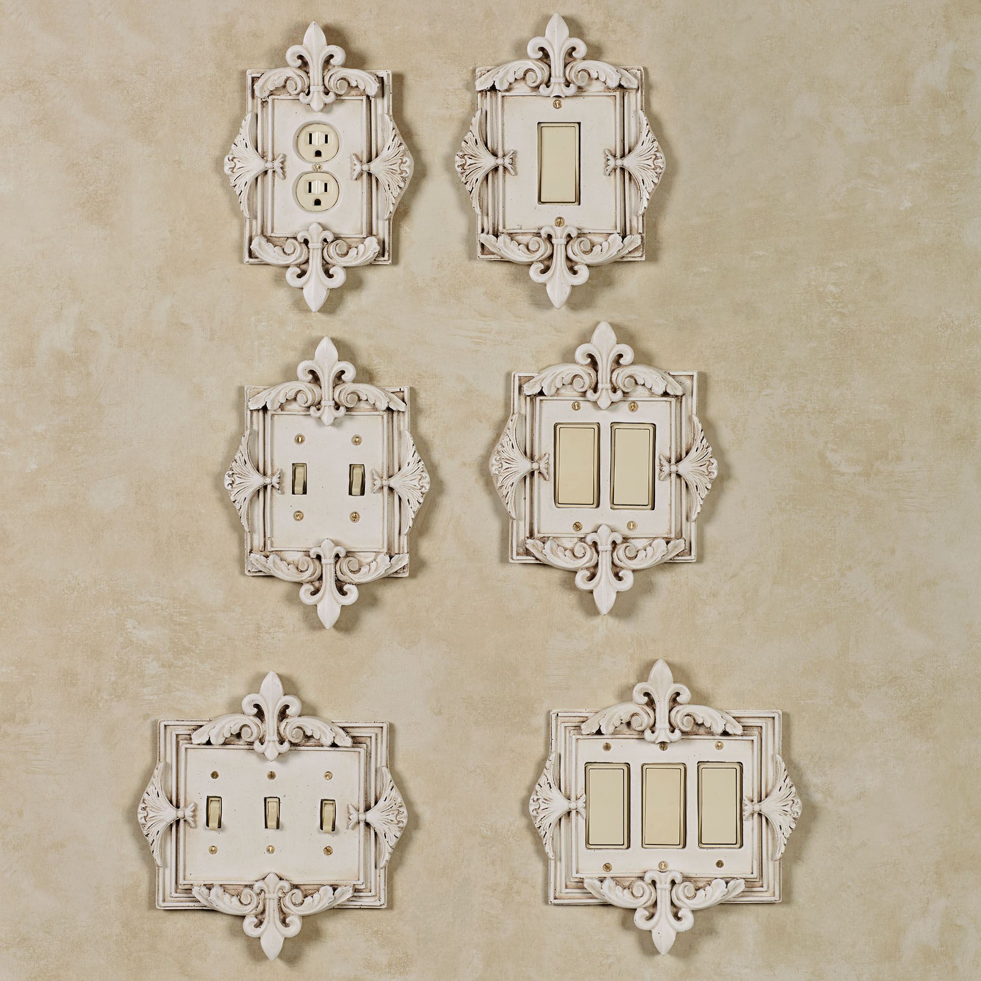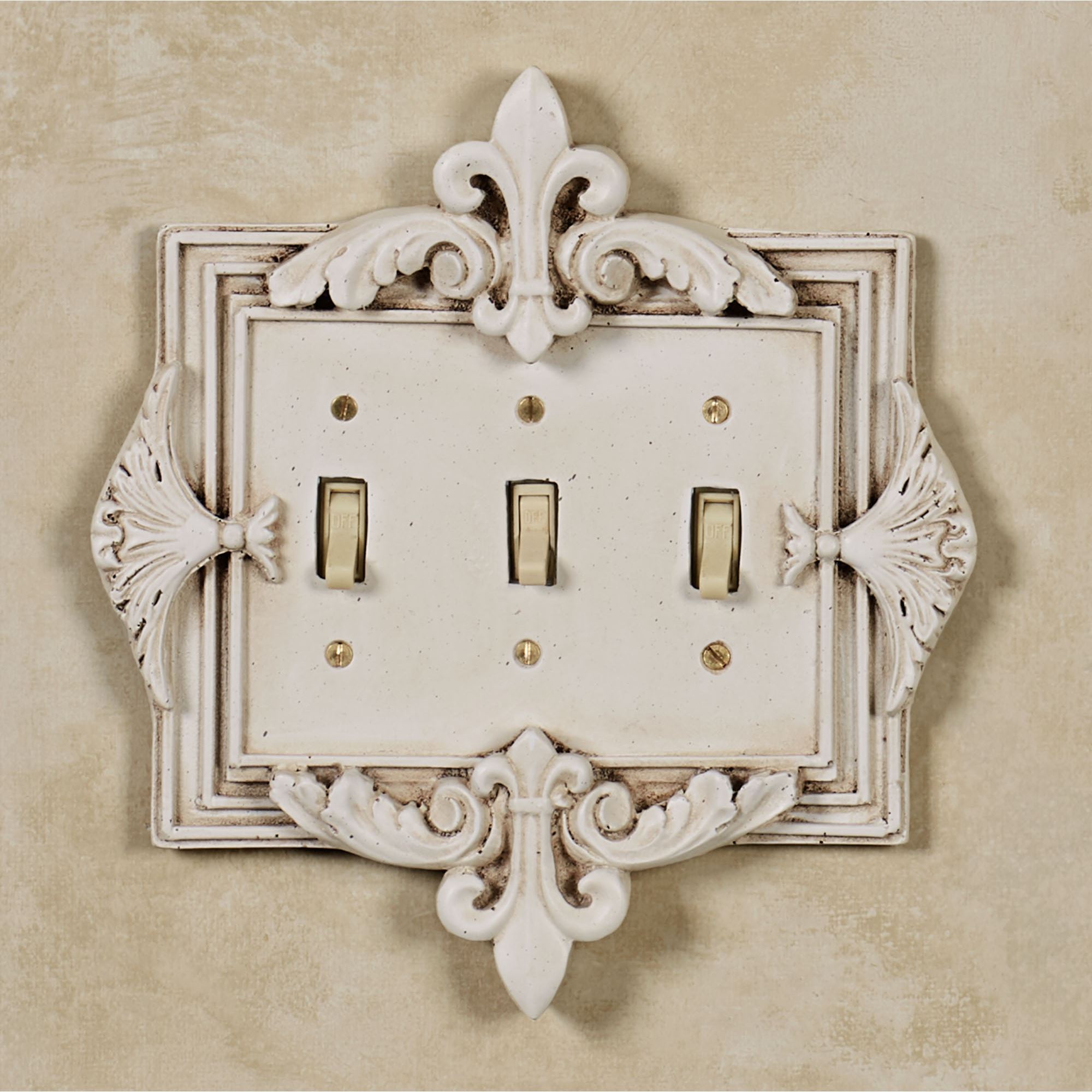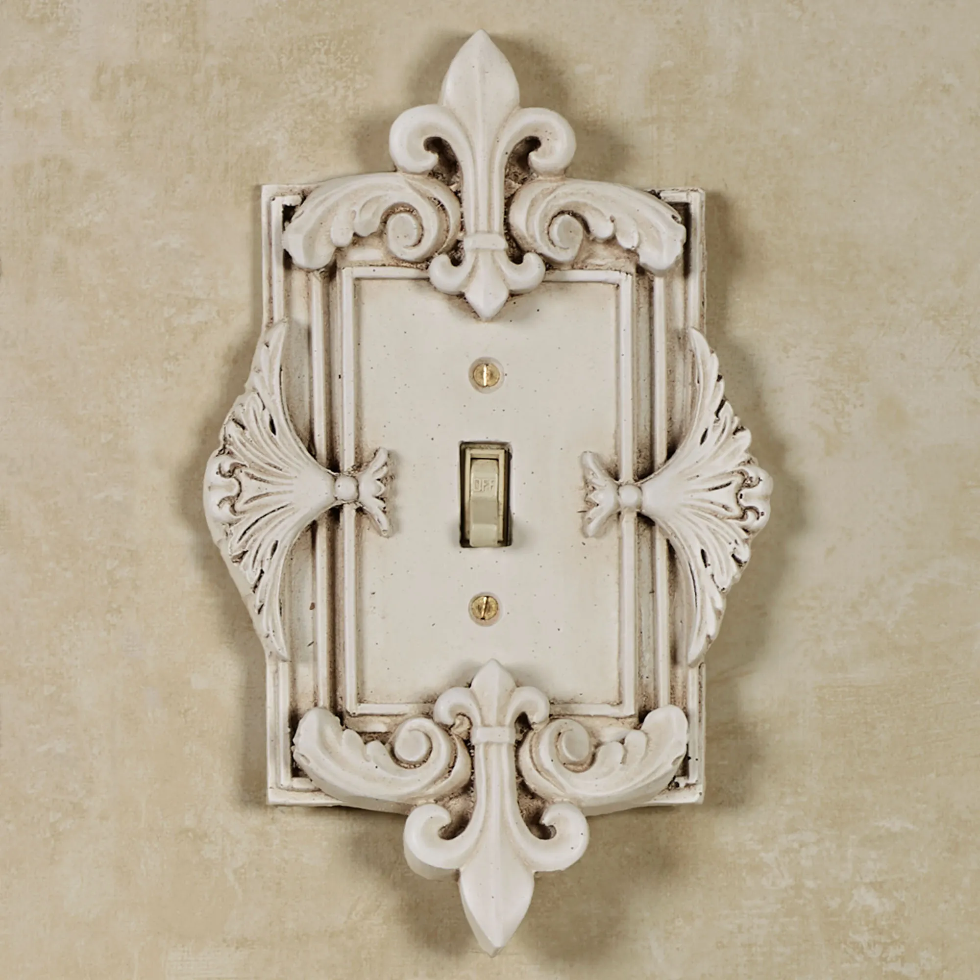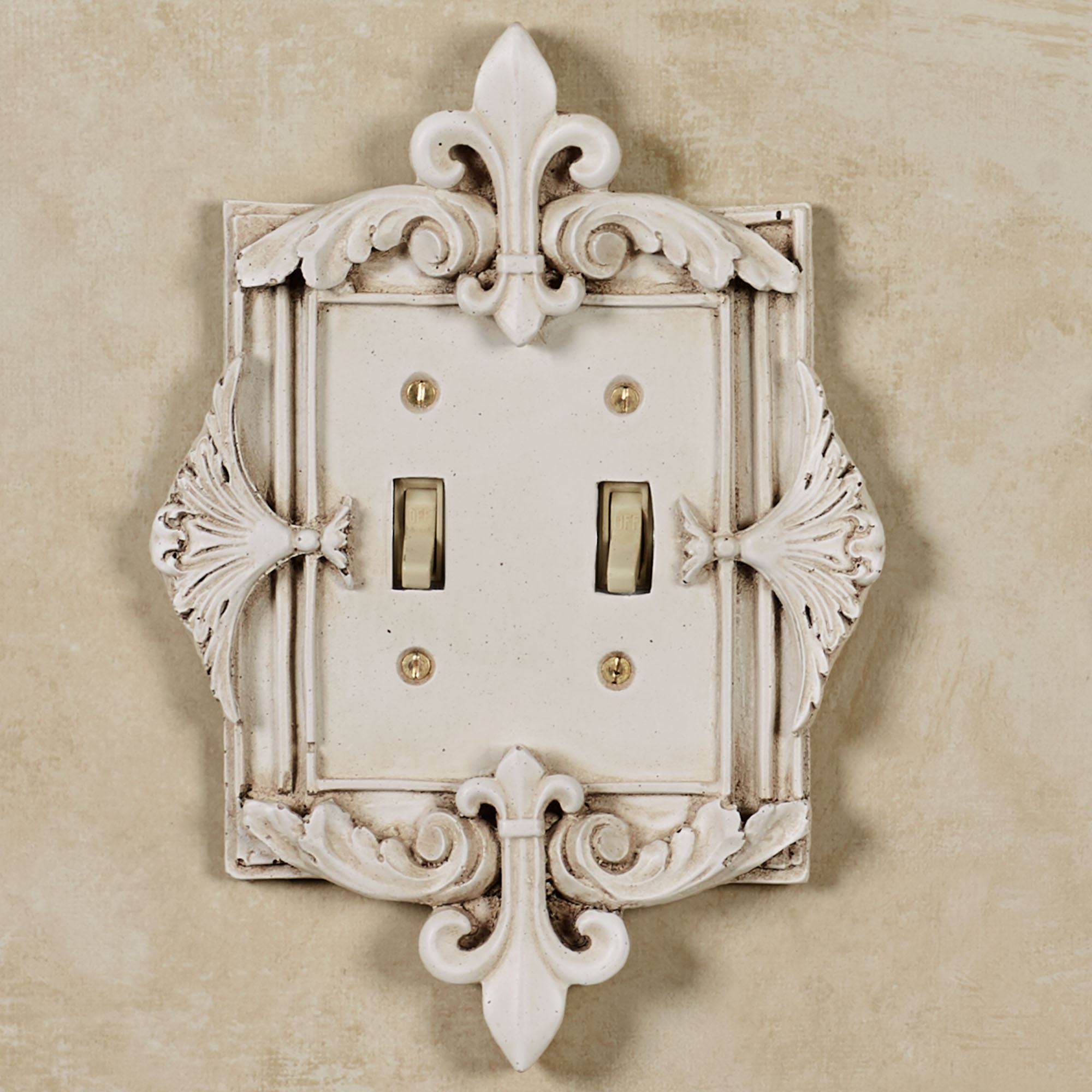 The Fleurance Old World White Decorative Switchplates add the perfect final touch to any room. Handcrafted, ornate resin switchplates feature a fleur-de-lis motif on the top and bottom and acanthus leaves on the side. Each fleur switchplate has a handpainted Old World white finish. Switches are available in Double and Triple. Dimmers/Rockers are available in Single, Double, and Triple. Outlet is available in Single. Each is approx. 9-9.5"H. Do not over-tighten screws.