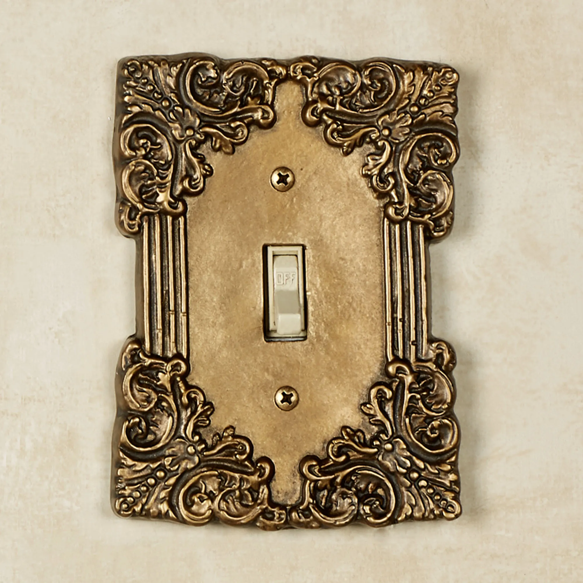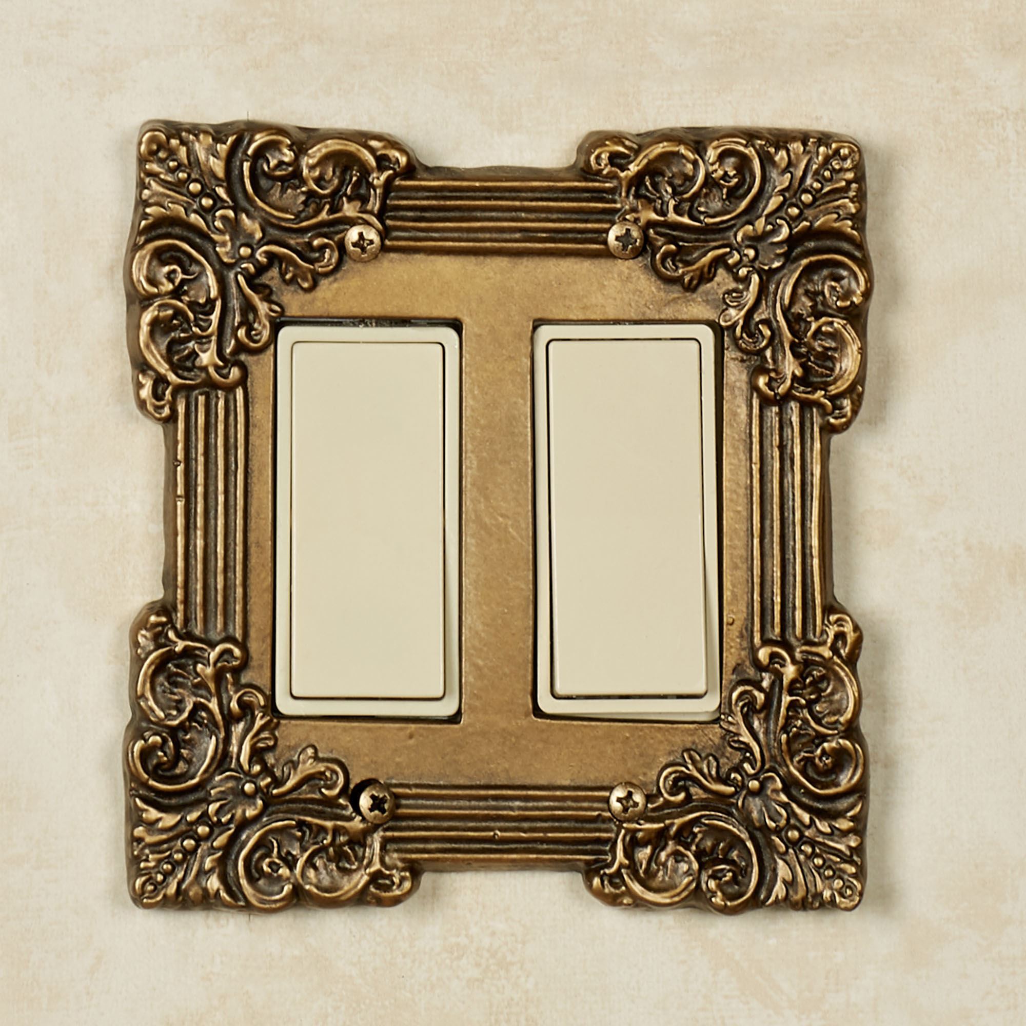 Sublime elegance details the Fleurista Switchplates. Hand-cast from aluminum, each hand-finished, antique brass switchplate features defined borders adorned with filigree scrollwork corners. Each size measures 5"H. Single Switch, Single Outlet (two sockets), and Single Dimmer/Rocker are 4"W. Double Switch and Double Dimmer/Rocker are 5"W.