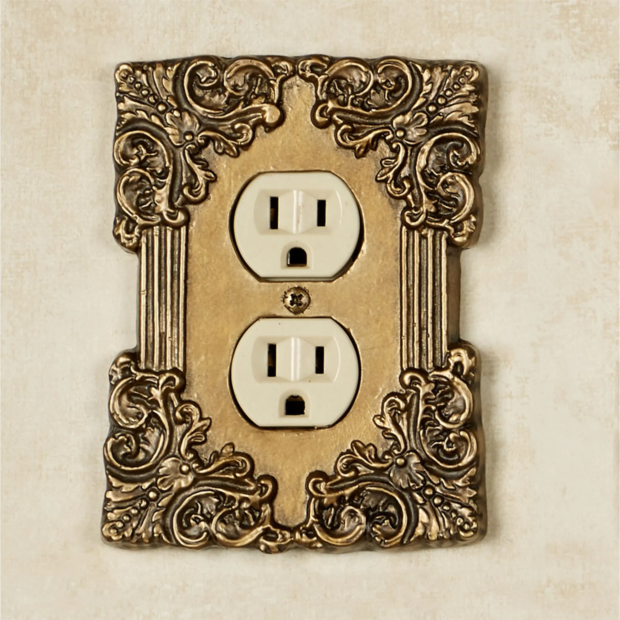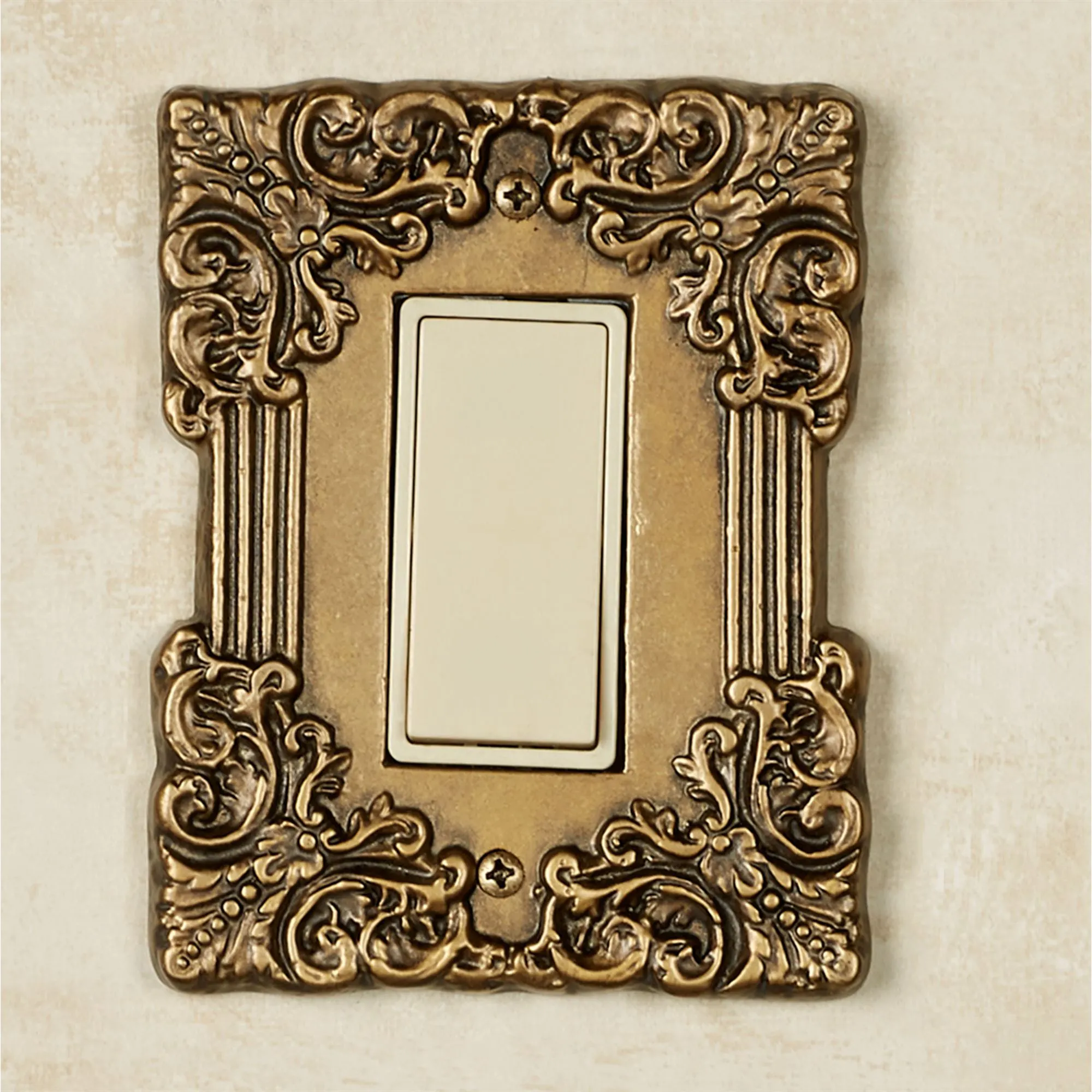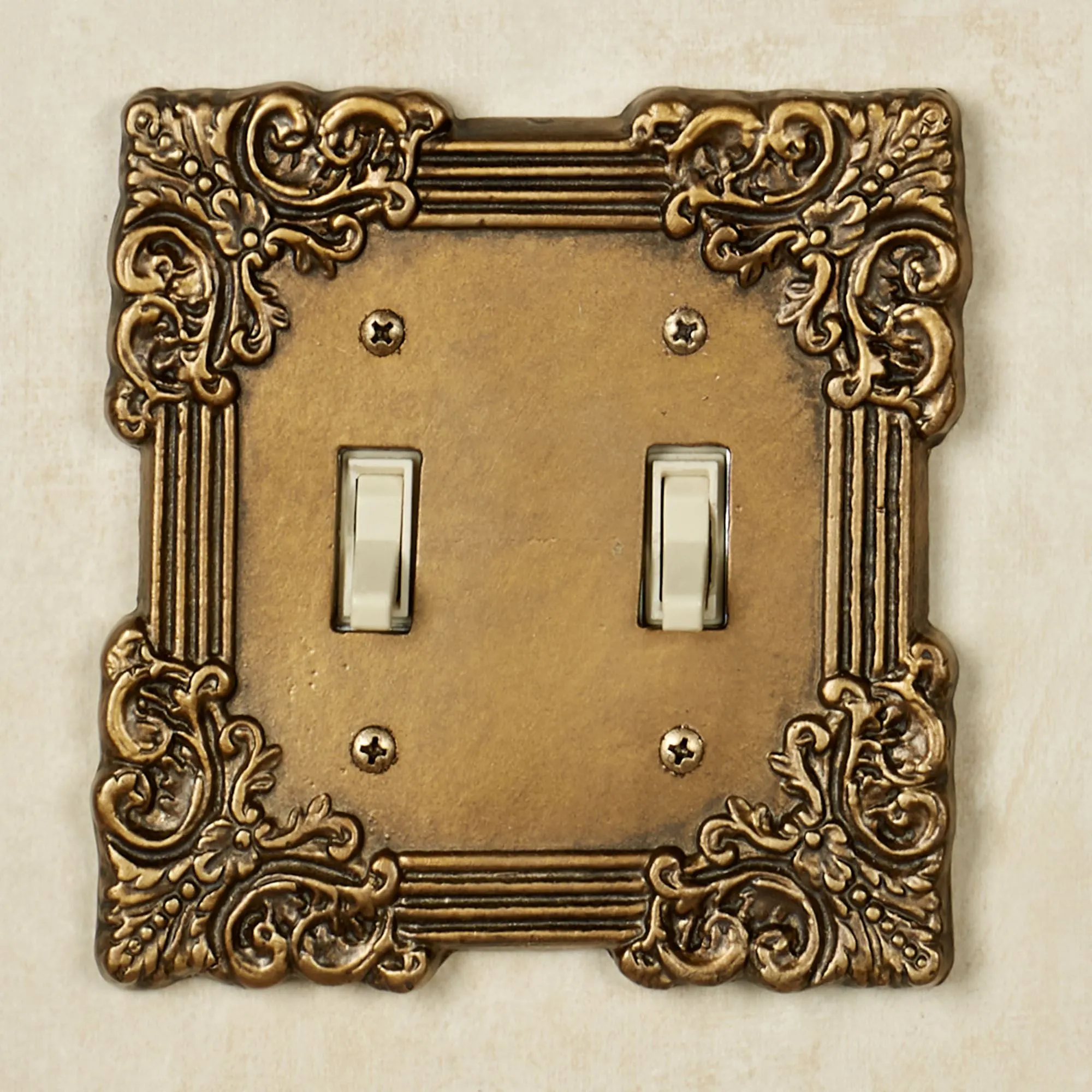 Sublime elegance details the Fleurista Switchplates. Hand-cast from aluminum, each hand-finished, antique brass switchplate features defined borders adorned with filigree scrollwork corners. Each size measures 5"H. Single Switch, Single Outlet (two sockets), and Single Dimmer/Rocker are 4"W. Double Switch and Double Dimmer/Rocker are 5"W.
