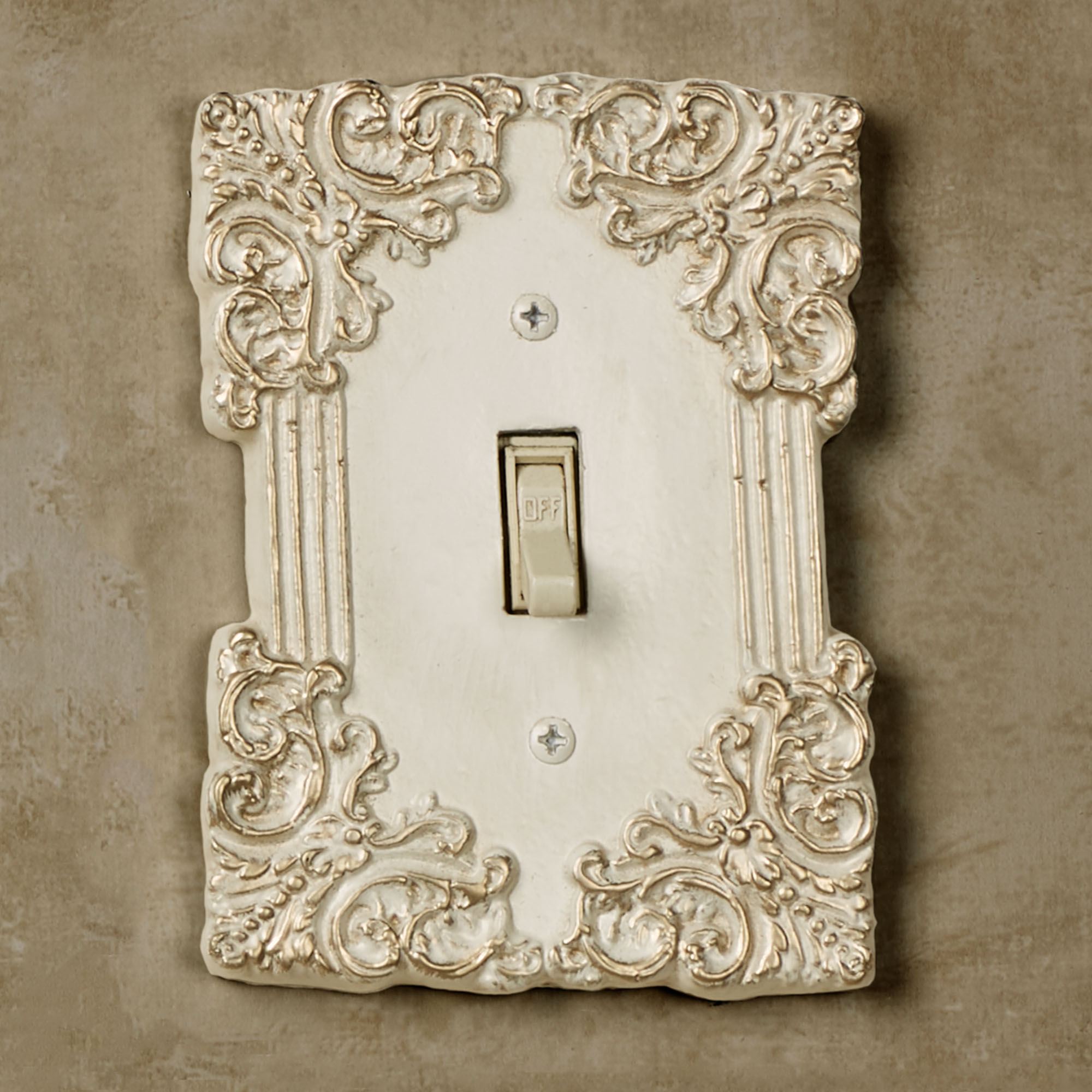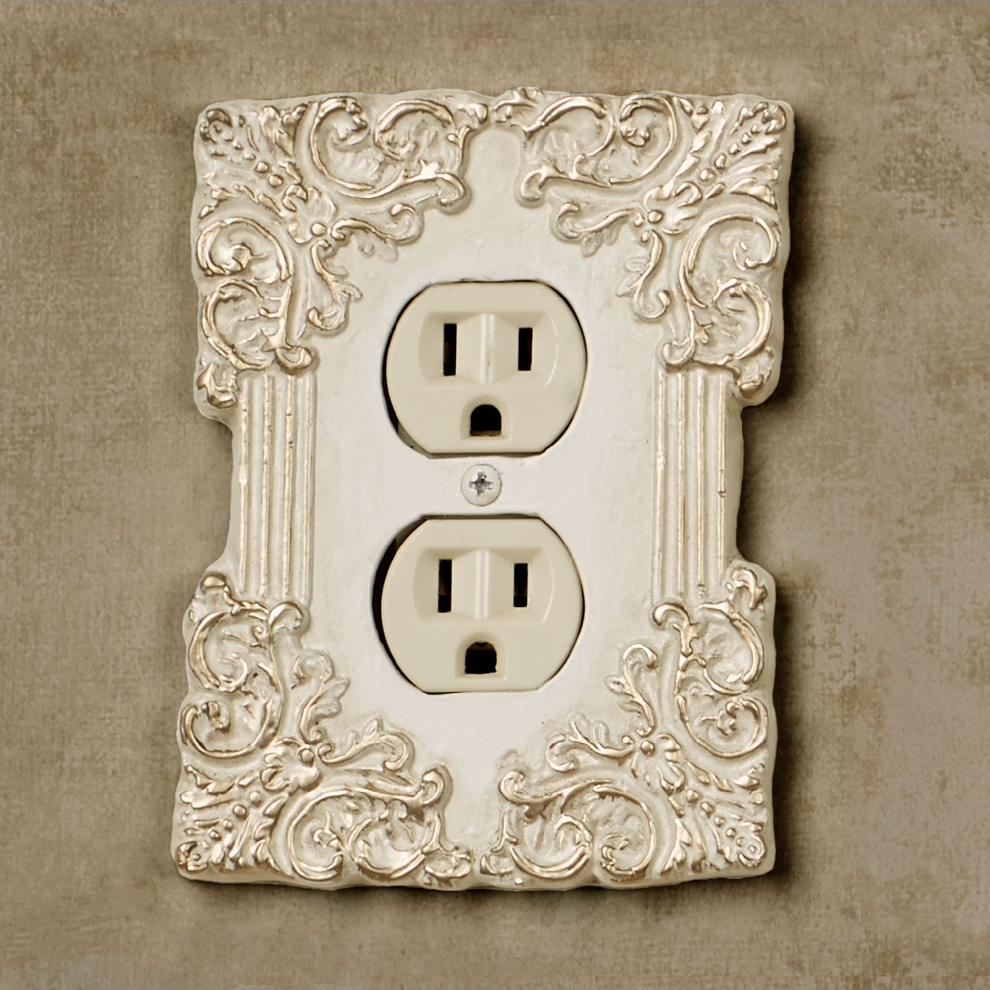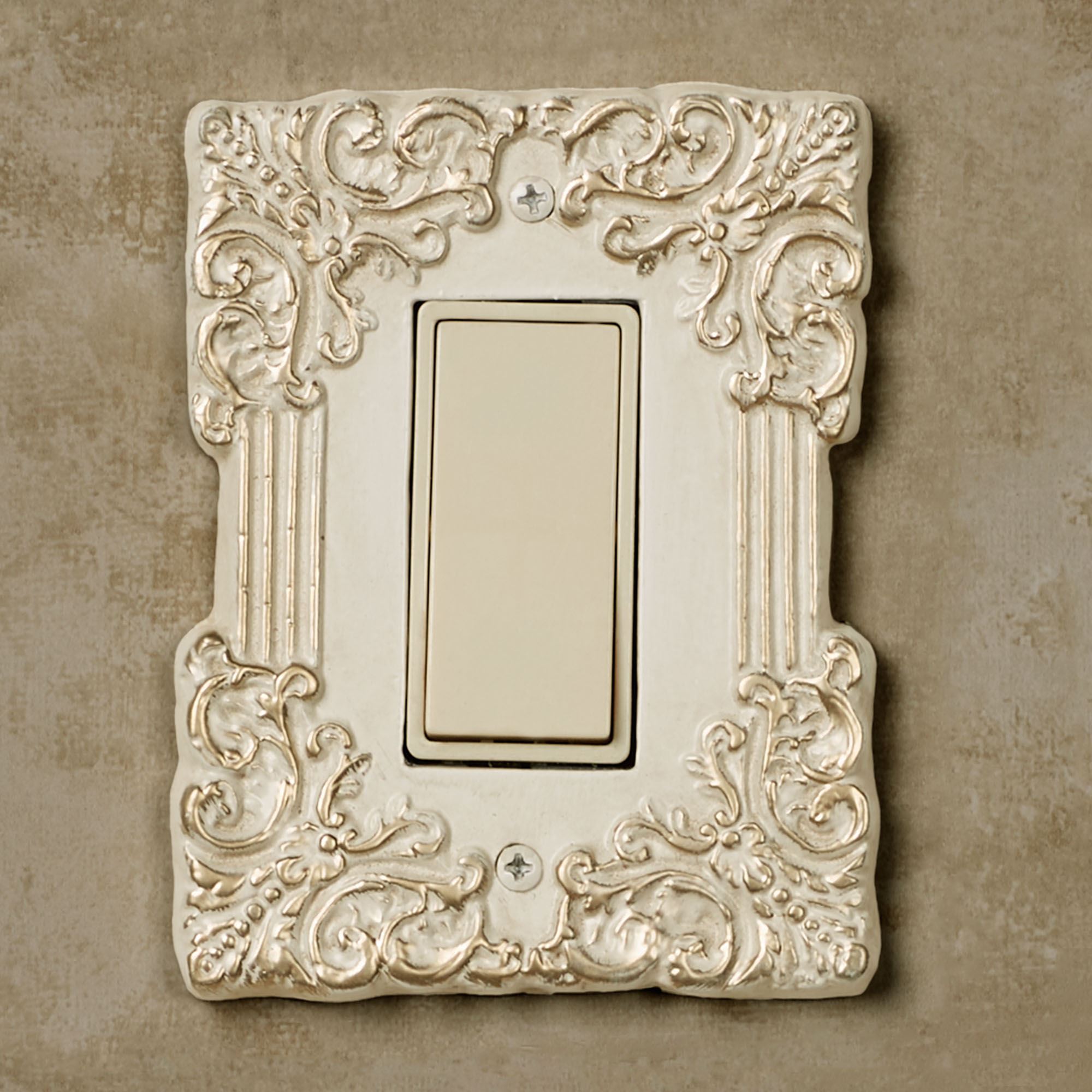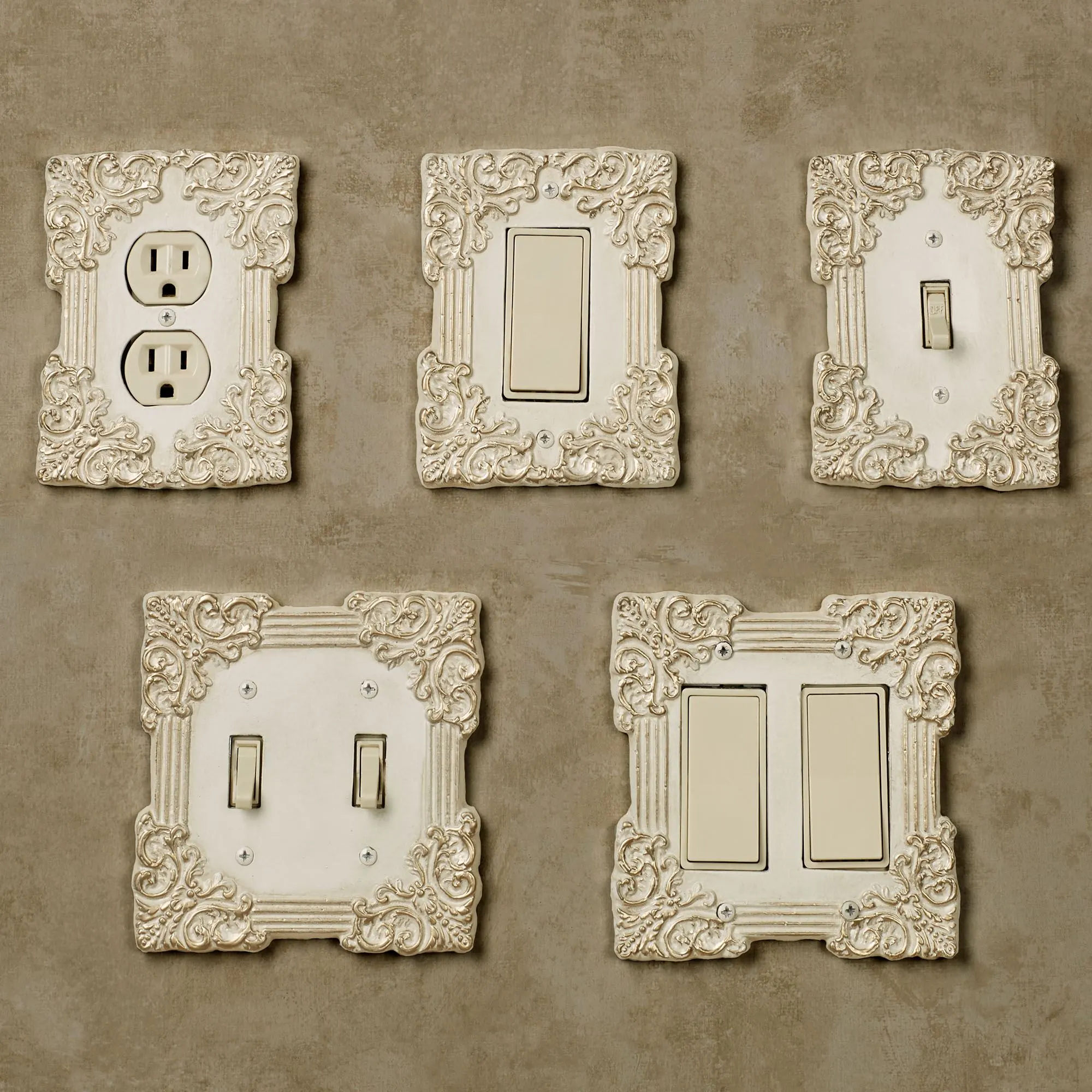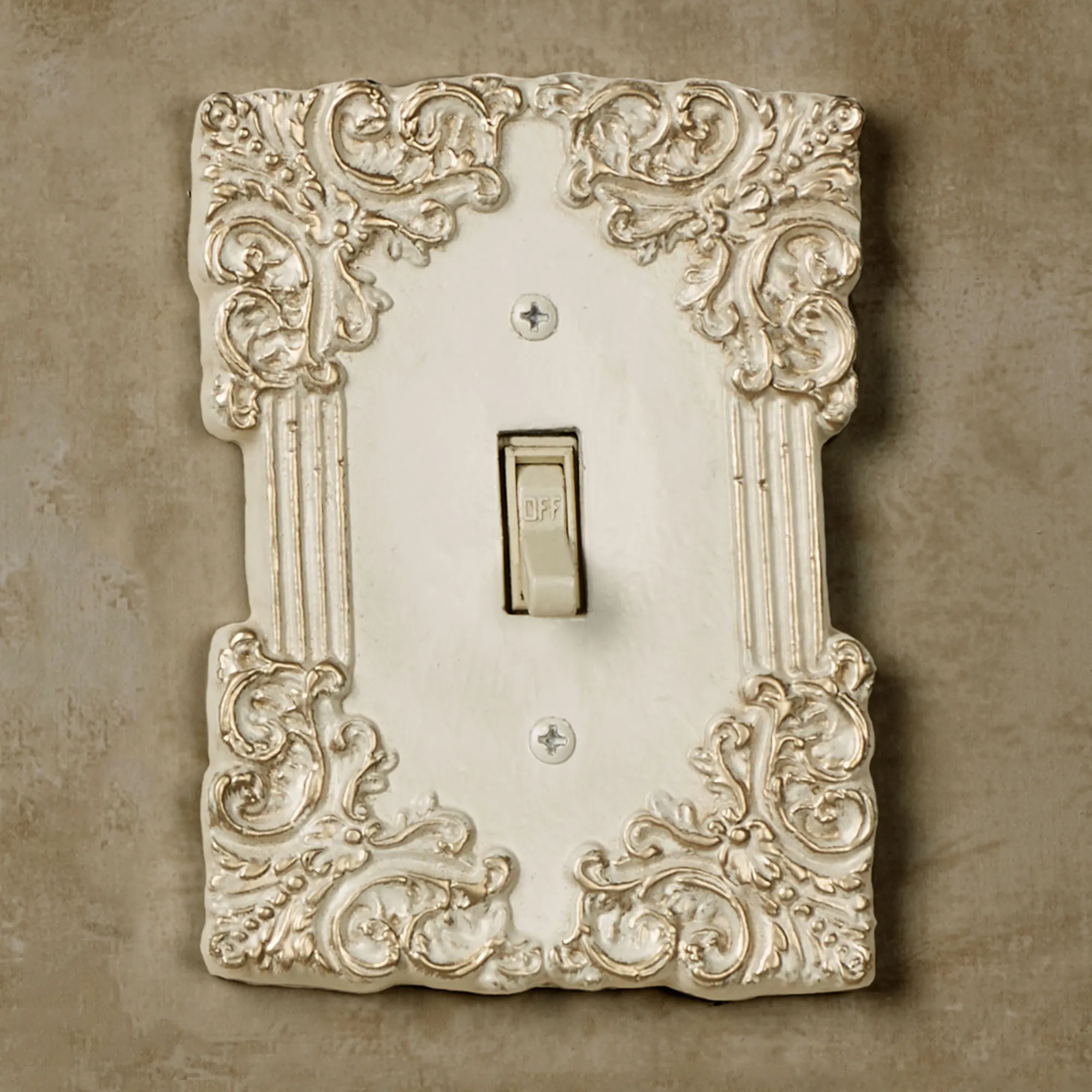 Sublime elegance details the Fleurista Switchplates. Hand-cast from aluminum, each hand-finished ivory/gold switchplate features defined borders adorned with filigree scrollwork corners. Each size measures 5"H. Single Switch, Single Outlet (two sockets), and Single Dimmer/Rocker are 4"W. Double Switch and Double Dimmer/Rocker are 5"W.