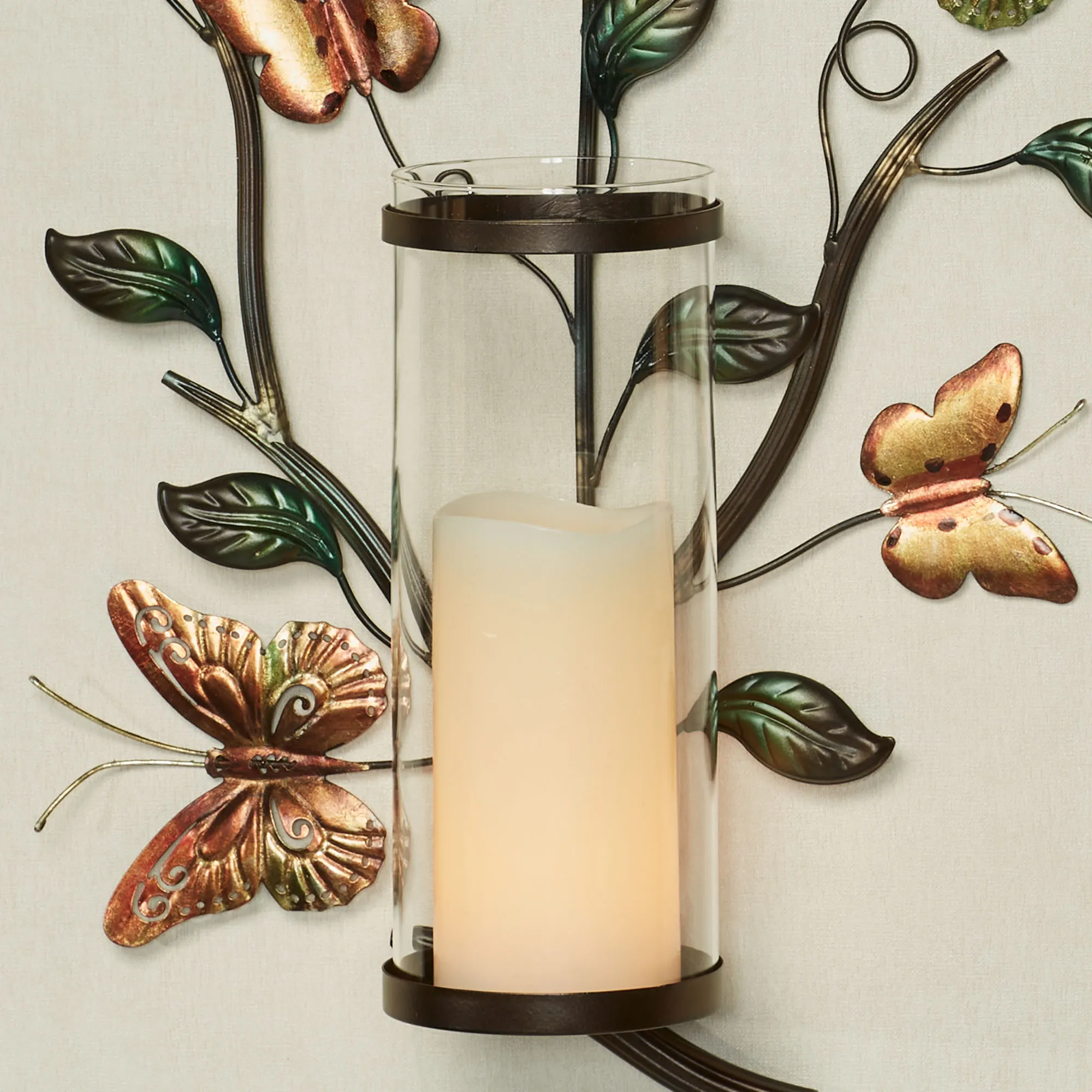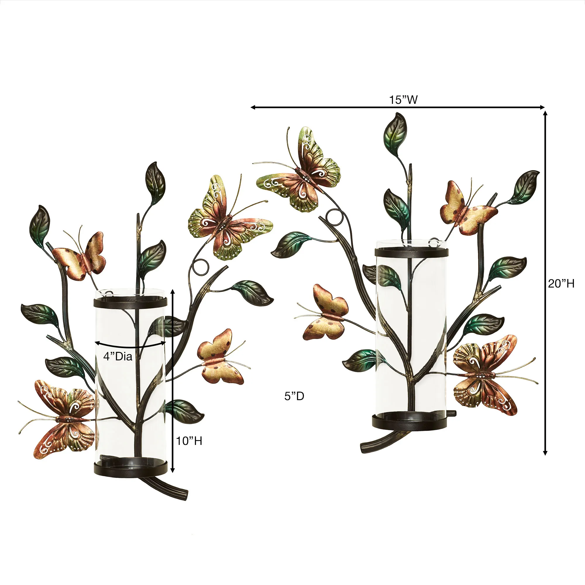 The Flight of the Butterfly charms this wall sconce set. Hand-finished in green, gold, and copper, the butterflies surround the bronze branch designs and green leaves. Each metal sconce holds your candle, up to 3" dia., inside the glass hurricane, 4"dia.x10"H. Each butterfly wall sconce measures 15"Wx5"Dx20"H.