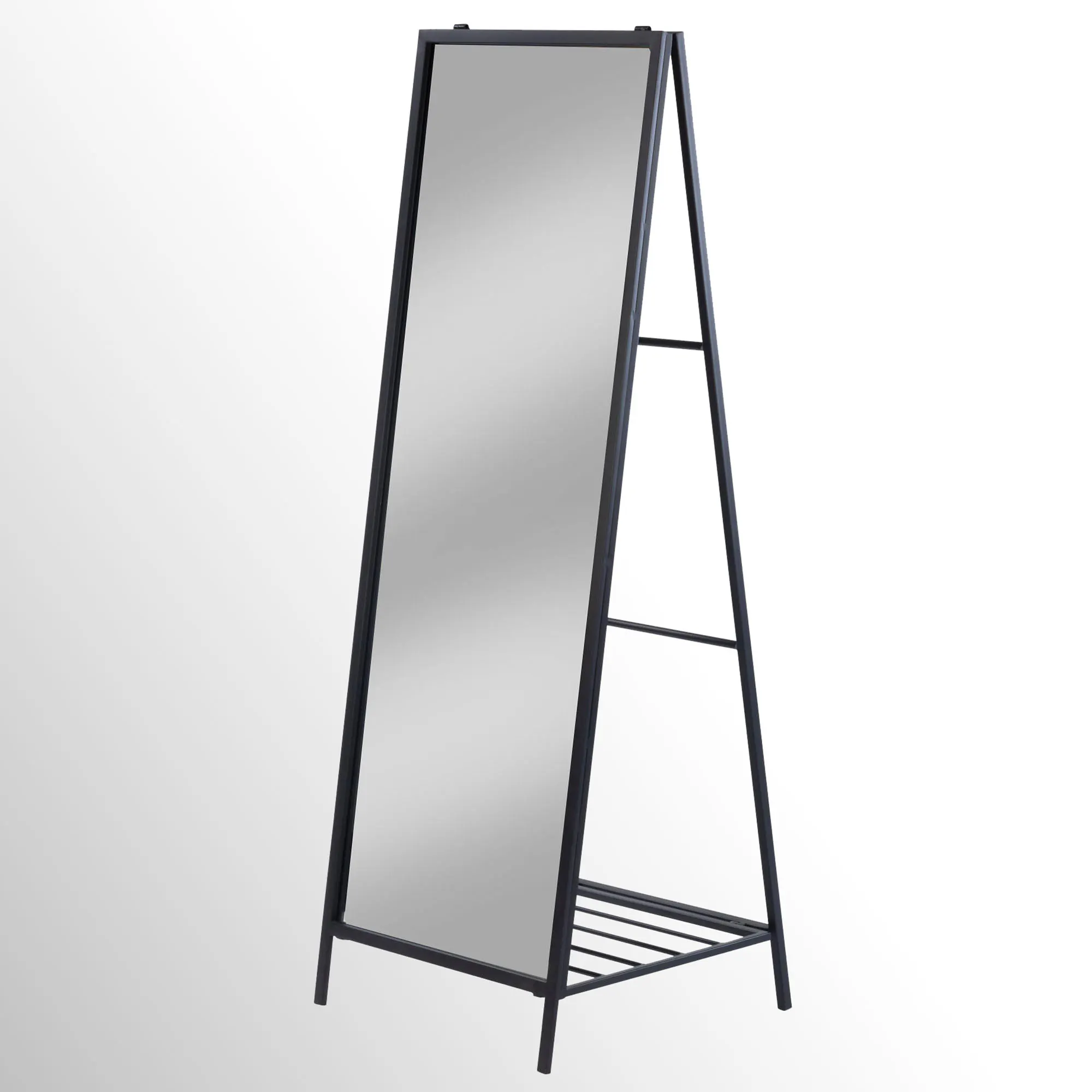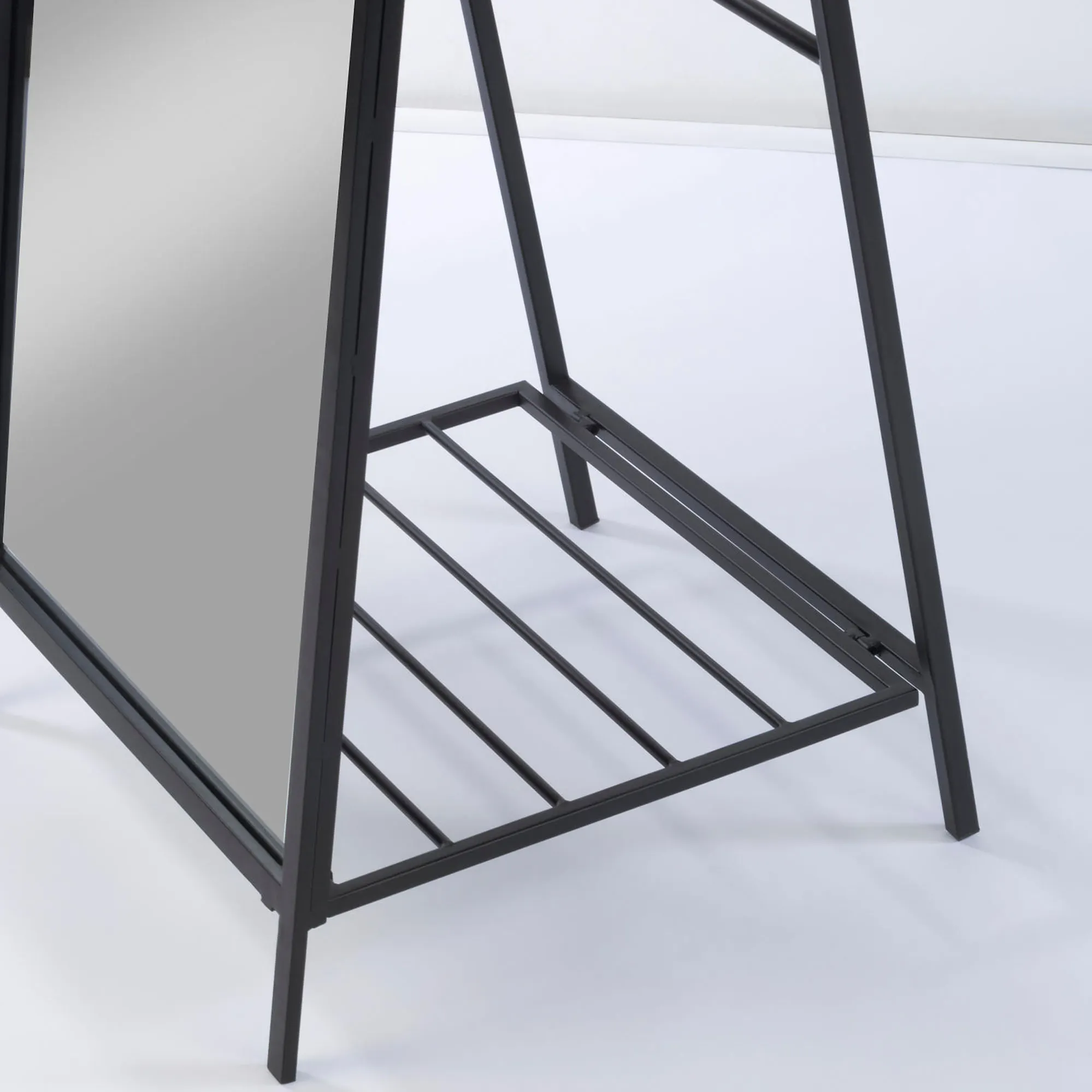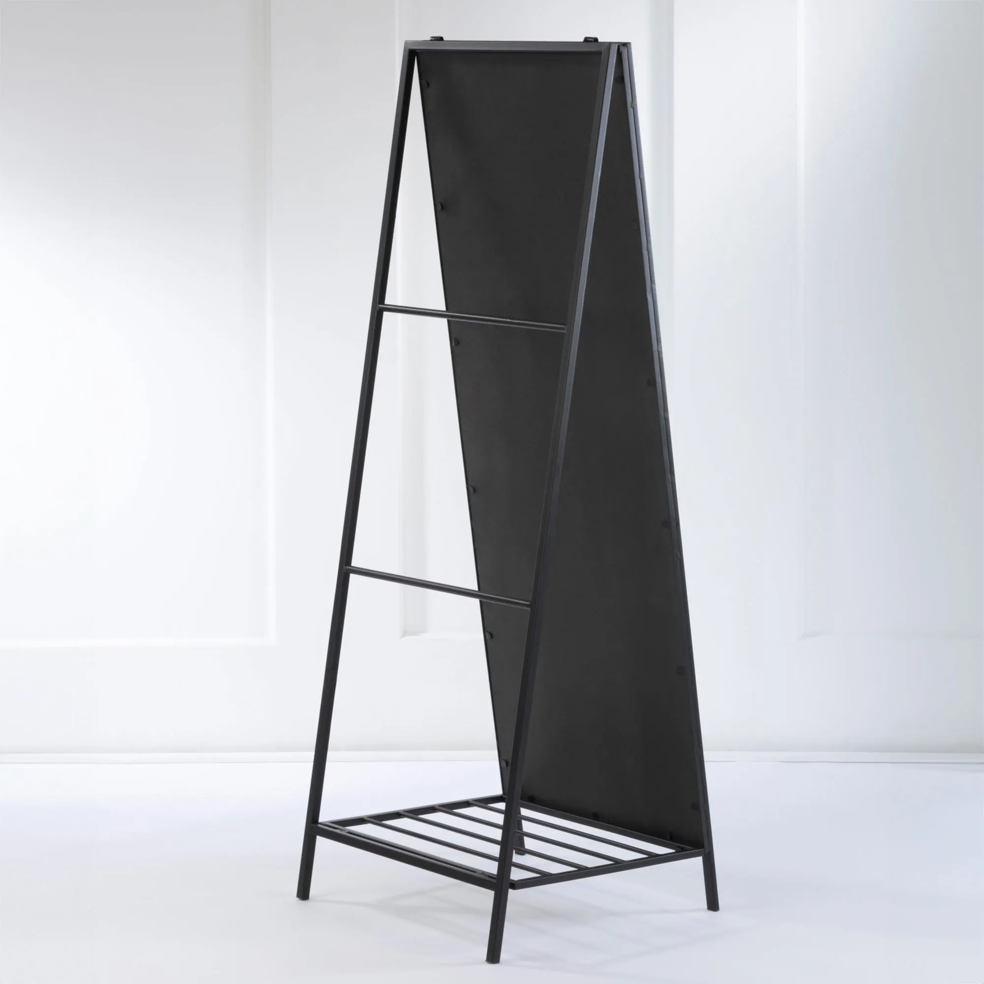 The full-length, rectangular Floor Mirror with Ladder Back decorates with modern style and functionality. Made of metal with a black powder-coat finish, this floor mirror has an easel back and two rods that are perfect to drape scarves, towels, or other accessories. It also has a small shelf at the bottom to hold shoes or small boxes. Measures 19"Wx19"Dx54.5"H; weighs 32 lbs.