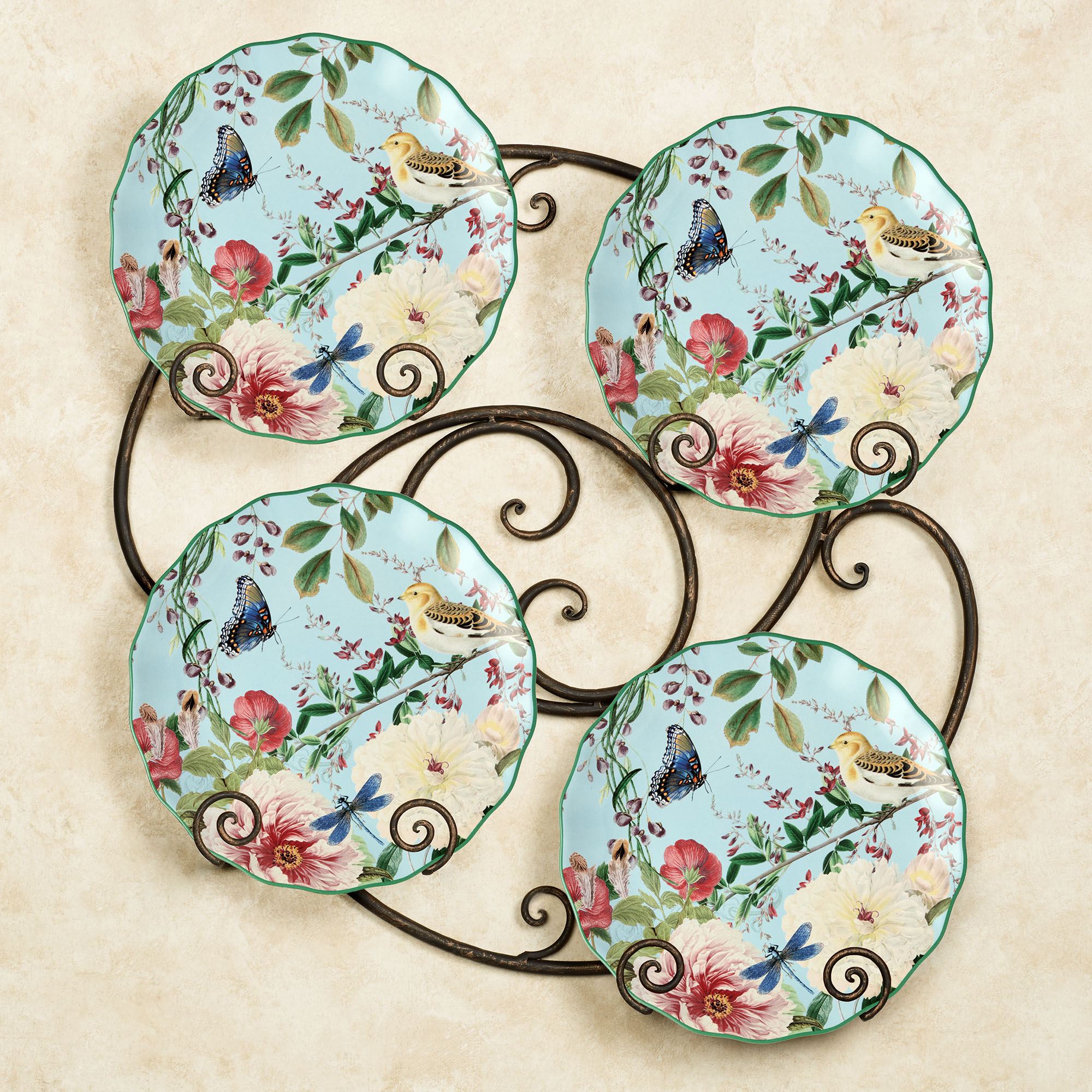Flora Bird Butterfly and Dragonfly Light Blue Ceramic Dinner Plate Set of 4
