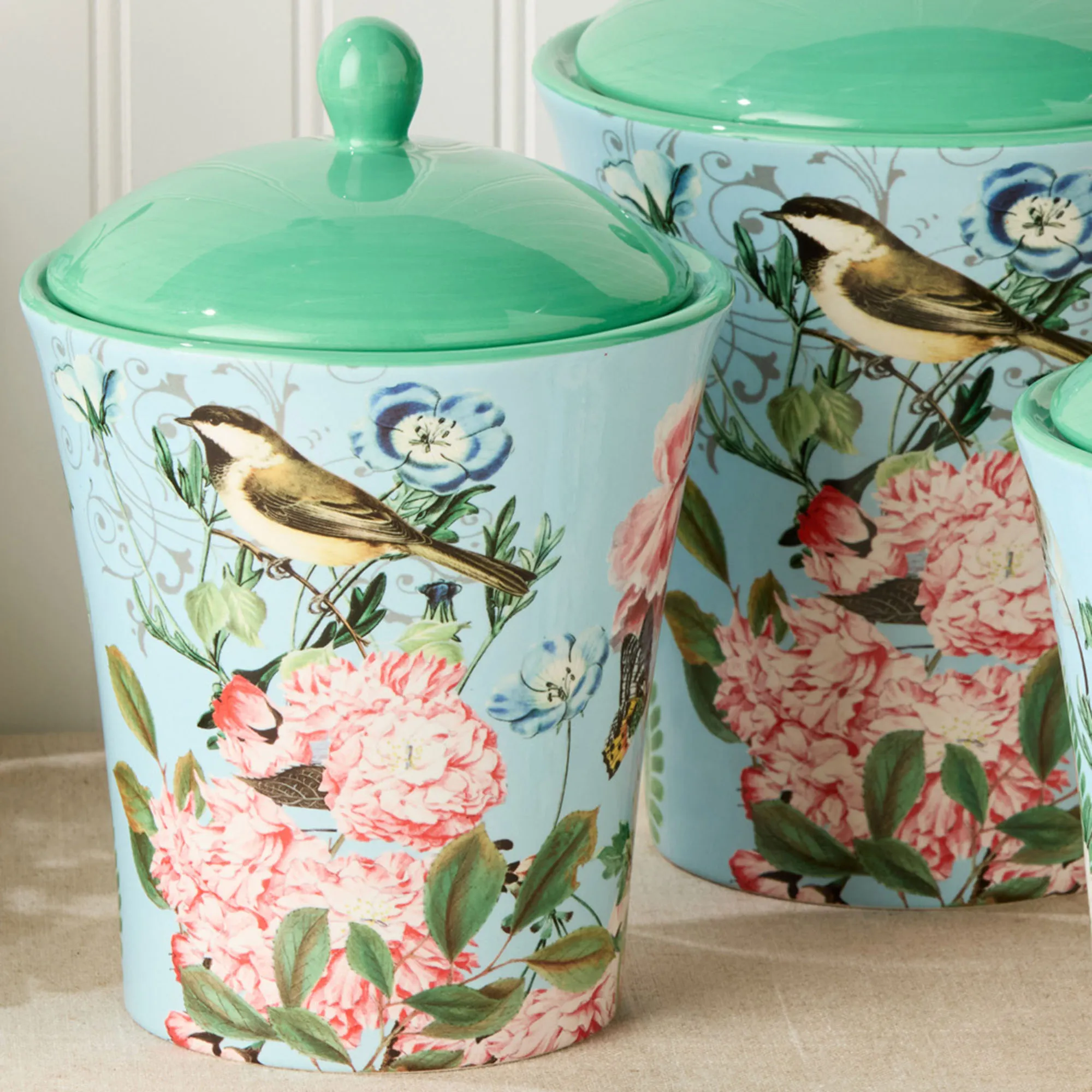 The Flora Kitchen Canister Set is ceramic with decal accents.