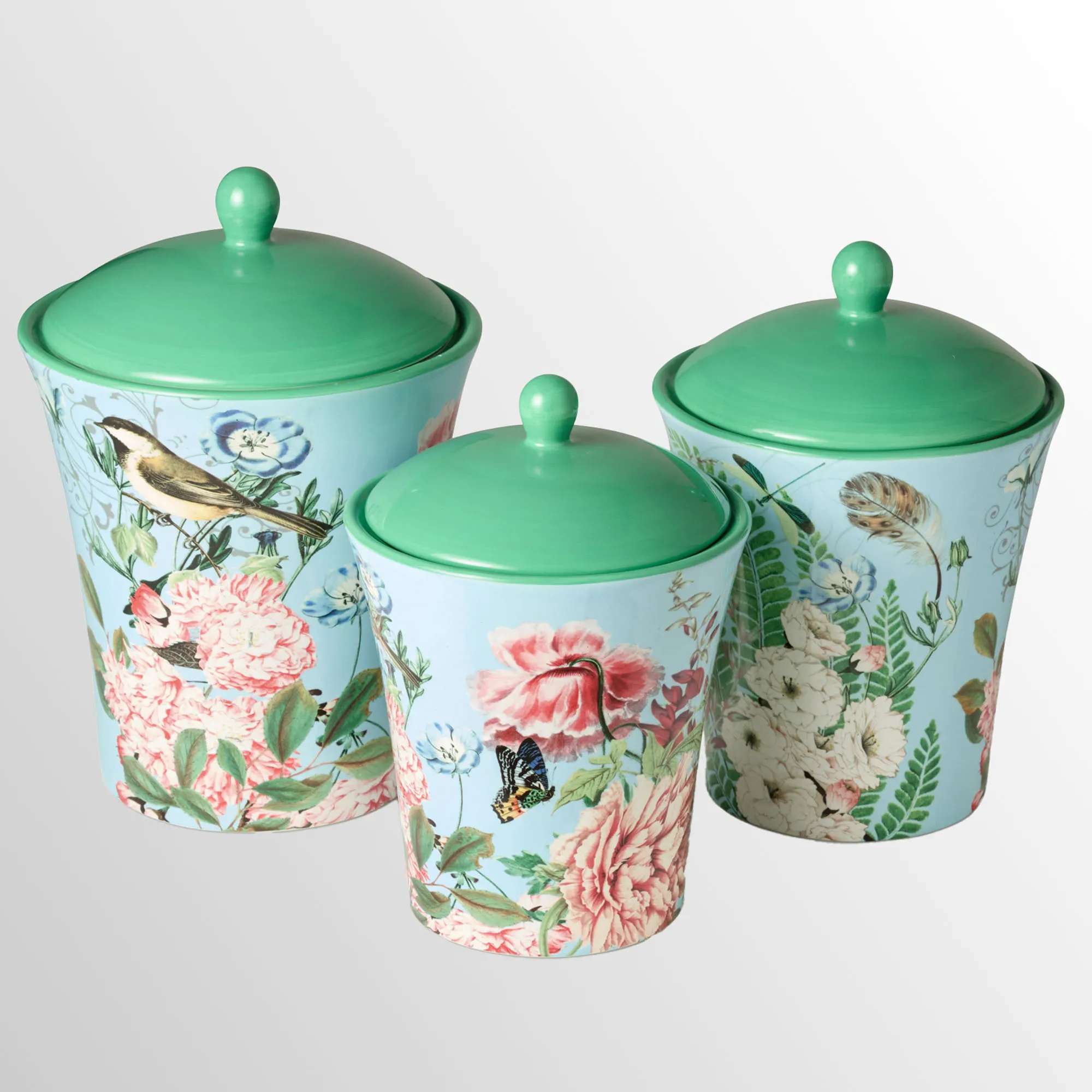 Flora Bird Butterfly and Dragonfly Airtight Ceramic Kitchen Canister Set of 3