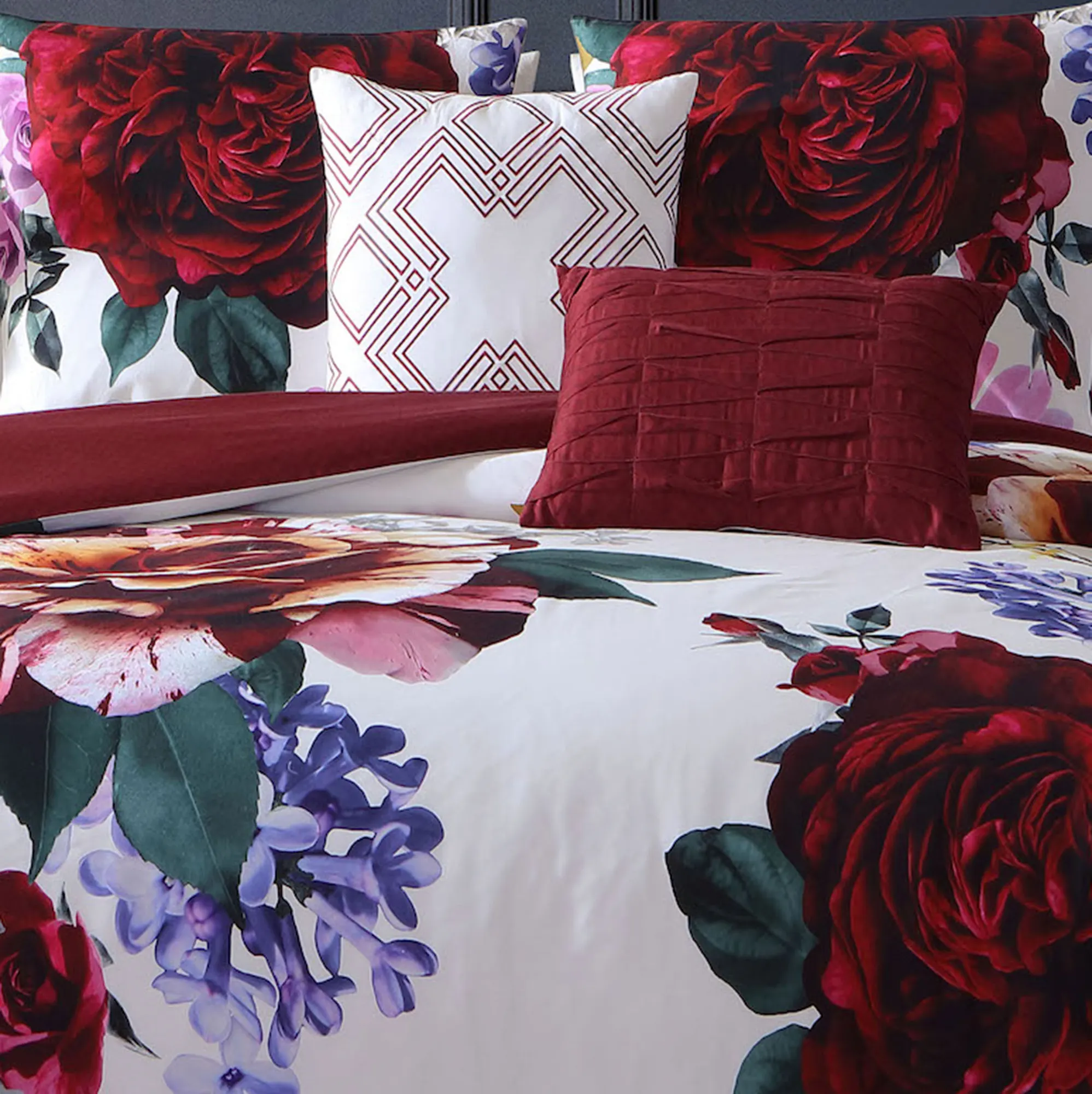 The Floral Bloom Bedding unfurls vibrant petals and a captivating beauty. The 5-piece Bed Set includes a comforter, 2 shams, and 2 accent pillows. Printed with overscale floral designs, the white cotton sateen comforter has striking shades of dark red, purple, gray, white, pink, green, and yellow. Oversized comforter has tailored edges and a dark red back with a diamond print. Click on the Details tab to read about the other items in the bed set. Bedding fill is polyester. Machine washable; spot clean the pillows. Imported.