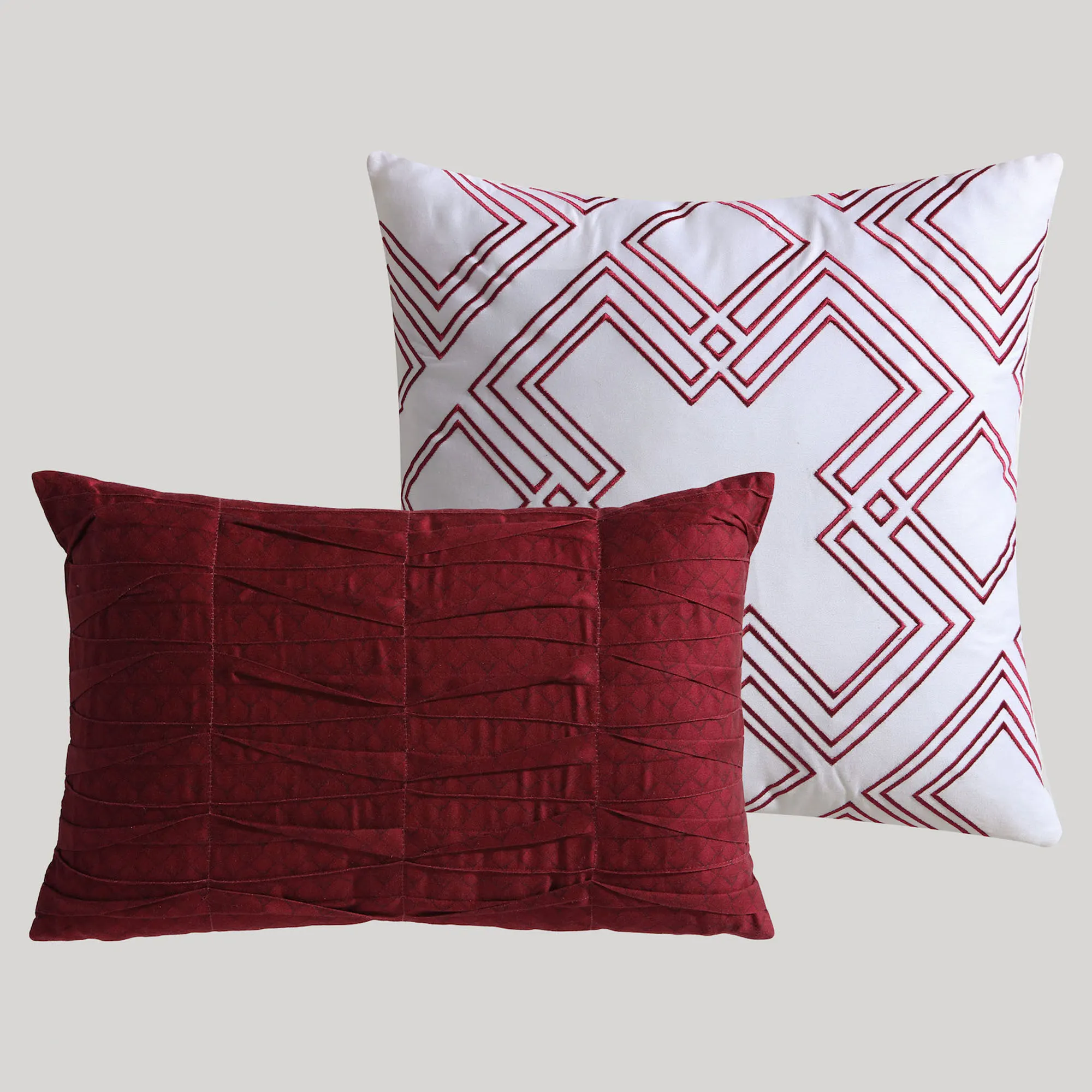 Square pillow is white with embroidered dark red geometrics. Rectangle pillow is dark red with inverted pleats and printed diamonds.