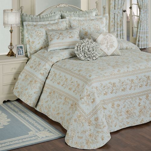 Display sweet beauty with the Floral Cottage Bedding. The Bedspread Set includes a grande bedspread and two shams. This polyester microfiber bedding features a beautiful toile print with butterflies, leaves, and flowers in colors of almond and ivory on pale blue. Oversized, tailored bedspread also has mini florals, vermicelli quilting, a 24" drop, and a printed stripe reverse. Bedding fill is polyester. Machine washable. Imported.