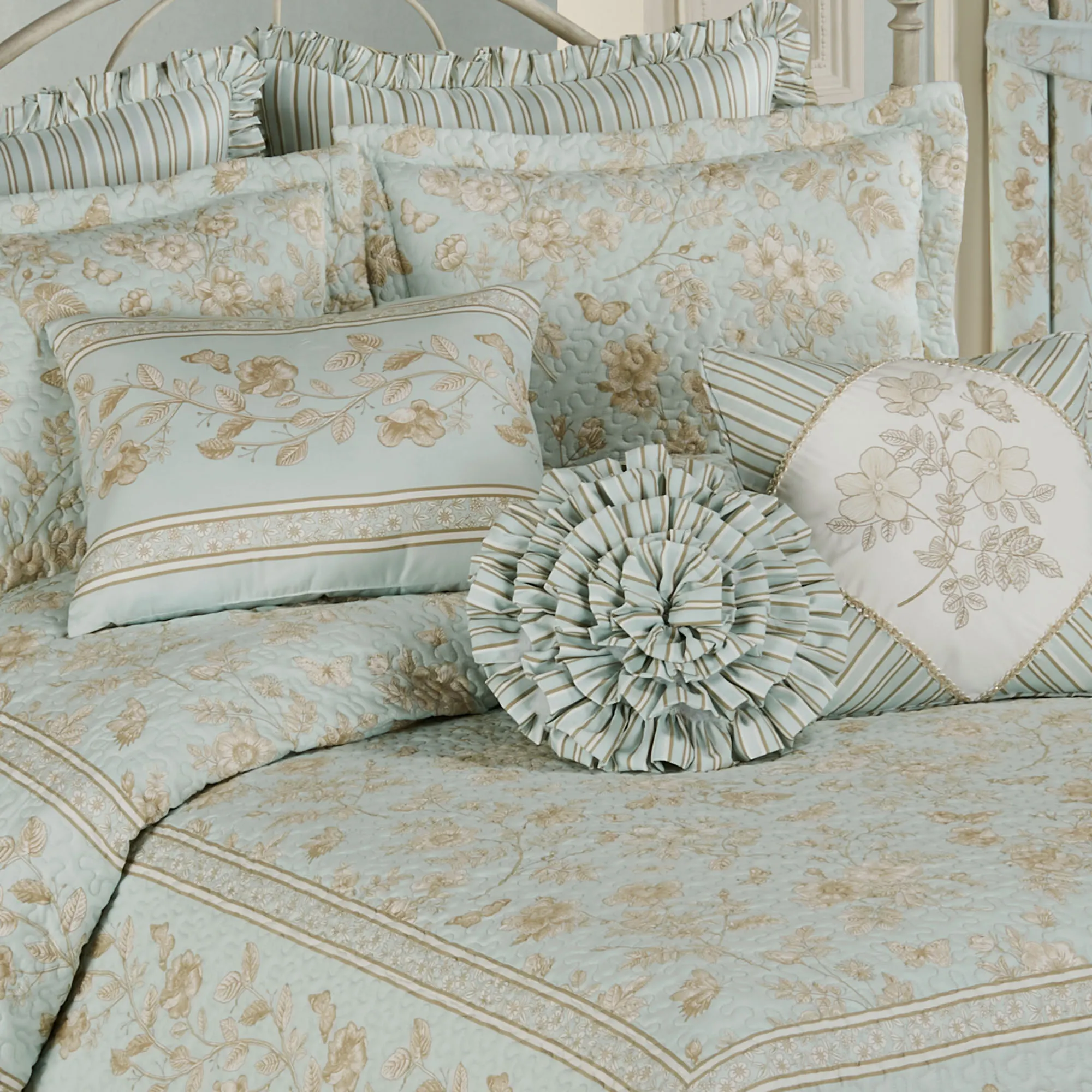 Pillows: Spot clean. The tailored, reversible Rectangle has the toile print and mini florals. The piped Square has embroidered florals on ivory, stripes, and gimp trim; reverses to stripes. Round has layered ruffles with stripes and a tufted center.