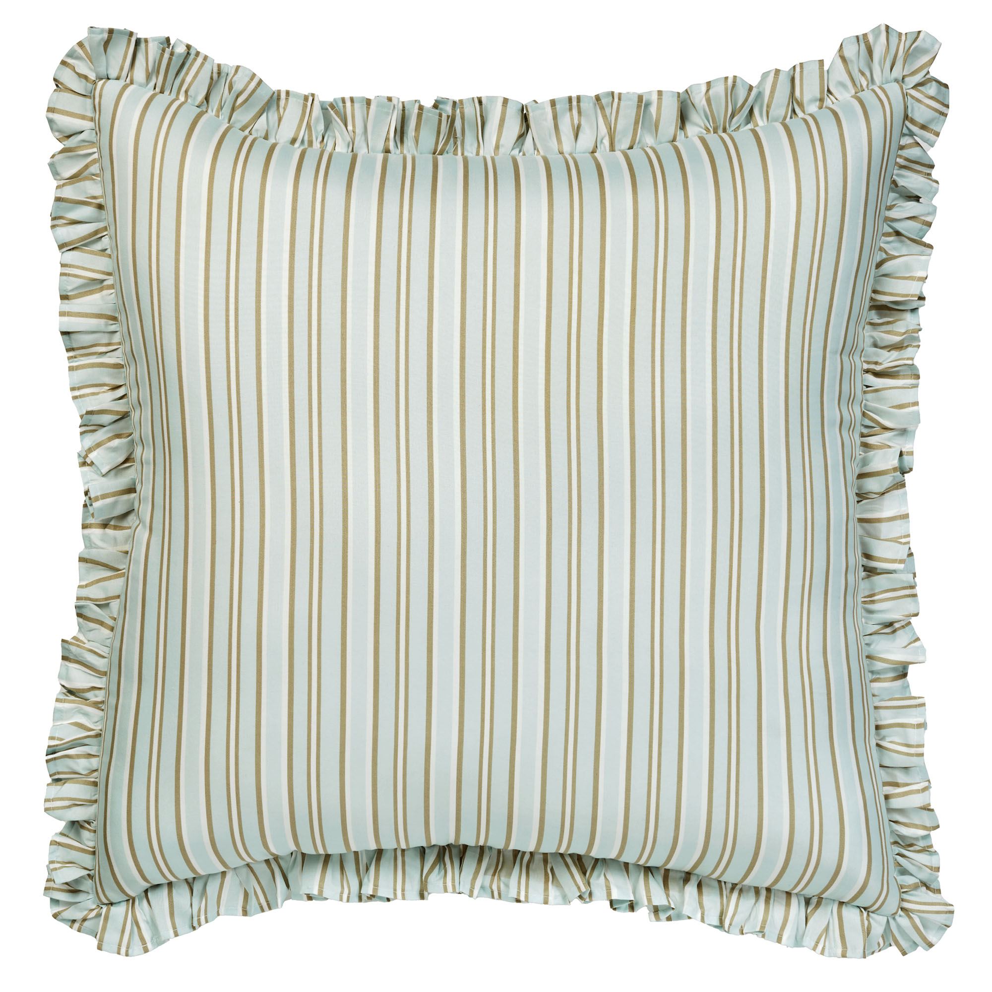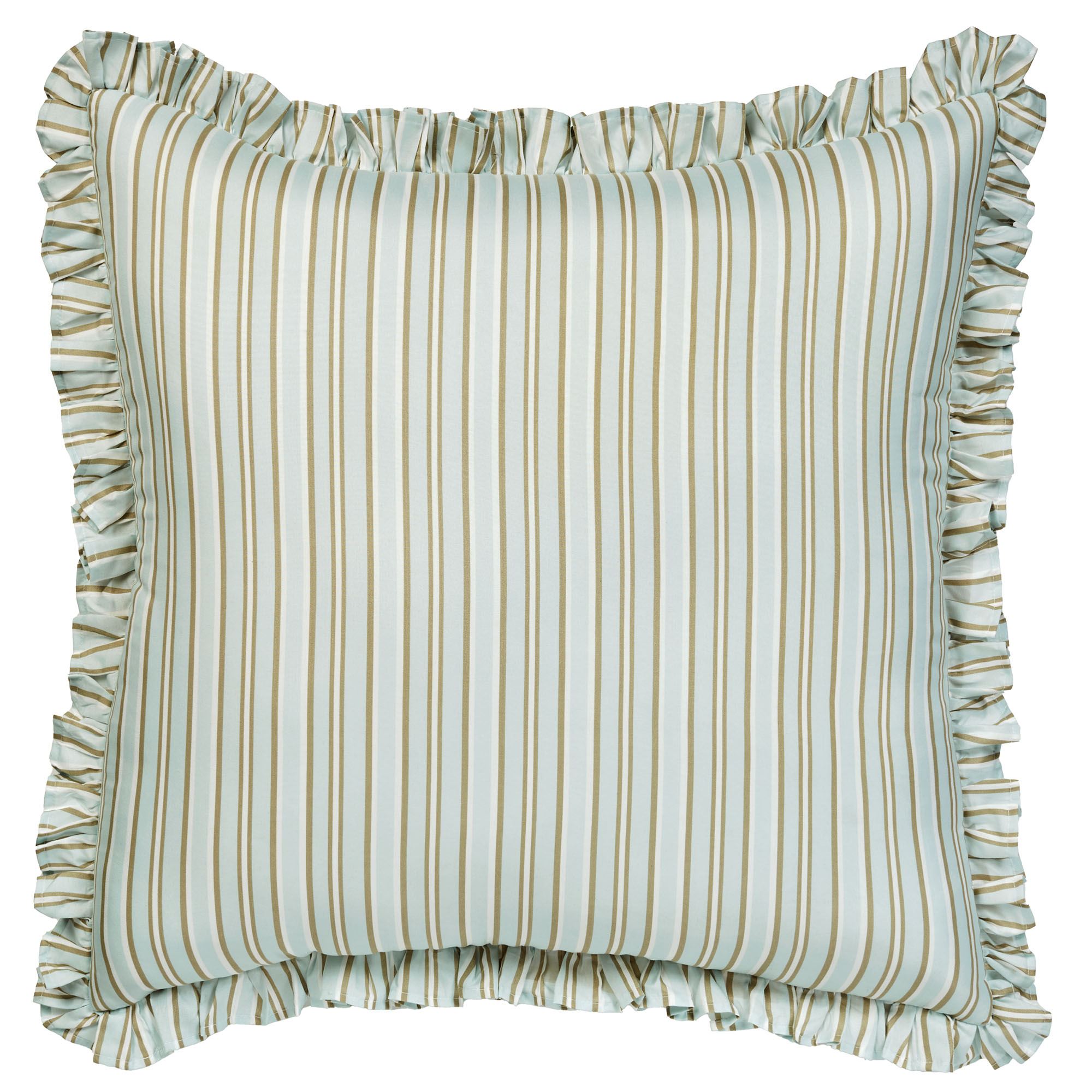 The padded European Sham has printed stripes, a ruffled flange, and a French back closure.