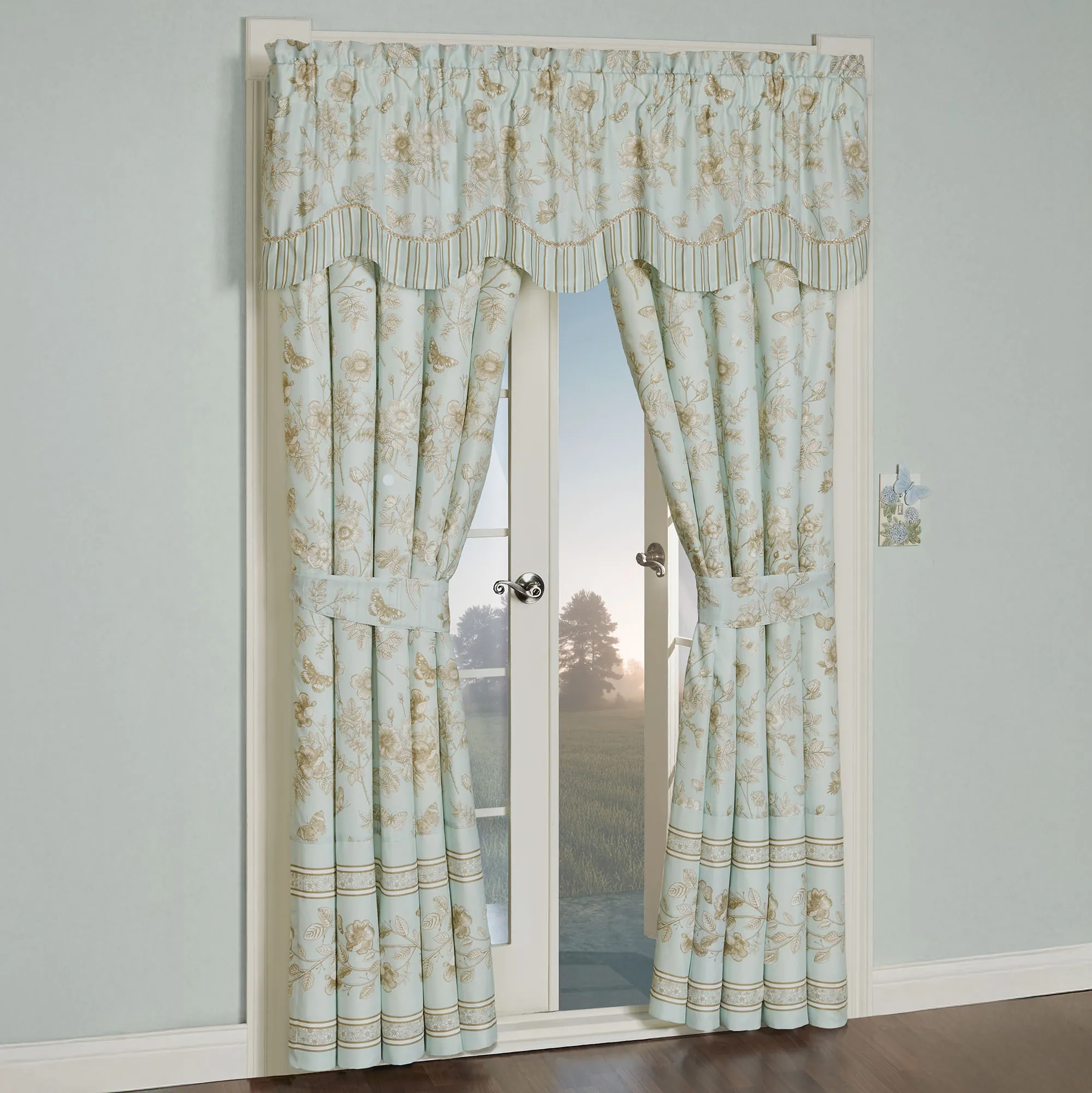 Fluttering butterflies, leaves, and delicate flower designs display sweet beauty and grand elegance on the Floral Cottage Window Treatment. This polyester microfiber window treatment features a beautiful toile print and includes colors of almond, ivory, and pale blue. Lined window treatment has 3" rod pockets. Specify Scalloped Valance or Curtain Pair. Scalloped Valance also has stripes, gimp trim, and a scalloped bottom edge. Tailored Curtain Pair also has mini florals. Reversible tiebacks are included. Machine washable. Imported. The curtain pair width is the total width of two panels together.