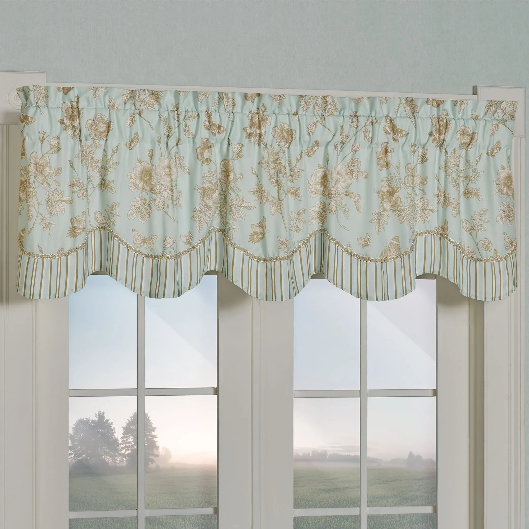 Floral Cottage Butterfly Flower Toile Pale Blue Scalloped Valance Window Treatment