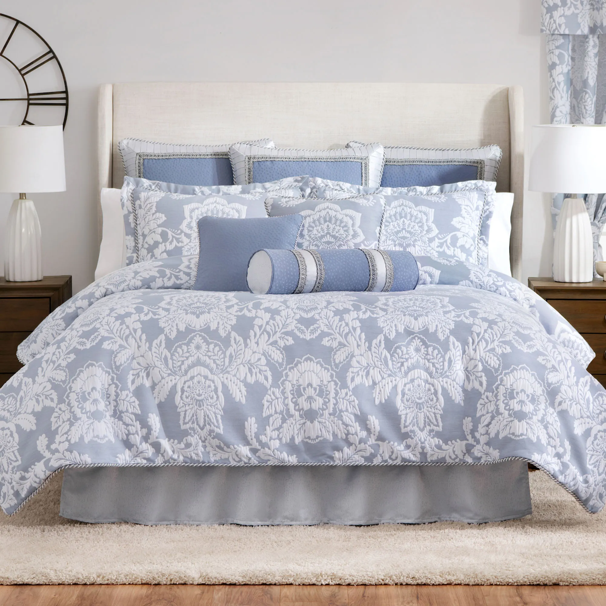 Floral Damask designs decorate any sleeping space with sweet style. This charming, polyester ensemble, from Rose Tree, features a woven floral design. Colors include white and celestial blue.
