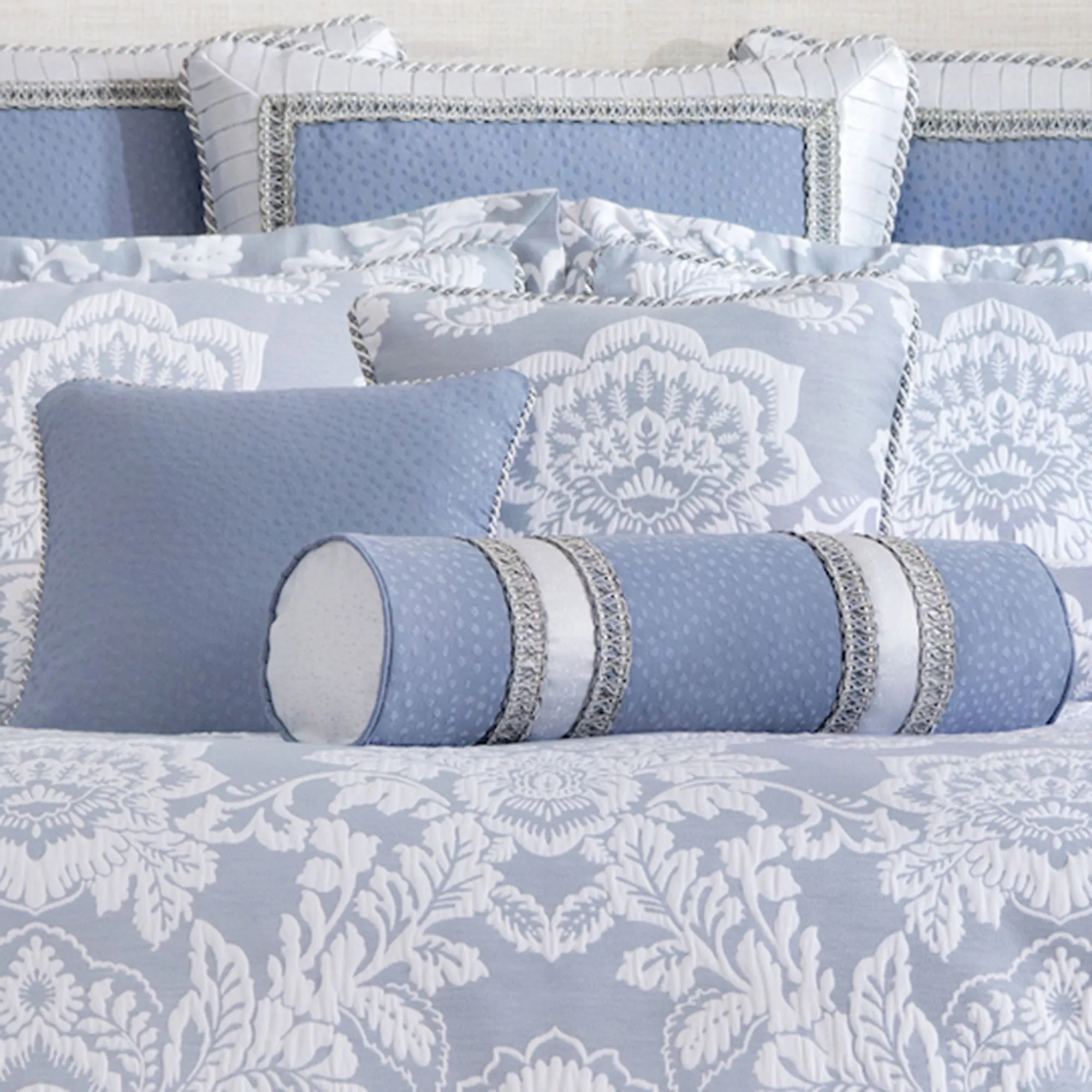 Pillows have zipper closures. Spot clean. The 18" Square has a woven floral design and twist cording; reverses to textured platinum. The 16" Square is periwinkle blue with woven dots and twist cording; reverses to textured platinum. The periwinkle blue Neckroll has woven dots, textured platinum bands, gimp trim, piping, and solid platinum ends.