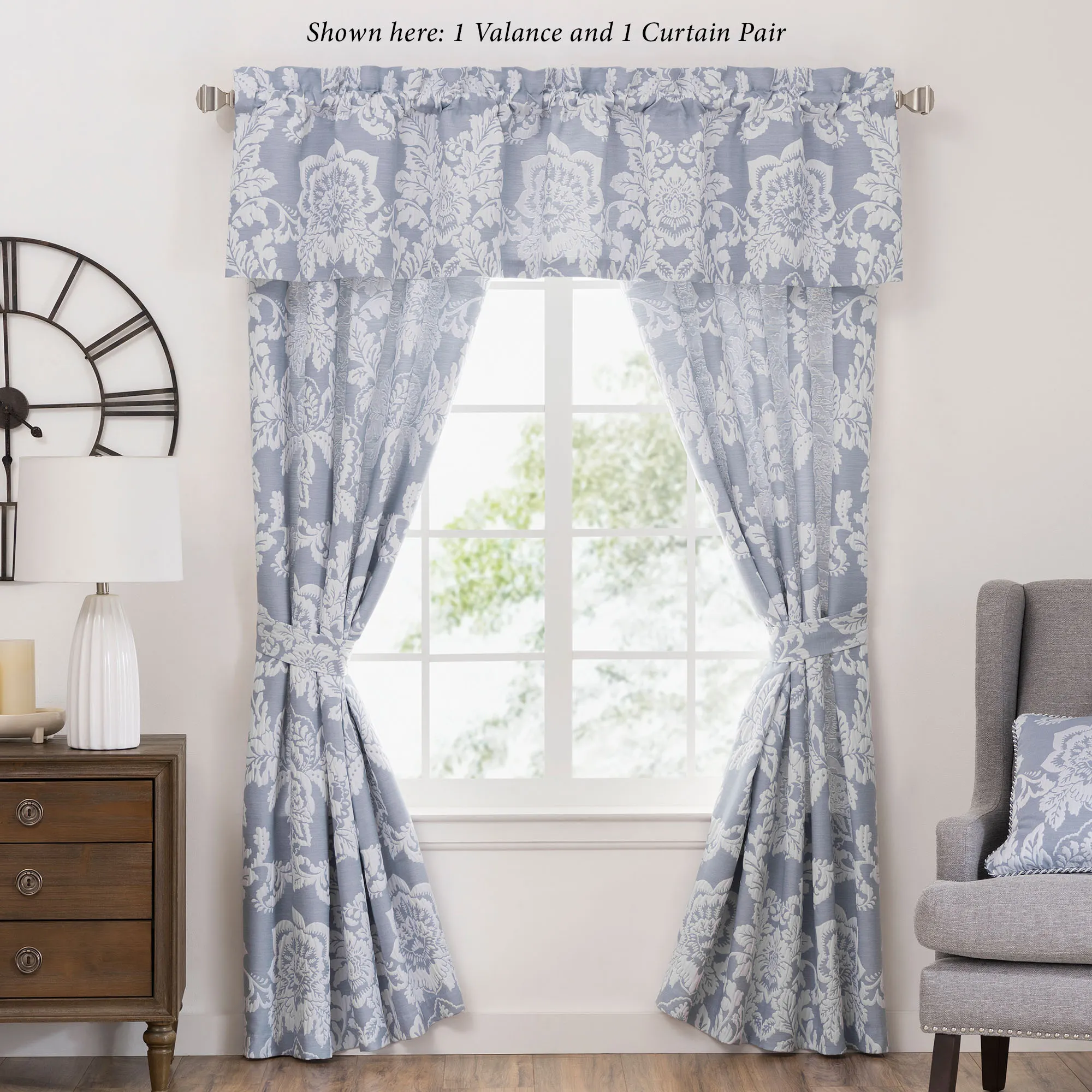 Tailored, lined Window Treatments have woven floral designs and 3" rod pockets. Wide Curtain Pair includes tiebacks. Valance is also available.