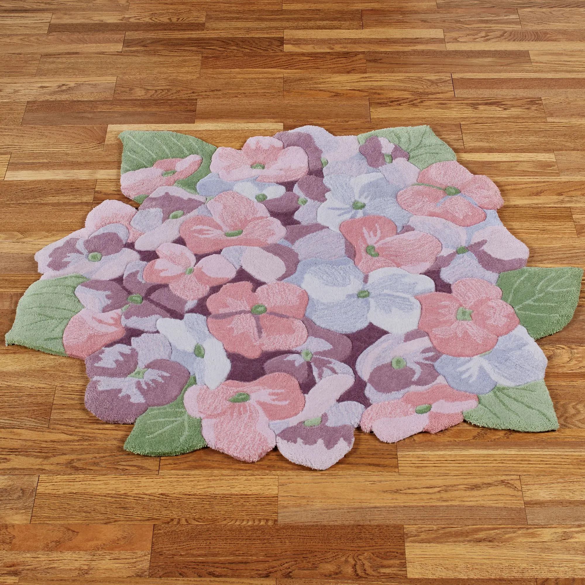 The pretty hydrangea blossoms on this flower-shaped rug are artfully arranged as if they were performing a sweet Floral Dance. This hand-tufted and handcarved polyester rug, .5" thick, includes shades of watercress green, mistletoe green, wild rose, and Persian violet. Edges are shaped. Backing is cloth-covered latex. We recommend professional cleaning by a rug cleaner. Imported.