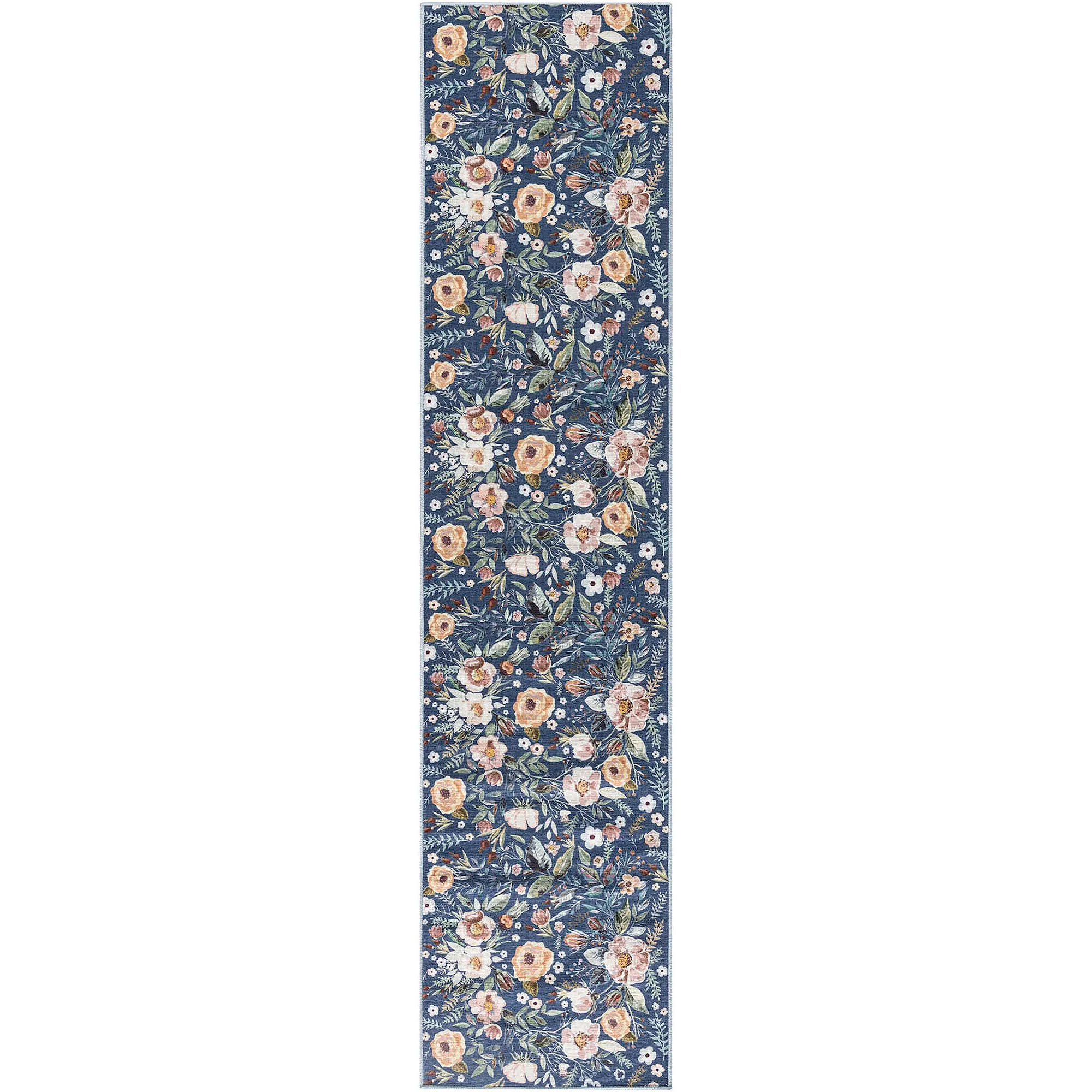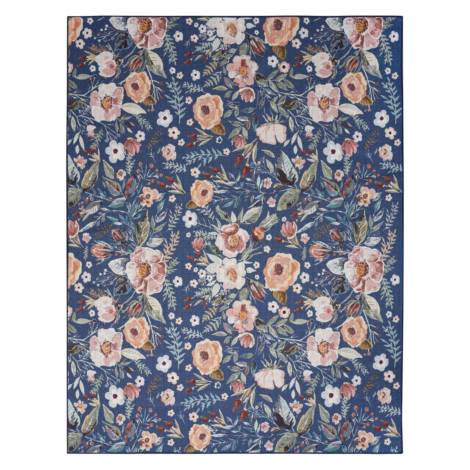Transform your space into a Floral Haven with this washable rug. Power-loomed from a polyester/cotton blend, the .25" thick rug features a beautiful array of scattered flower blossoms, buds, and leaves. The navy coloration has white, green, light blue, rose, salmon, and ivory tones. Backing is a nonslip recycled cotton. Indoor use only. Machine washable; follow the manufacturer's directions. Imported.