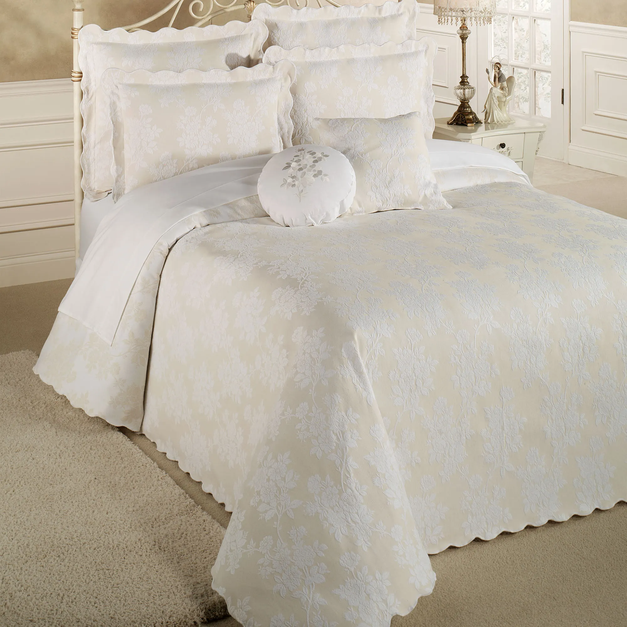 CLOSEOUT PRICES! Create a classy look in your bedroom with the cotton/polyester Floral Medley Matelasse Bedding. Reversible, woven matelasse Grande Oversized Bedspread has a white vining floral design on a solid color. Bedspread reverses to solid color floral designs on white. Three sides have scalloped edges. Dry clean.