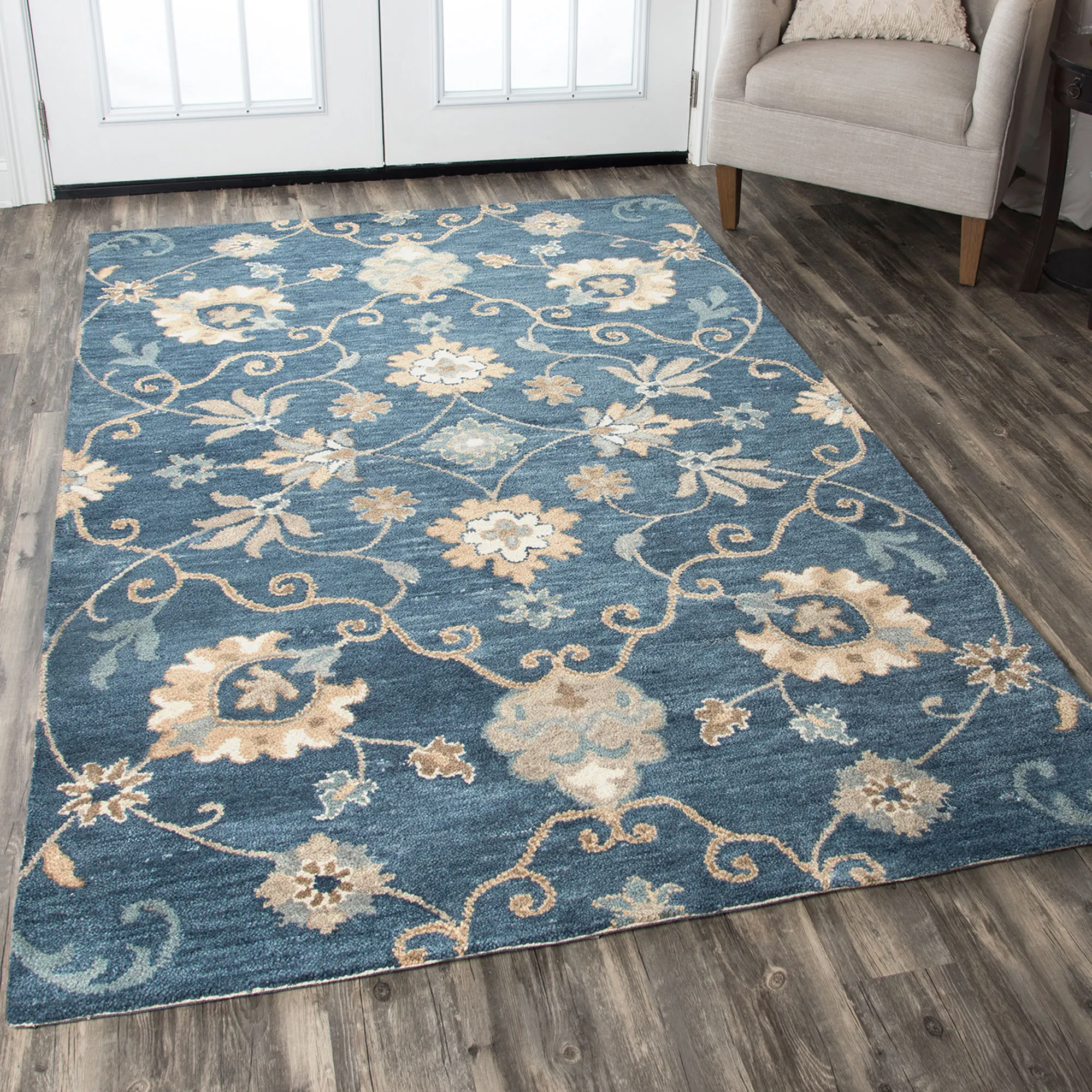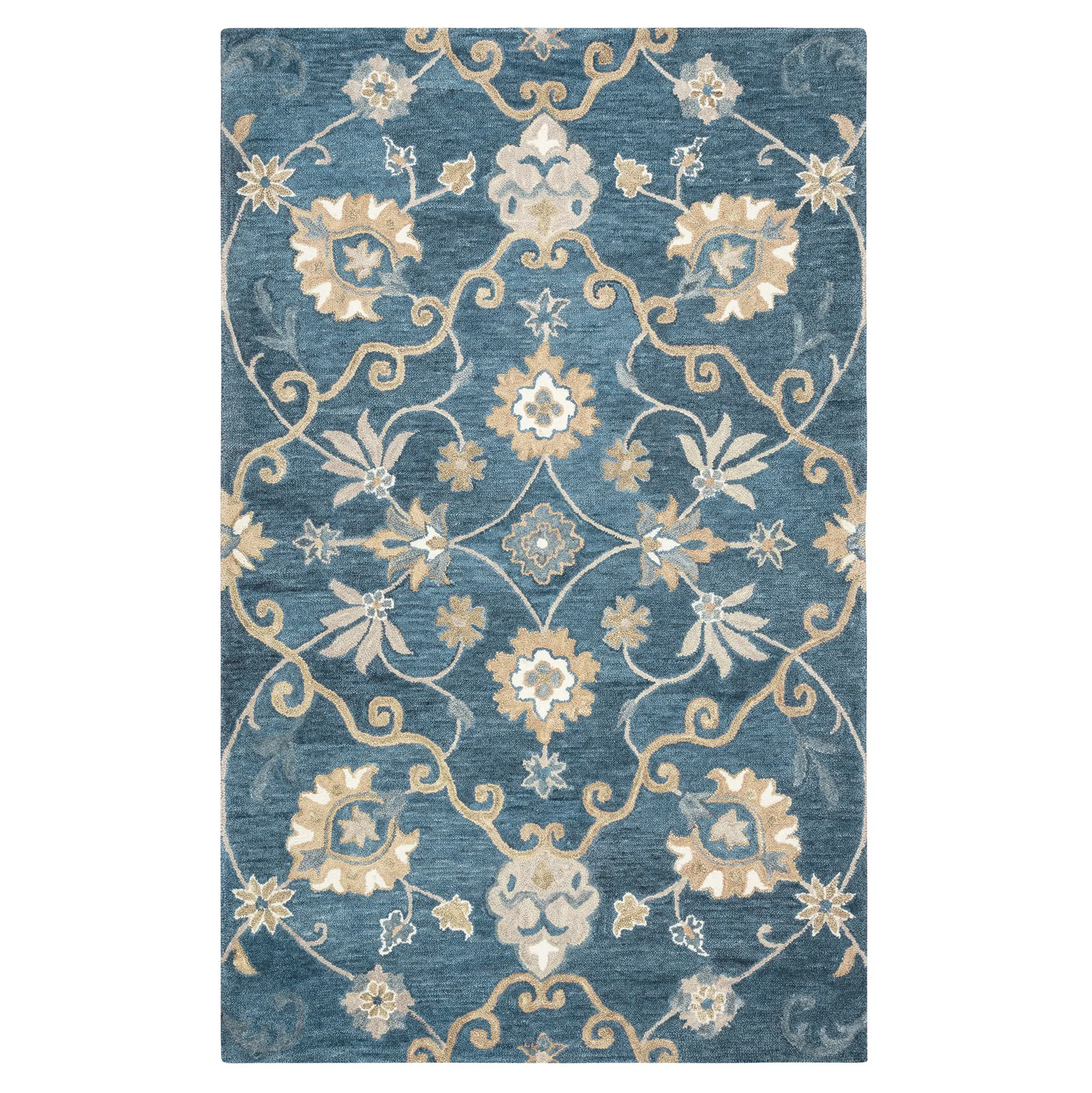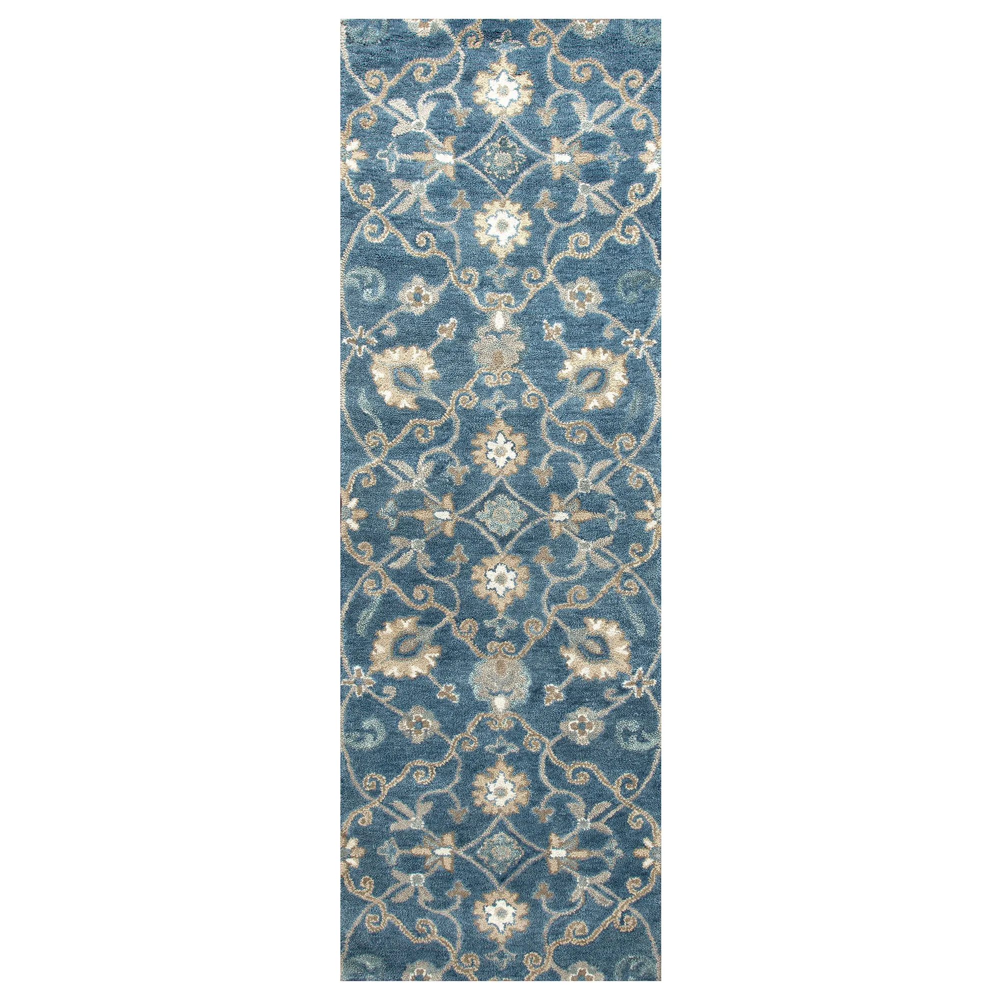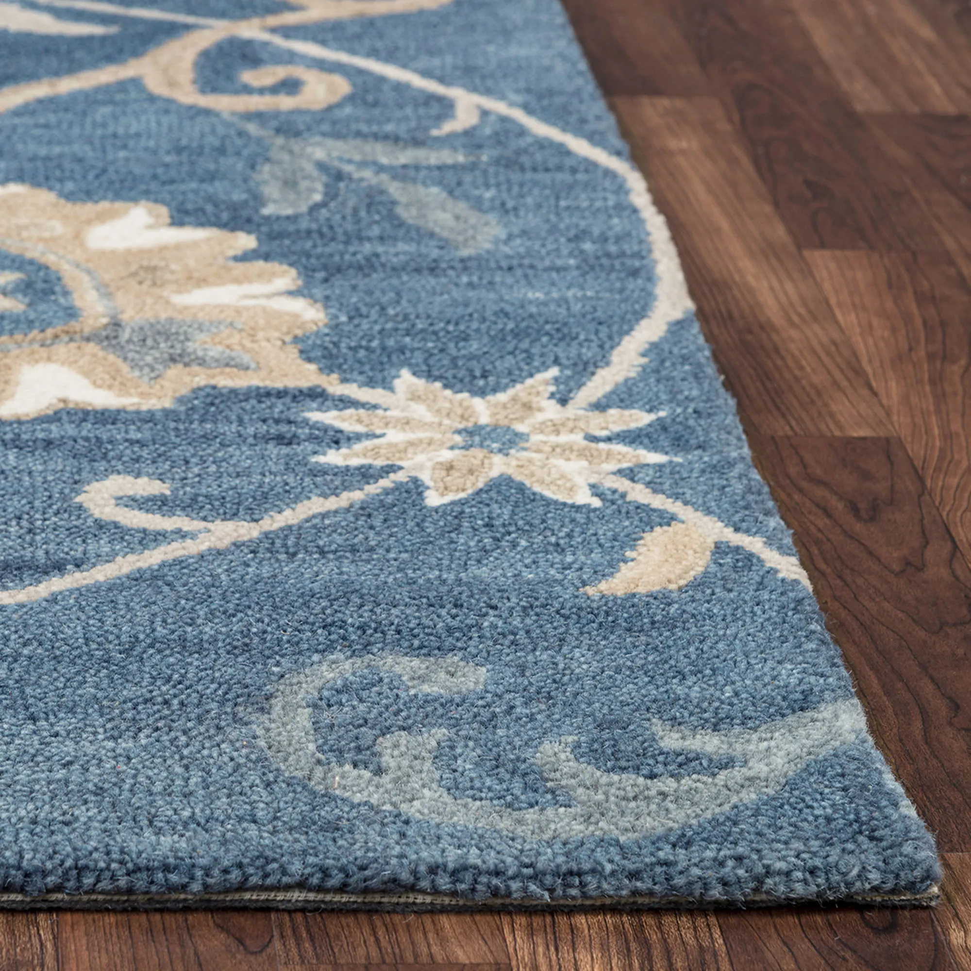 Handcrafted mastery details the Floral Motif Area Rug to create a beautifully timeless style. Hand-washed and hand-serged, the .6" thick hand-tufted rug features hand-spun and hand-dyed natural wool created by artisans. The ivory, beige, gray, and indigo blue color palette fills the classic Jacobean floral, leaf, and winding vine designs with inviting charm. Backing is cotton canvas. We recommend professional cleaning by a rug cleaner. Imported.