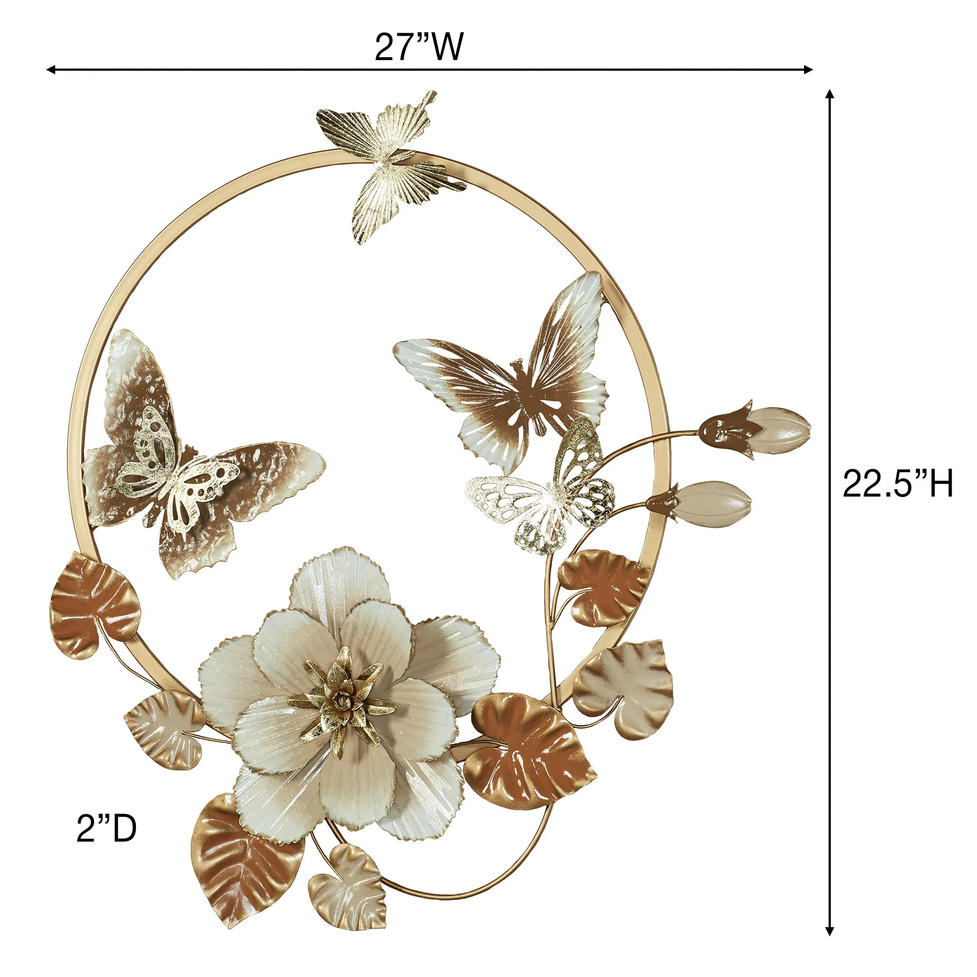 Display the elegance and grace of nature with the charming Floral Nouveau Wall Art. This hand-finished metal wall art features a vining floral, leaf, and butterfly design and an openwork circular border. Colors include shades of ivory, blush, burnt copper, autumn copper, and gold. Measures 27"Wx2"Dx22.5"H.