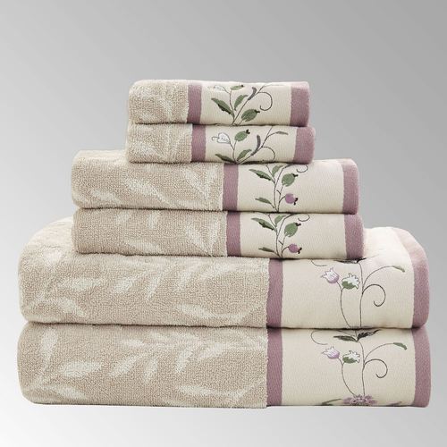 Update your bathroom with the Floral Serenity Bath Towel Set. These soft, terry cotton towels have 550 GSM and a jacquard light almond leaf motif on a khaki background. The 4" hem has an embroidered floral design. Other colors include hues of lavender, white, and olive. The six-piece towel set includes two bath towels, 27"x52" each; two hand towels, 16"x28" each; and two fingertip towels, 12"x18" each. Machine wash. Imported.