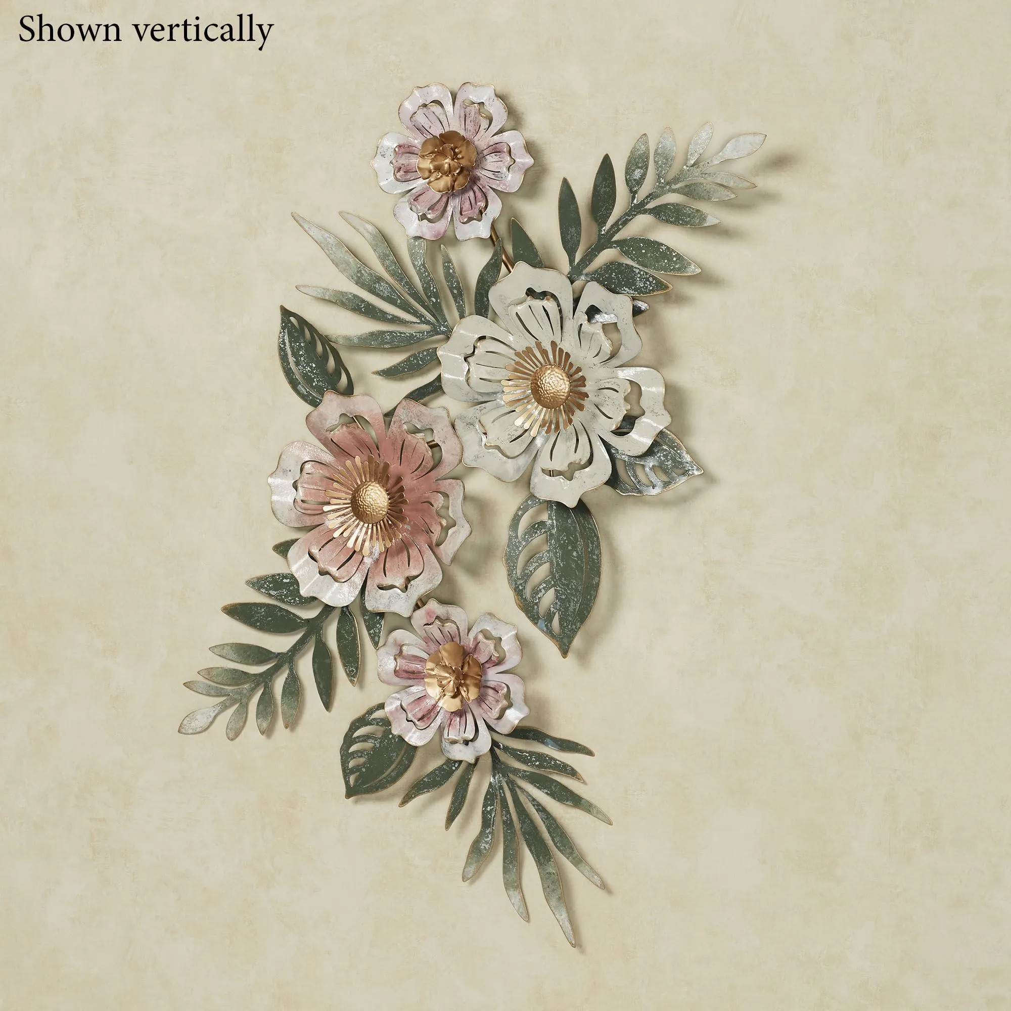 Captivating pink, ivory, and golden shades blossom from the Floral Sway Wall Art. In a dimensional metal design, the beautifully handpainted wall sculpture features four layered blooms and green leaves. Artwork can hang horizontally or vertically. For indoor or covered outdoor use. Measures 35"Wx2.5"Dx19.5"H.