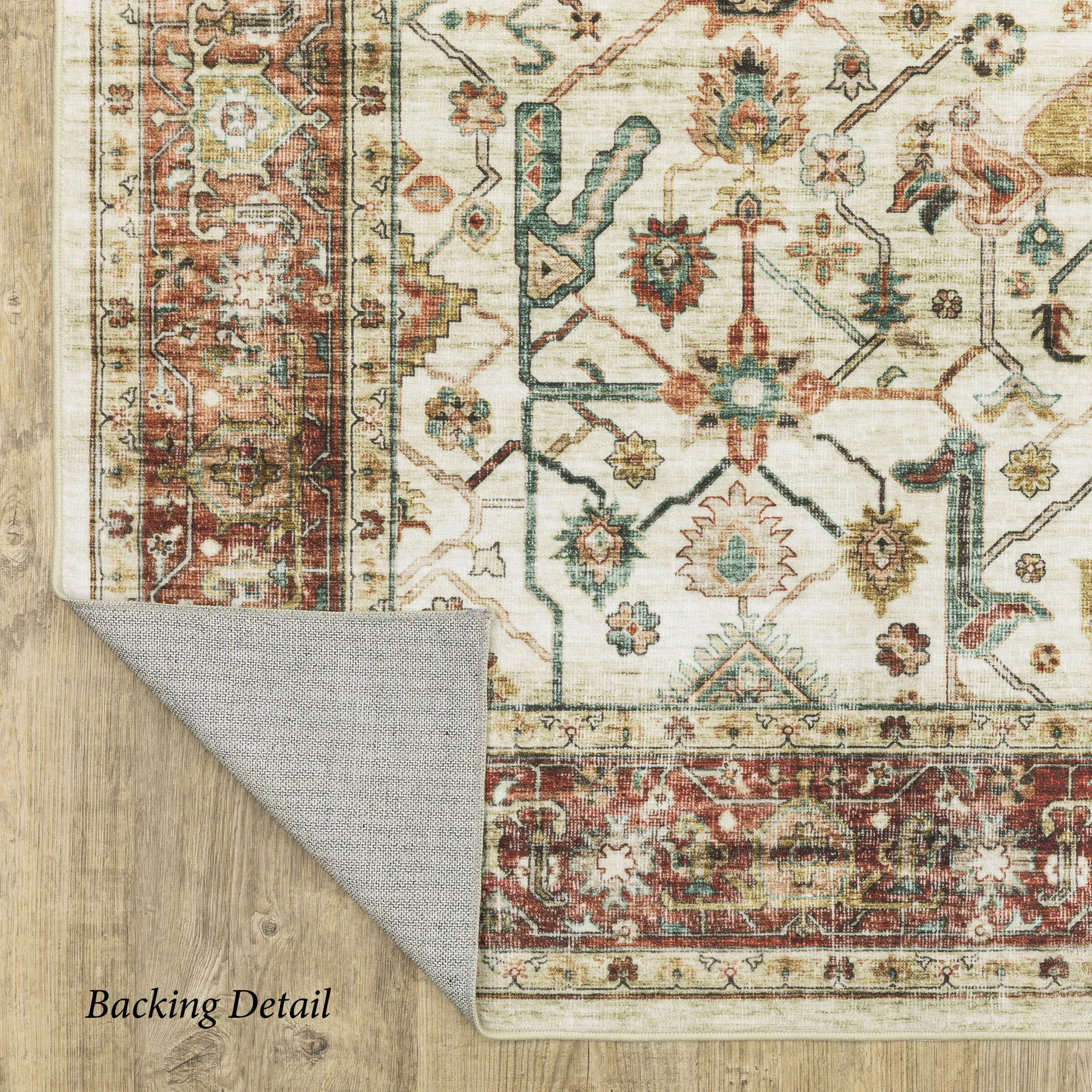 Warm tones and a rich spirit blossom throughout the Florence Area Rug. The power-loomed, .08" thick polyester rug features a traditional Persian-inspired print filled with intricate medallions, vines, and frames. Robust hues of ivory, tan, brick, and teal add warmth throughout. Backing is nonskid. Machine washable; follow the manufacturer's instructions. Imported.