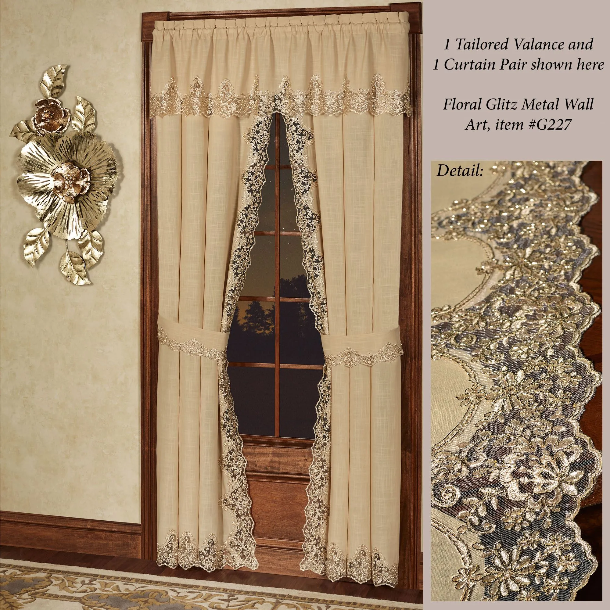 The Florentina Window Treatment displays lavishly elegant splendor with a signature look. The antique gold, slubbed polyester window accents have beautifully finished, hand-cut contour edges fancied with gold floral lace. Rod pockets are 1.75". Specify Tailored Valance or Curtain Pair. Tailored Valance is 60"Wx14"L. Curtains include tiebacks and measure 84"W. Machine washable. Imported. The curtain pair width is the total width of two panels together.