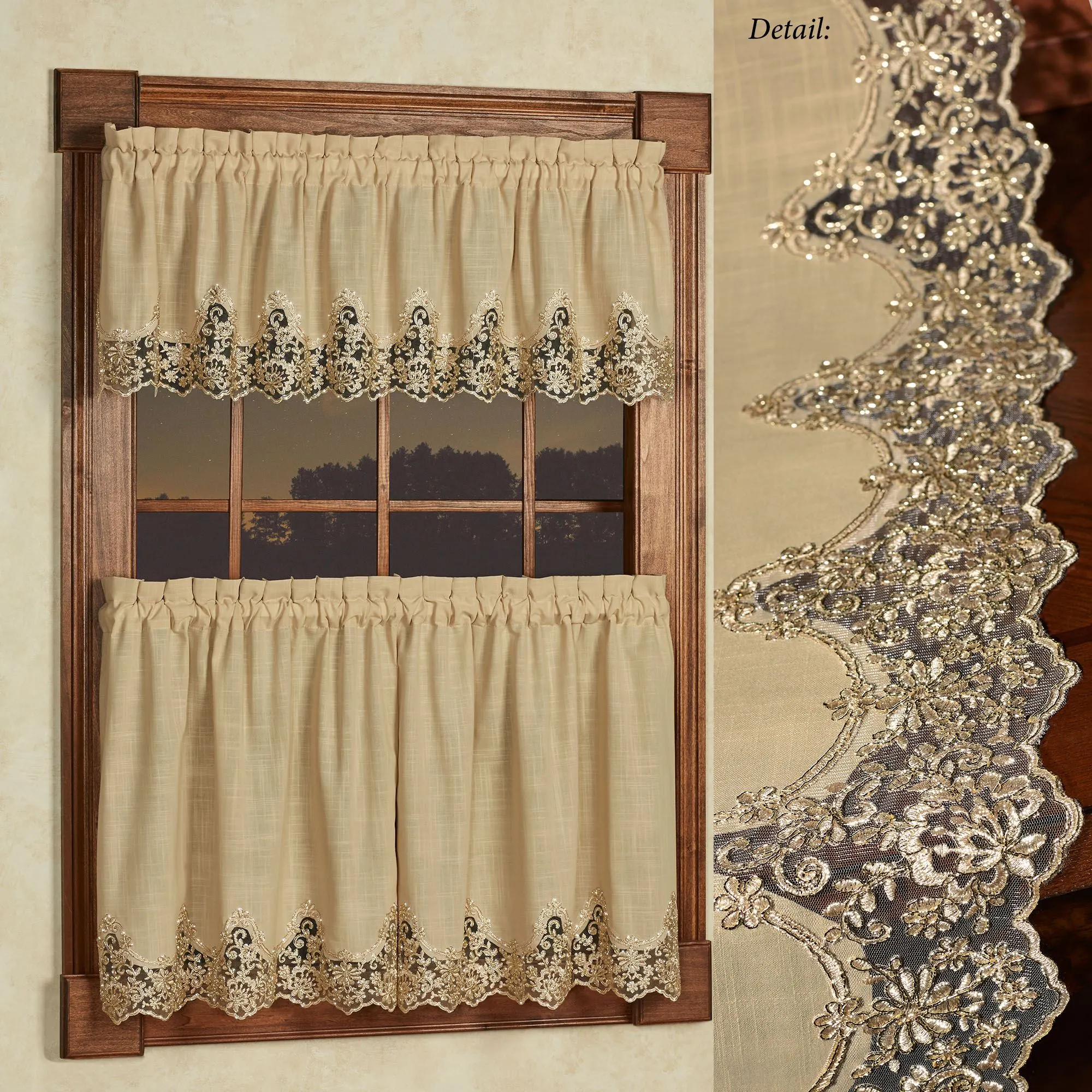 Florentina Antique Gold Lace Trim Window Tier and Valance Set