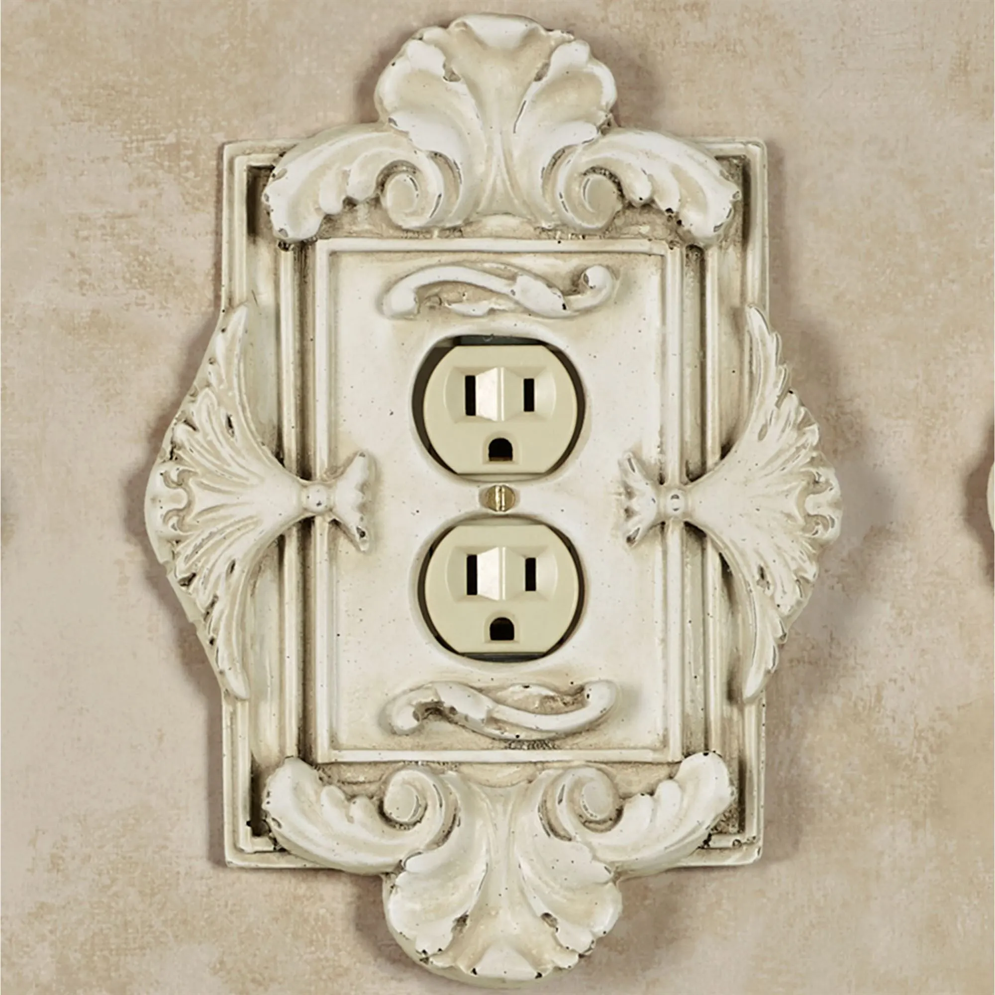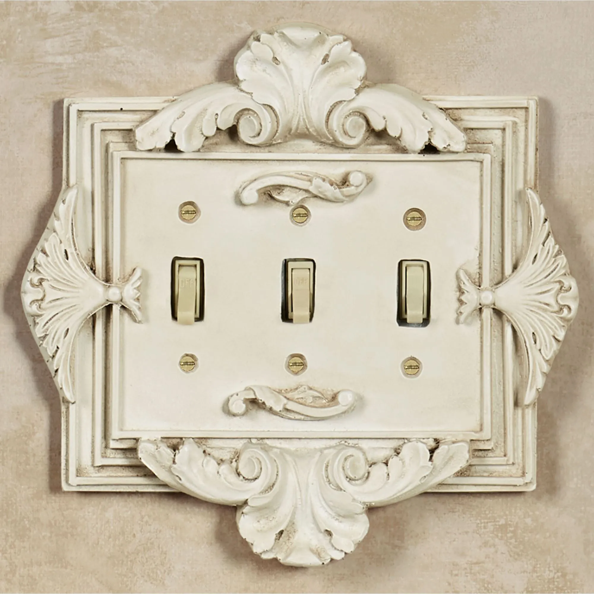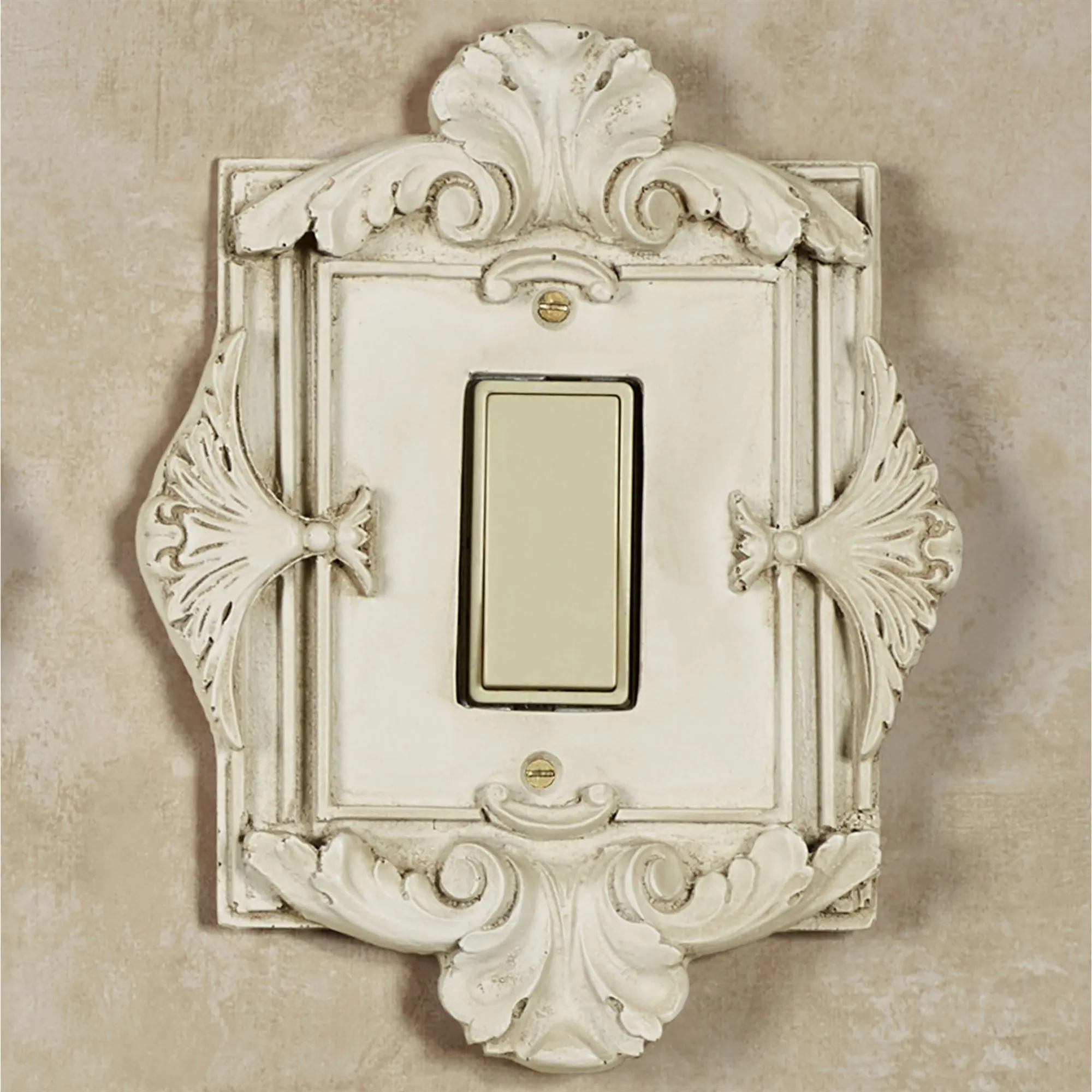 The decorative Florentine Old World White Switchplates feature acanthus leaves on the top, bottom, and sides. Handcrafted resin switchplates are from Craft Tex and have an Old World white finish. Specify Single Outlet, Double Switch, Triple Switch, Single Dimmer/Rocker, Double Dimmer/Rocker, or Triple Dimmer/Rocker. Do not over-tighten screws.