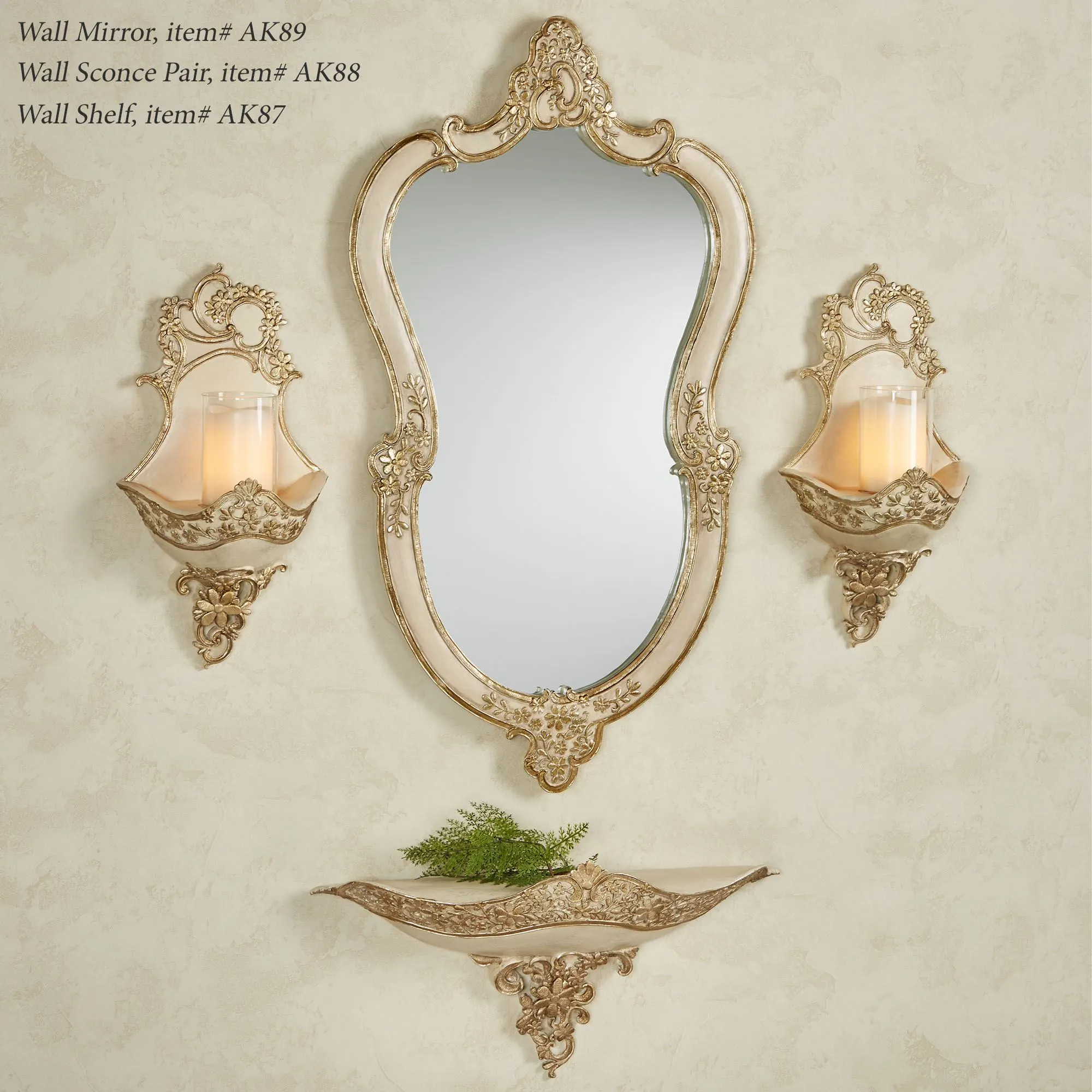 • Wall sconces have gold raised scrolls and floral designs