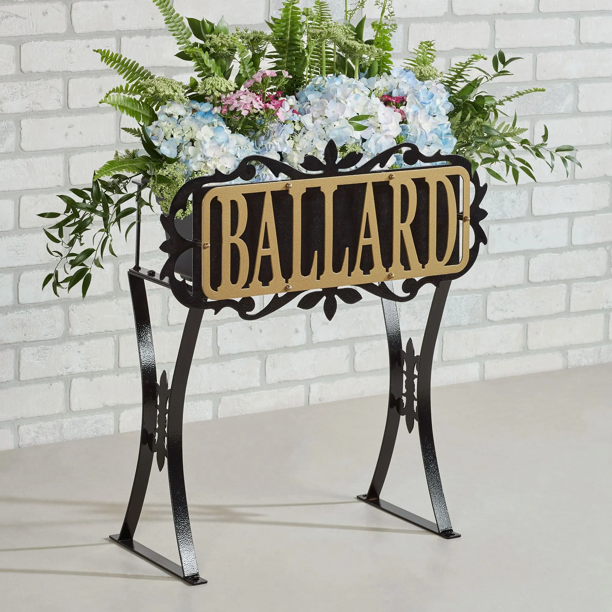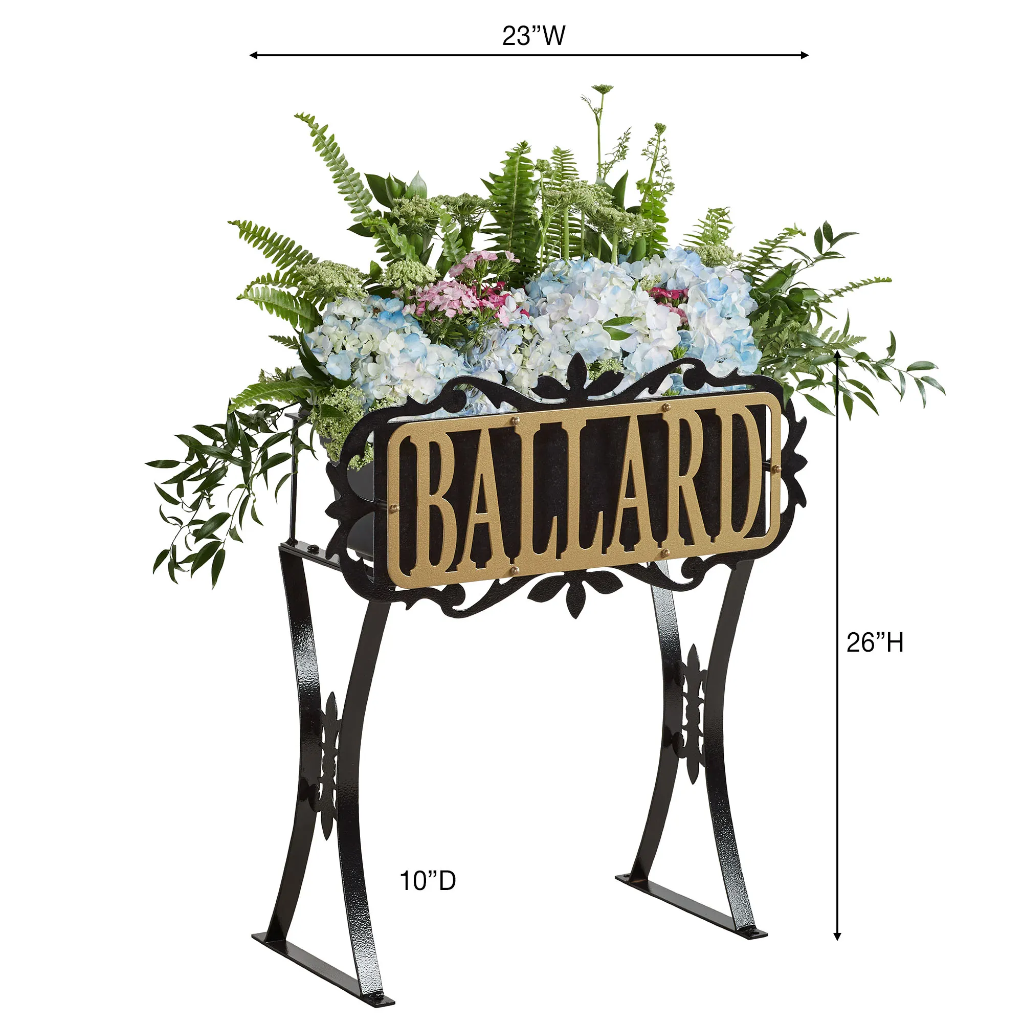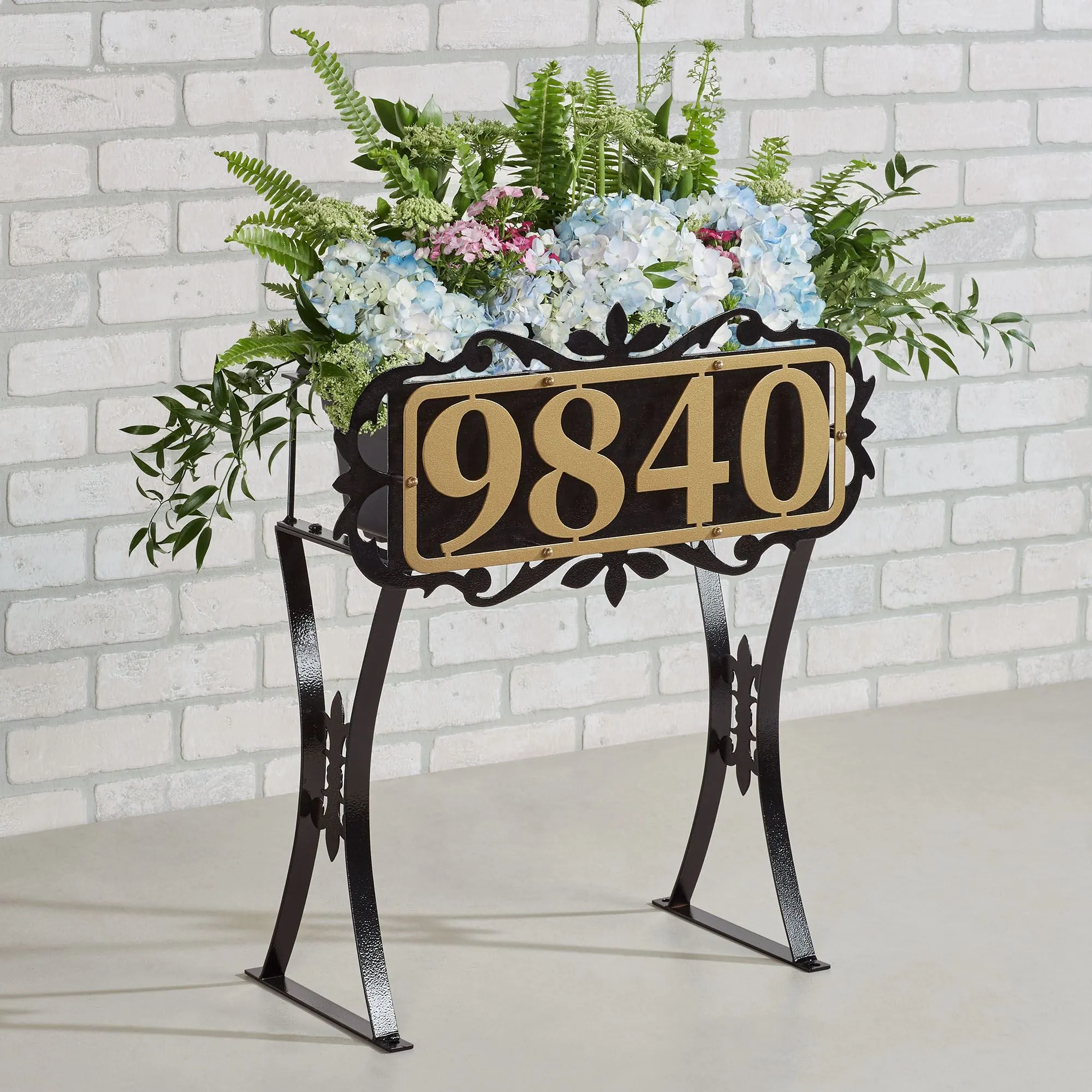 The Floret Personalized Planter Stand designed by JasonW Studios(R) showcases your address number or last name alongside your green thumb. Proudly made in the USA of precision-cut 14-gauge steel, the front of the black planter features ornately cut scrolls and fleurs surrounding your gold personalized design, all in a UV-, weather-, and tarnish-resistant powder-coat finish. Personalize with your address number or name up to 7 capital characters, including spaces. The removable plastic rectangle planter, 17.5"Wx8"Dx7"H, provides an 8-qt. space for your favorite plants, has a removable drain plug, and is UV-resistant. With two sturdy legs adorned with fleurs, the stand can be used on a porch, with your landscaping, or in the grass outdoors year round; four stakes are included to secure it in the ground. Overall, the planter stand measures 23"Wx10"Dx26"H and weighs approx. 11 lbs. (C)2022 Touch of Class(R).
