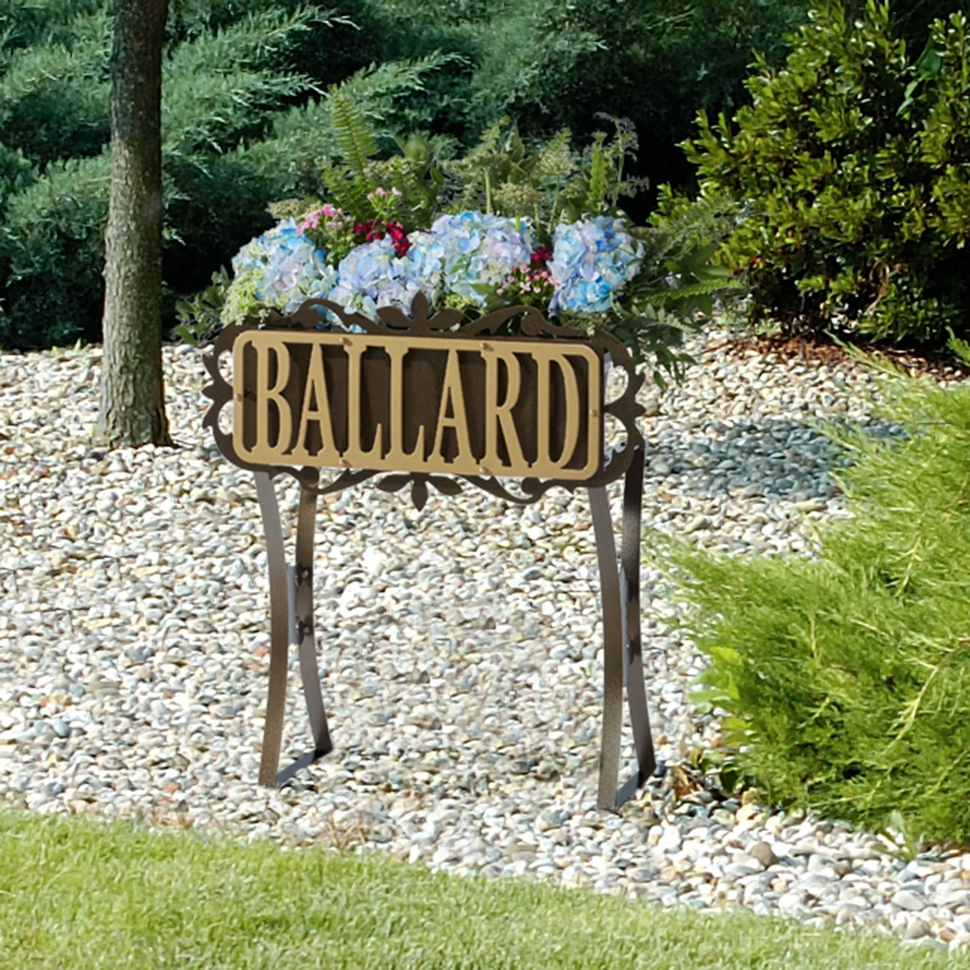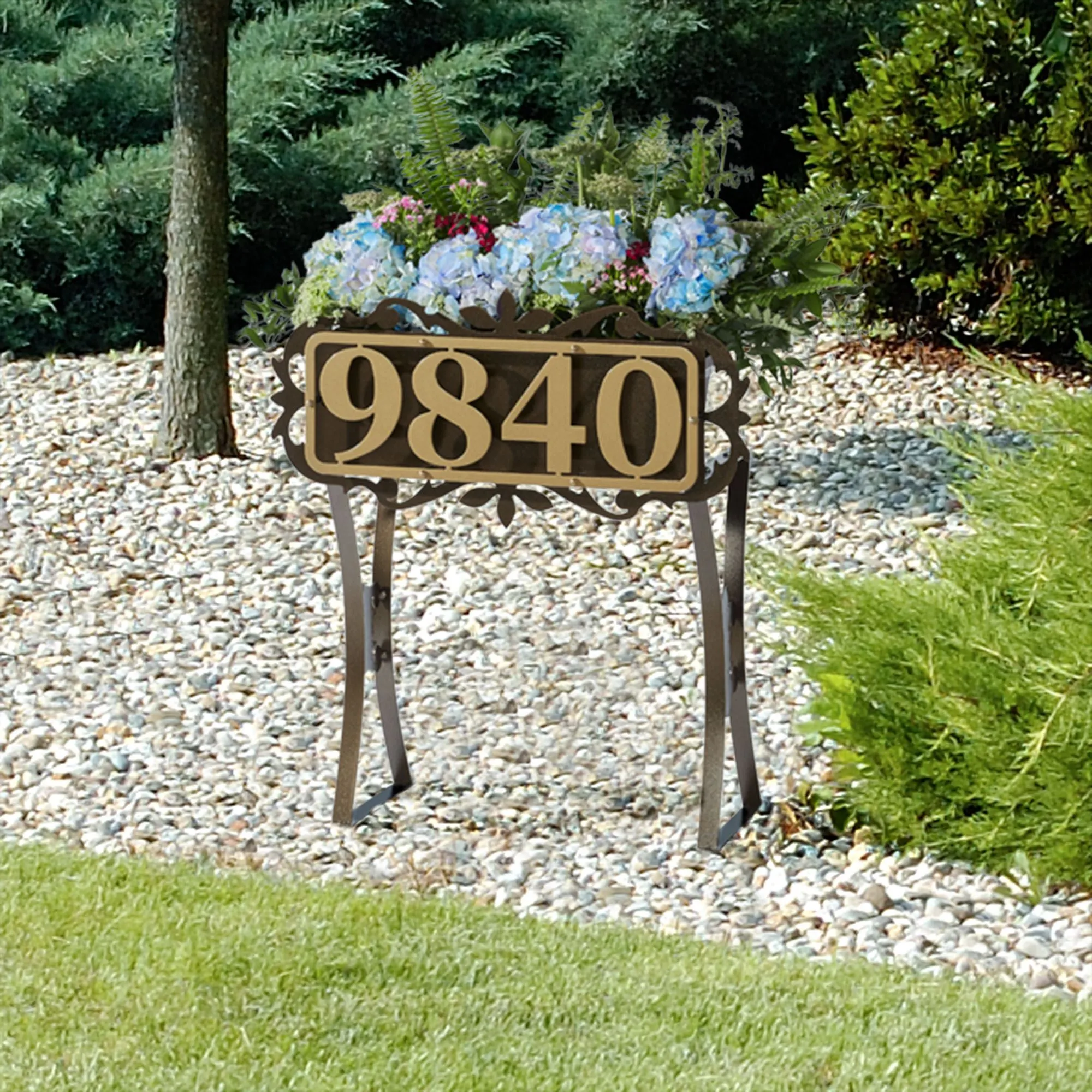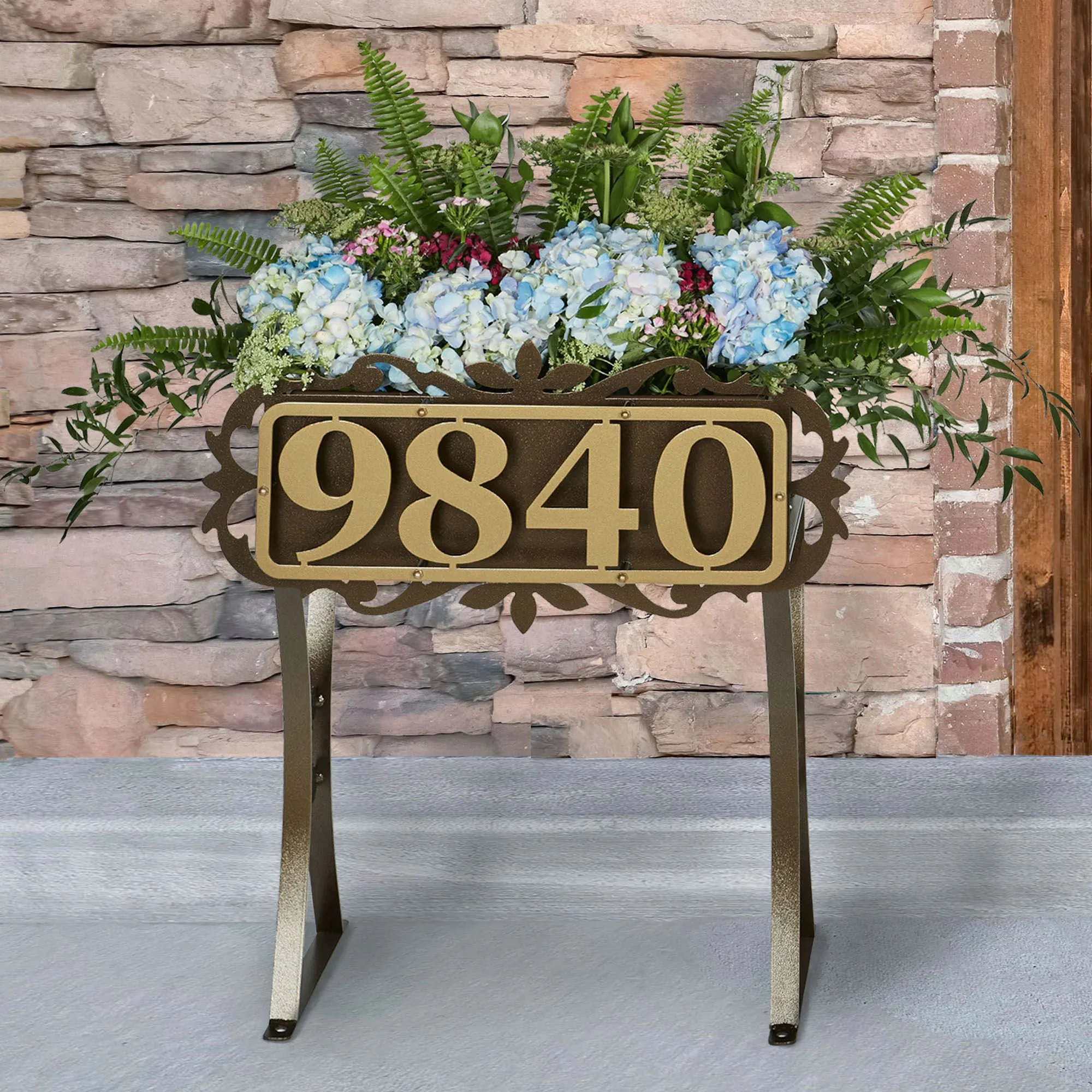 The Floret Personalized Planter Stand designed by JasonW Studios(R) showcases your address number or last name alongside your green thumb. Proudly made in the USA of precision-cut 14-gauge steel, the front of the bronze planter features ornately cut scrolls and fleurs surrounding your gold personalized design, all in a UV-, weather-, and tarnish-resistant powder-coat finish. Personalize with your address number or name up to 7 capital characters, including spaces. The removable plastic rectangle planter, 17.5"Wx8"Dx7"H, provides an 8-qt. space for your favorite plants, has a removable drain plug, and is UV-resistant. With two sturdy legs adorned with fleurs, the stand can be used on a porch, with your landscaping, or in the grass outdoors year round; four stakes are included to secure it in the ground. Overall, the planter stand measures 23"Wx10"Dx26"H and weighs approx. 11 lbs. (C)2022 Touch of Class(R).