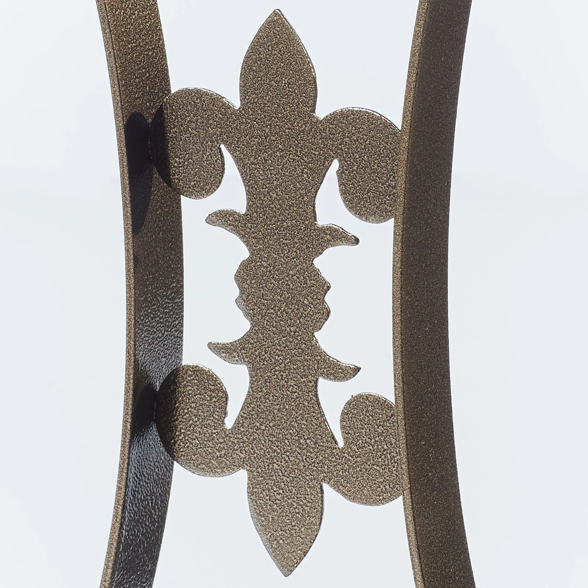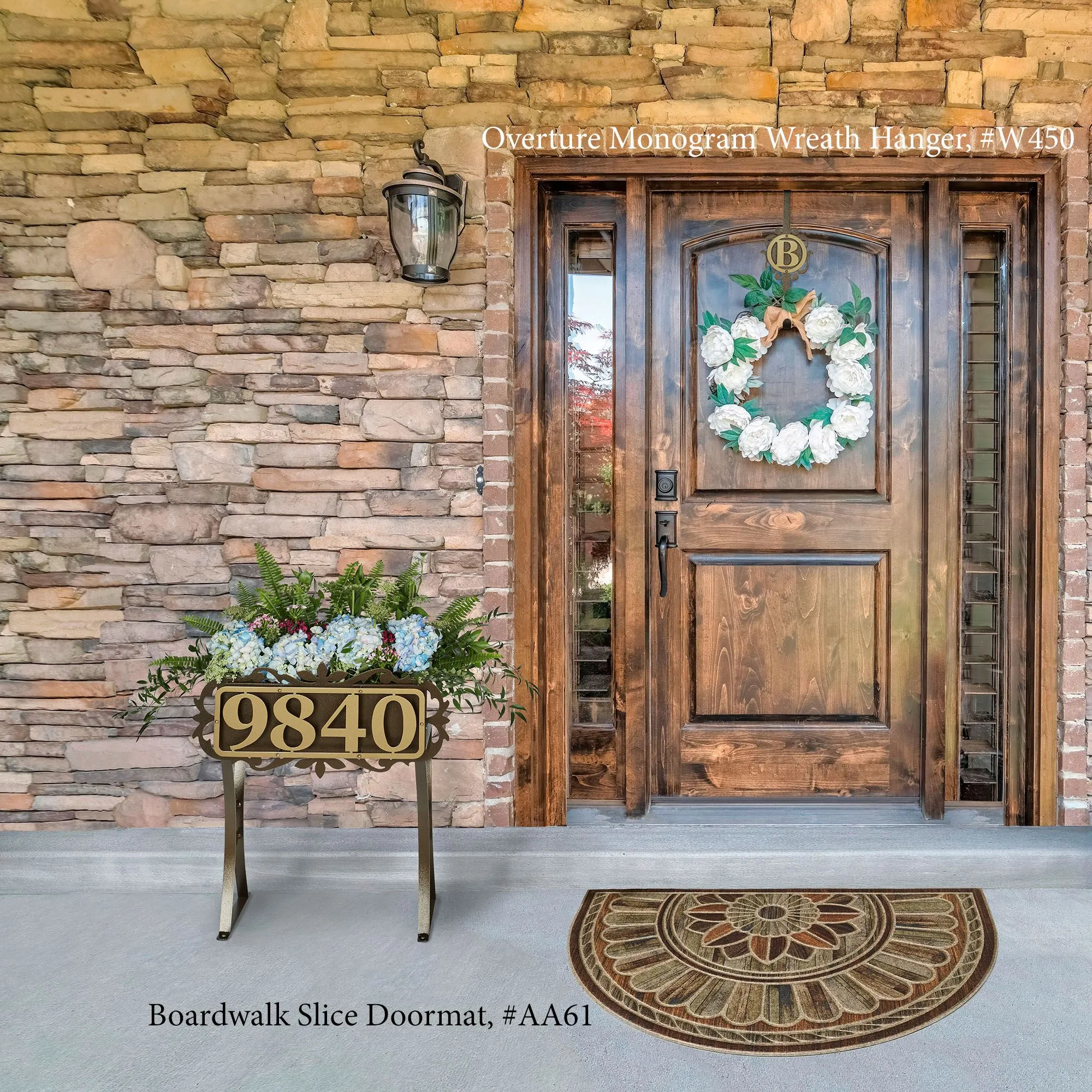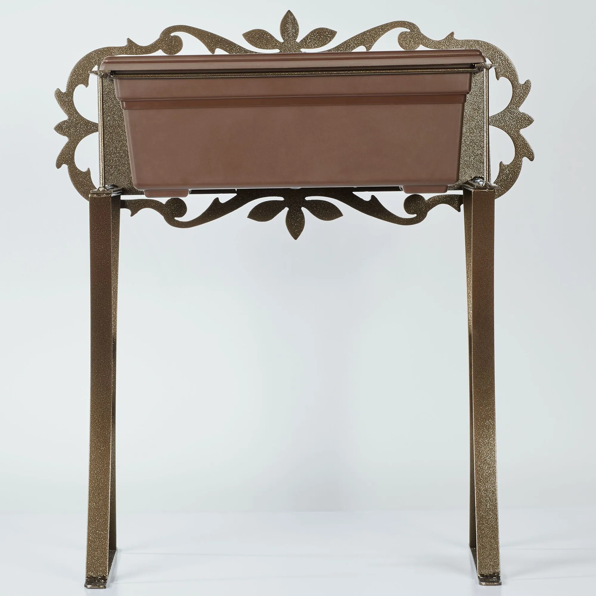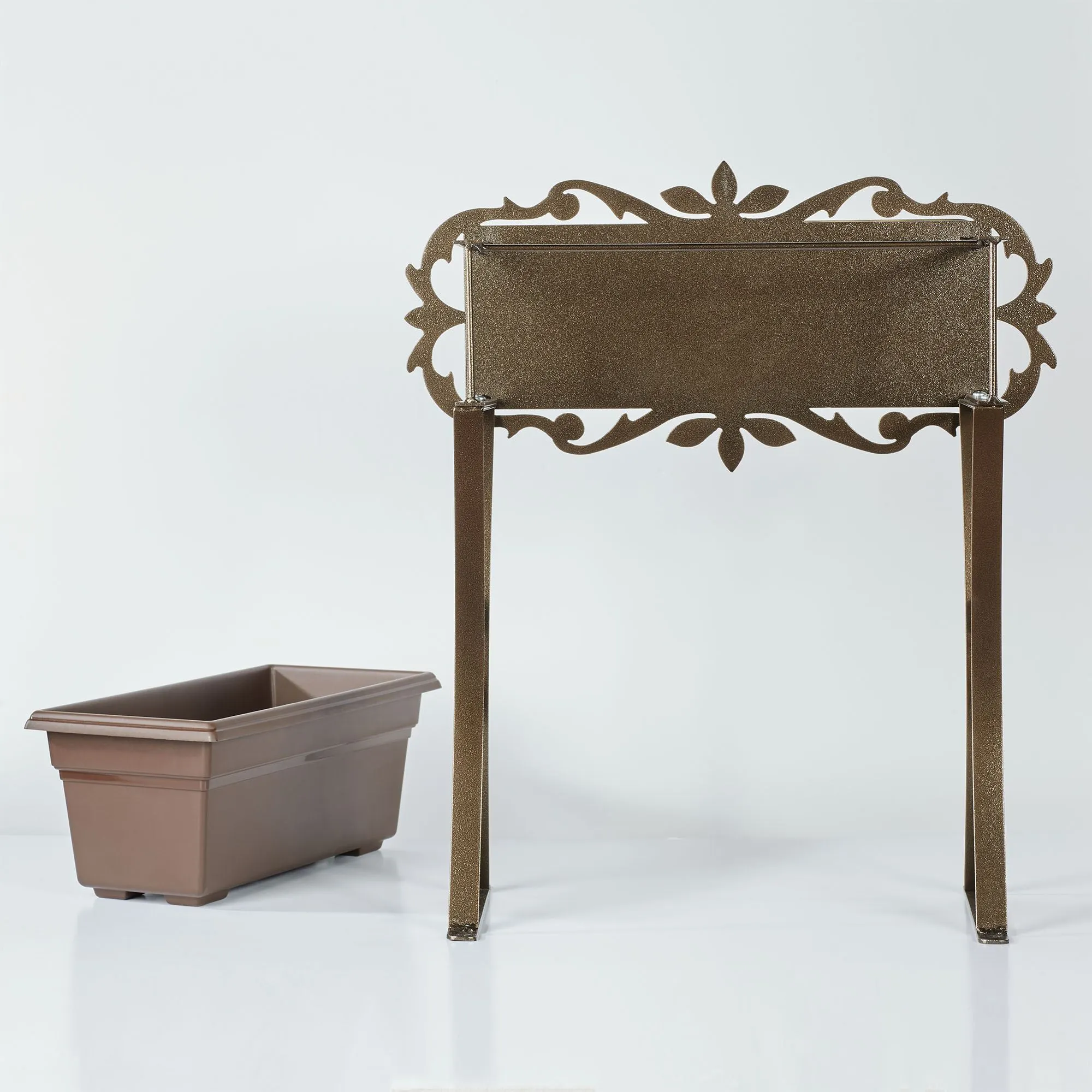 The Floret Personalized Planter Stand designed by JasonW Studios(R) showcases your address number or last name alongside your green thumb. Proudly made in the USA of precision-cut 14-gauge steel, the front of the bronze planter features ornately cut scrolls and fleurs surrounding your gold personalized design, all in a UV-, weather-, and tarnish-resistant powder-coat finish. Personalize with your address number or name up to 7 capital characters, including spaces. The removable plastic rectangle planter, 17.5"Wx8"Dx7"H, provides an 8-qt. space for your favorite plants, has a removable drain plug, and is UV-resistant. With two sturdy legs adorned with fleurs, the stand can be used on a porch, with your landscaping, or in the grass outdoors year round; four stakes are included to secure it in the ground. Overall, the planter stand measures 23"Wx10"Dx26"H and weighs approx. 11 lbs. (C)2022 Touch of Class(R).