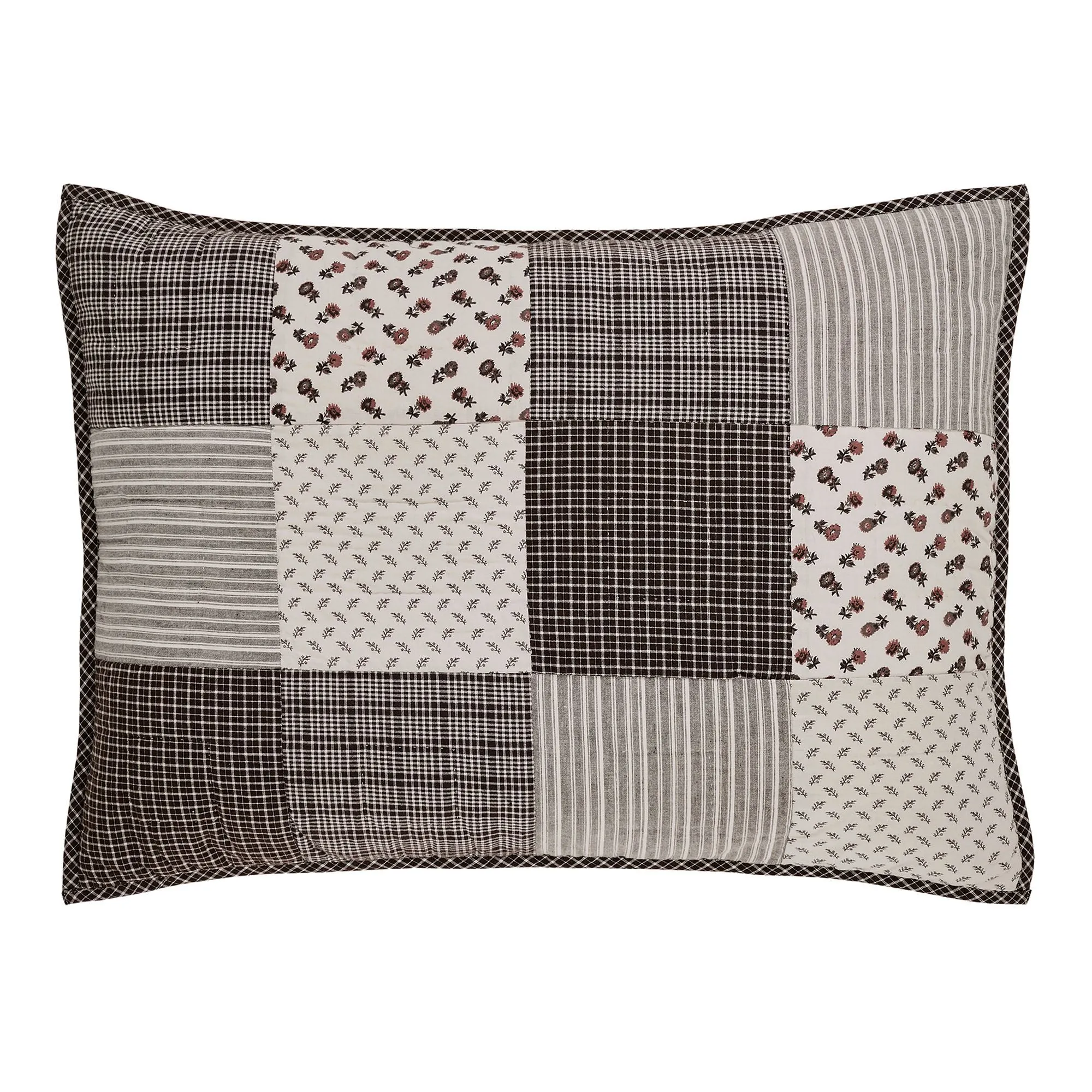 Give your bedroom a primitive, French country look with the Florette Patchwork Quilt. This lovely cotton quilt features patchwork squares with printed floral, stripe, and plaid designs. Colors include shades of white, coffee brown, chocolate, gray, beige, ecru, natural, and rust. Patchwork quilt has stitch-in-the-ditch and echo quilting, bound ends, and plaid backing. Quilt fill is cotton. Machine wash gentle; click on the Details tab for full care information. Imported.