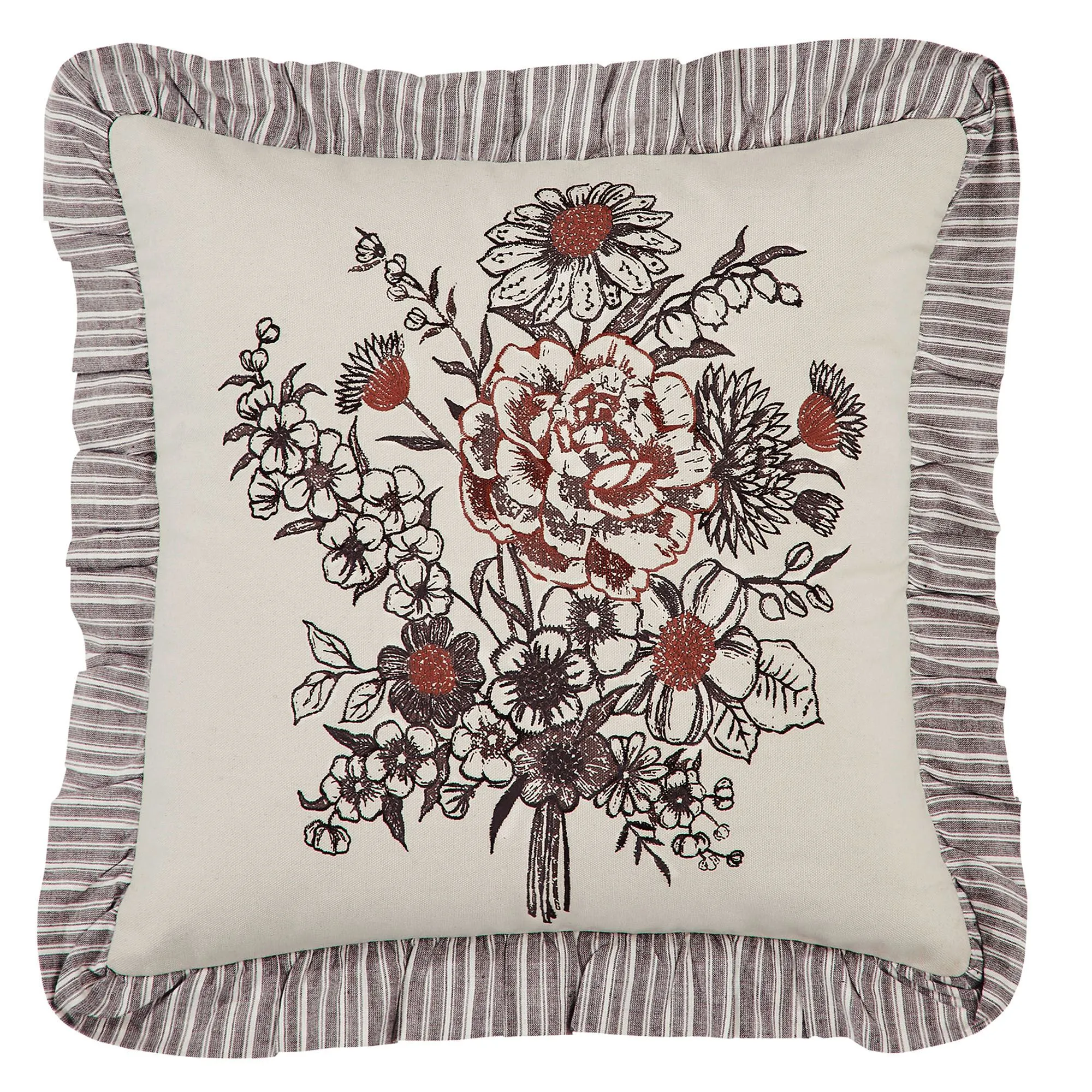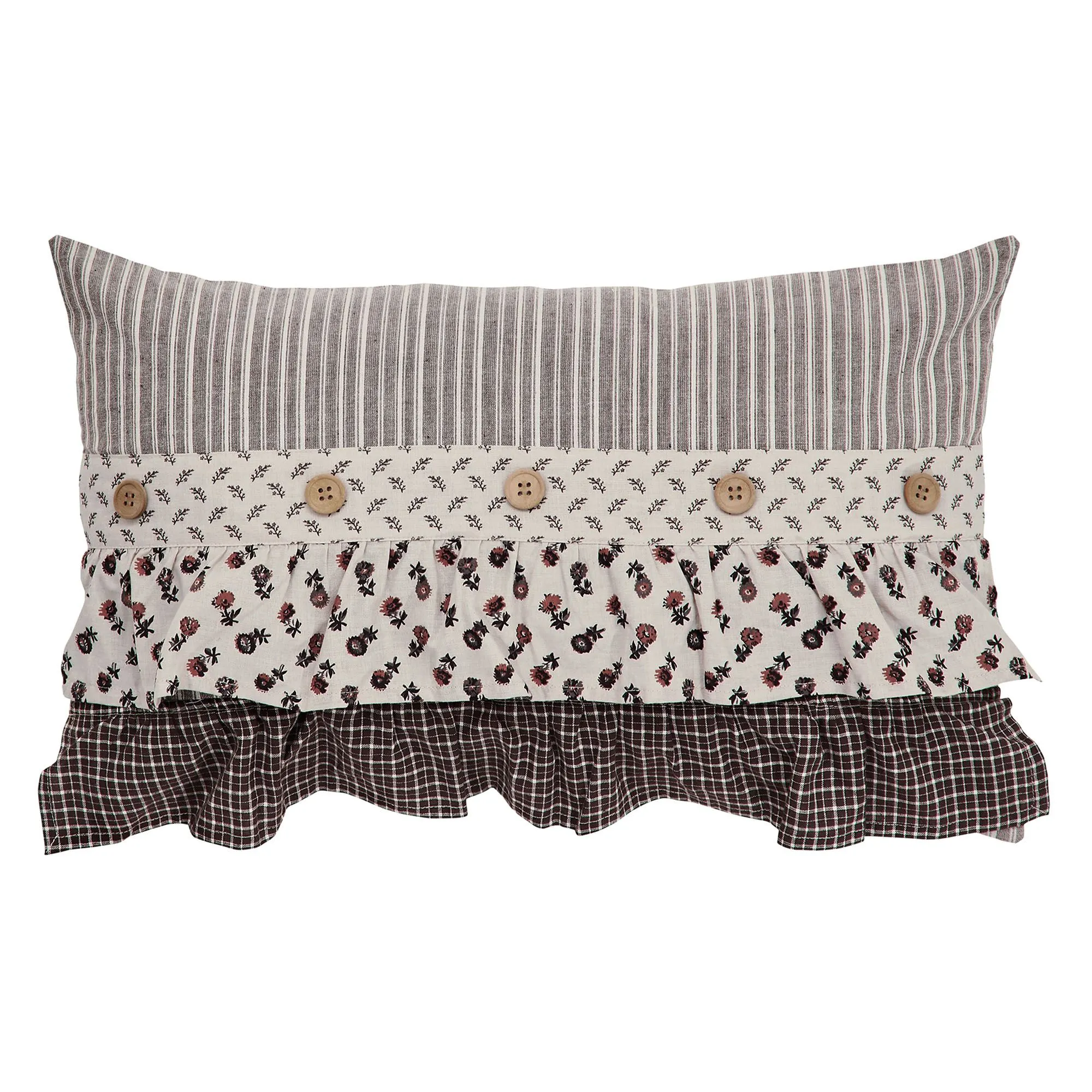 Pillows have printed stripes and button closures. Spot clean the pillow form; machine wash the cover. Square has an embroidered floral bouquet and a ruffled flange. Pieced, tailored Rectangle has mini florals, a plaid pattern, ruffles, and button accents.