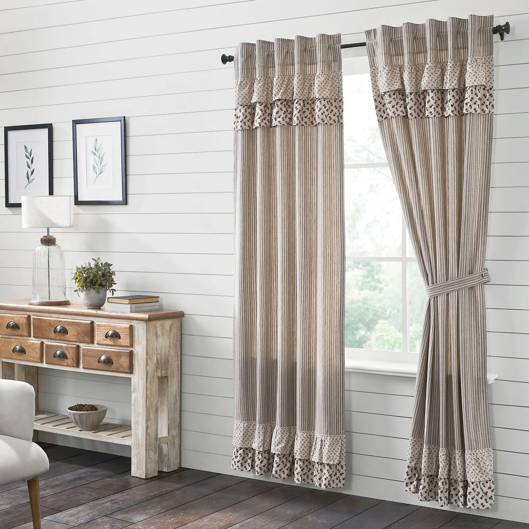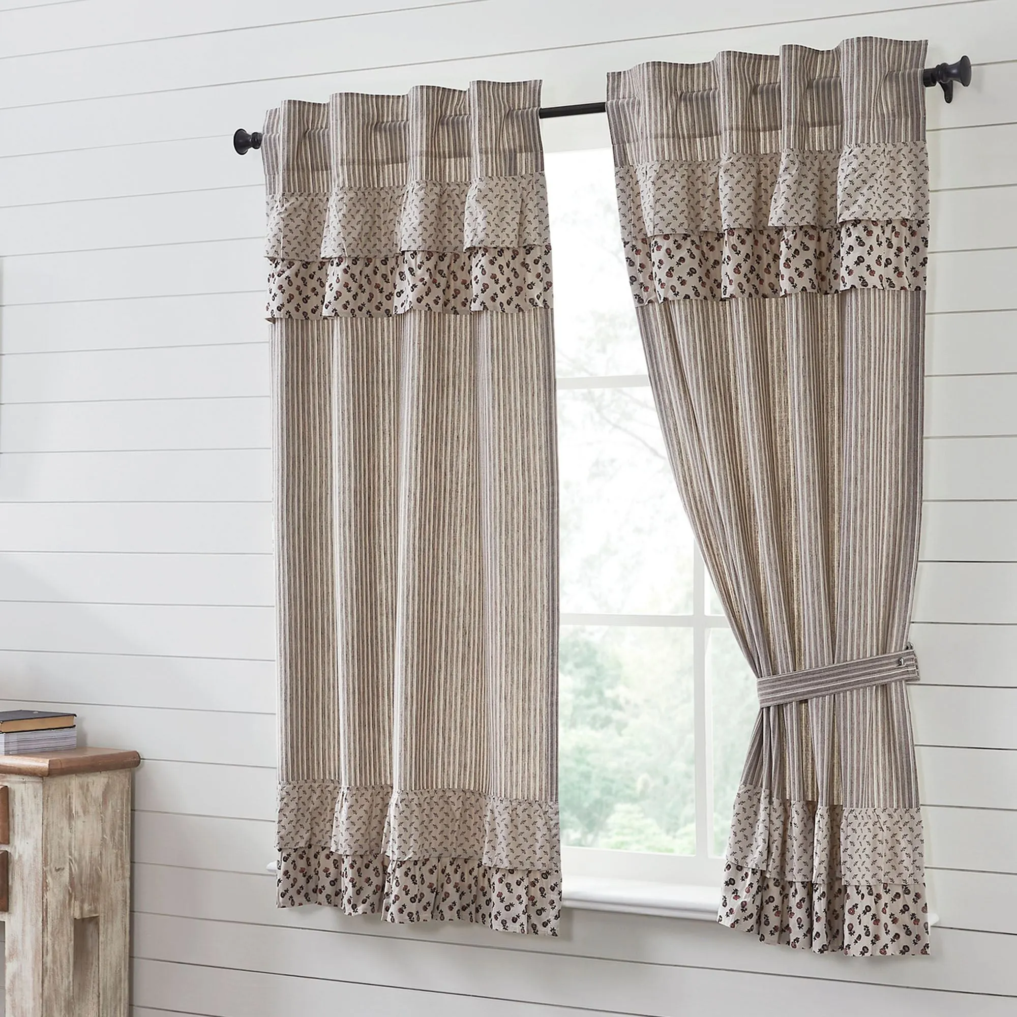Lined Window Treatment has stripes, ruffles, and 3.25" rod pockets. Curtain Pair includes tiebacks. Curtains are available in two sizes. Valance is available in two widths.