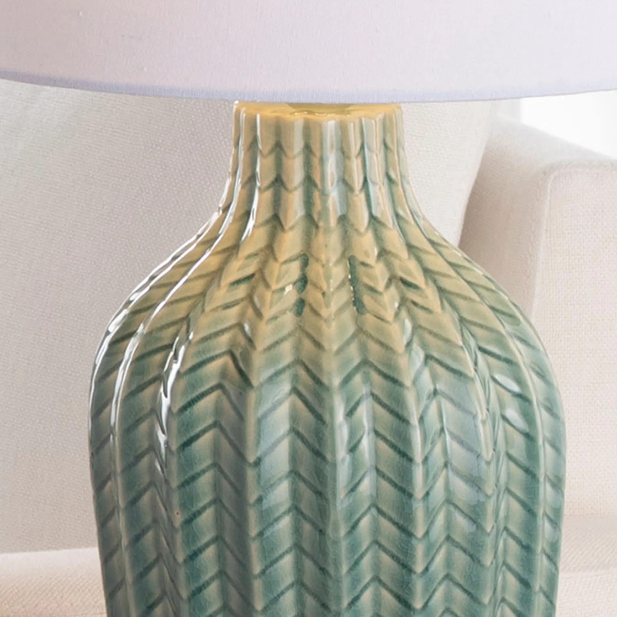 Decorate with the dimensional look of the Florian Table Lamp Set. These aqua mist ceramic table lamps feature a glossy chevron pattern and have tapered, off-white linen fabric shades. UL listed. Each lamp requires one 3-way 100W max. bulb and measures 13"dia.x23.5"H, including the 1.75"H finial.