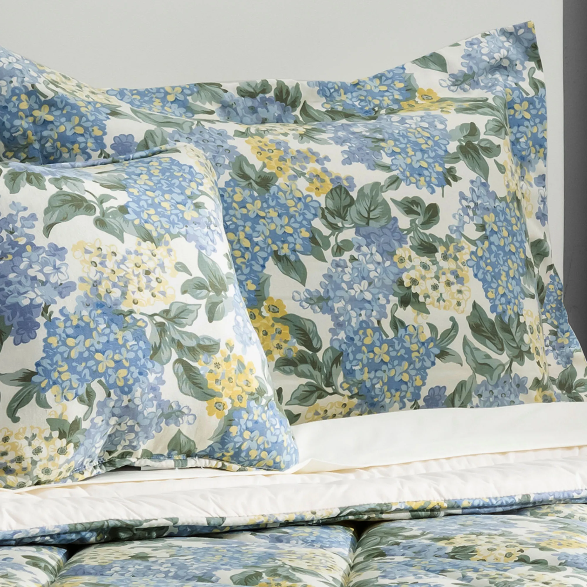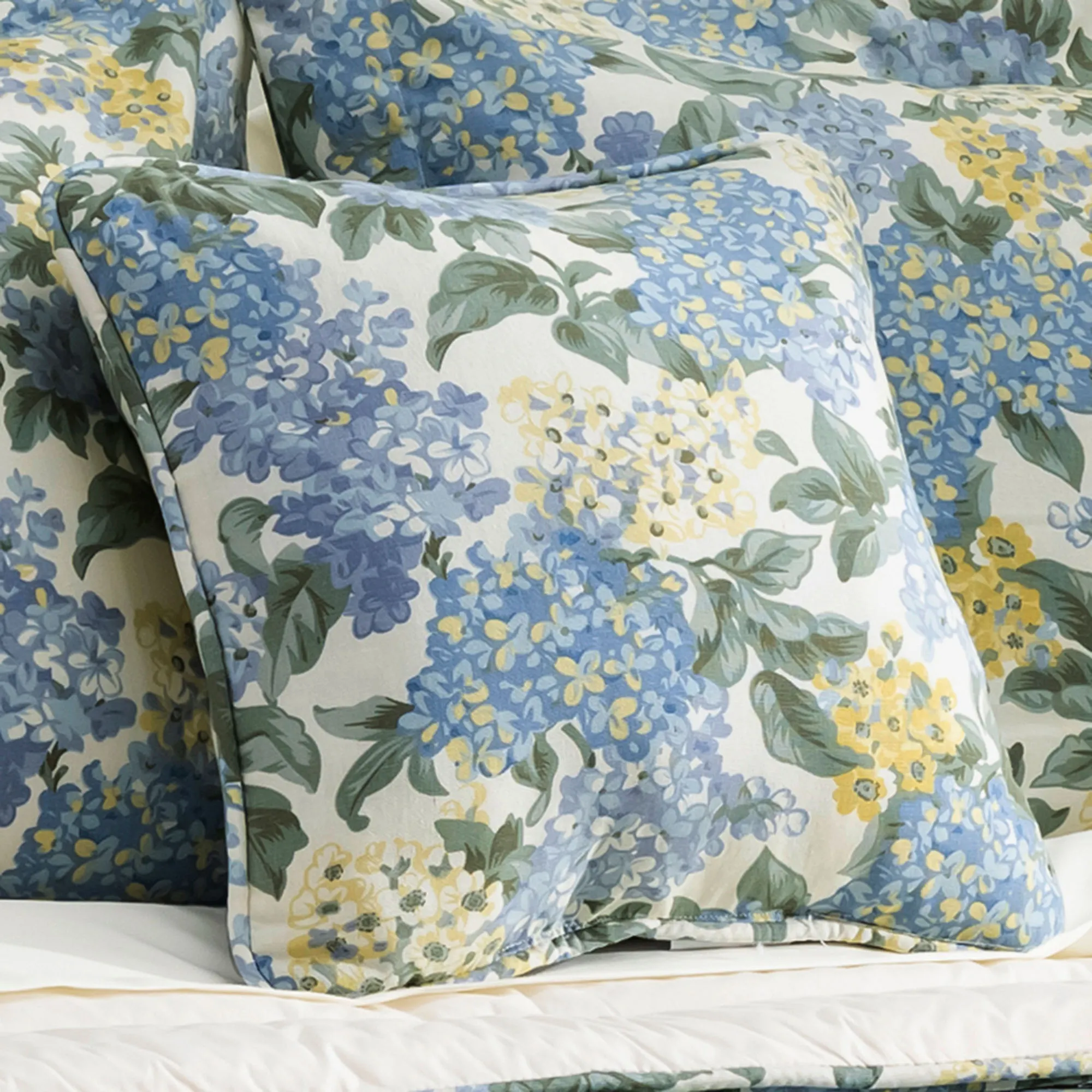 Hydrangeas blossom gracefully from the Floryn Bedding. Proudly made in the USA, the off-white woven cotton duck ensemble is printed with blue, butter, and off-white hydrangeas with green leaves for a classic garden appeal.