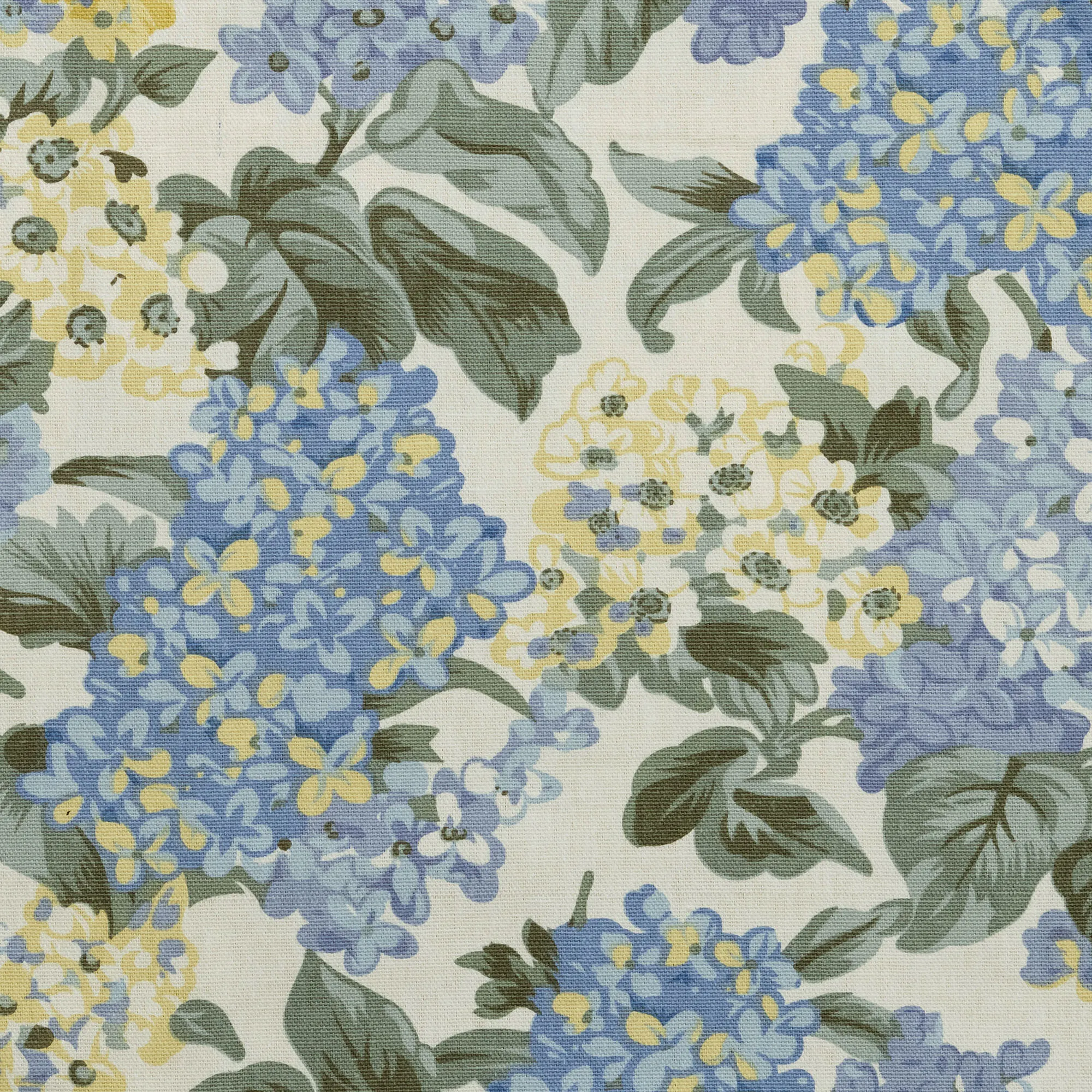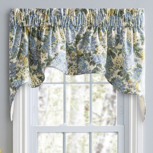 Hydrangeas blossom gracefully from the Floryn Window Treatment. Printed in hues of blue, butter, and green, the lovely hydrangeas flower from off-white cotton duck background in a classic garden appeal. Specify Empress Swag Valance Pair, Curtain Pair, Tier Pair, Scalloped Valance, Tailored Valance, or Tie-Up Valance. The lined Empress Swag Valance Pair has piped edges. Curtain Pair includes tiebacks. The lined Scalloped Valance has piped edges. Tie-Up Valance has two attached loops. All, except the Tier Pair, hang via 3" rod pockets. Tier Pair has 1.5" rod pockets. Dry cleaning is recommended. Imported. The curtain pair width is the total width of two panels together.