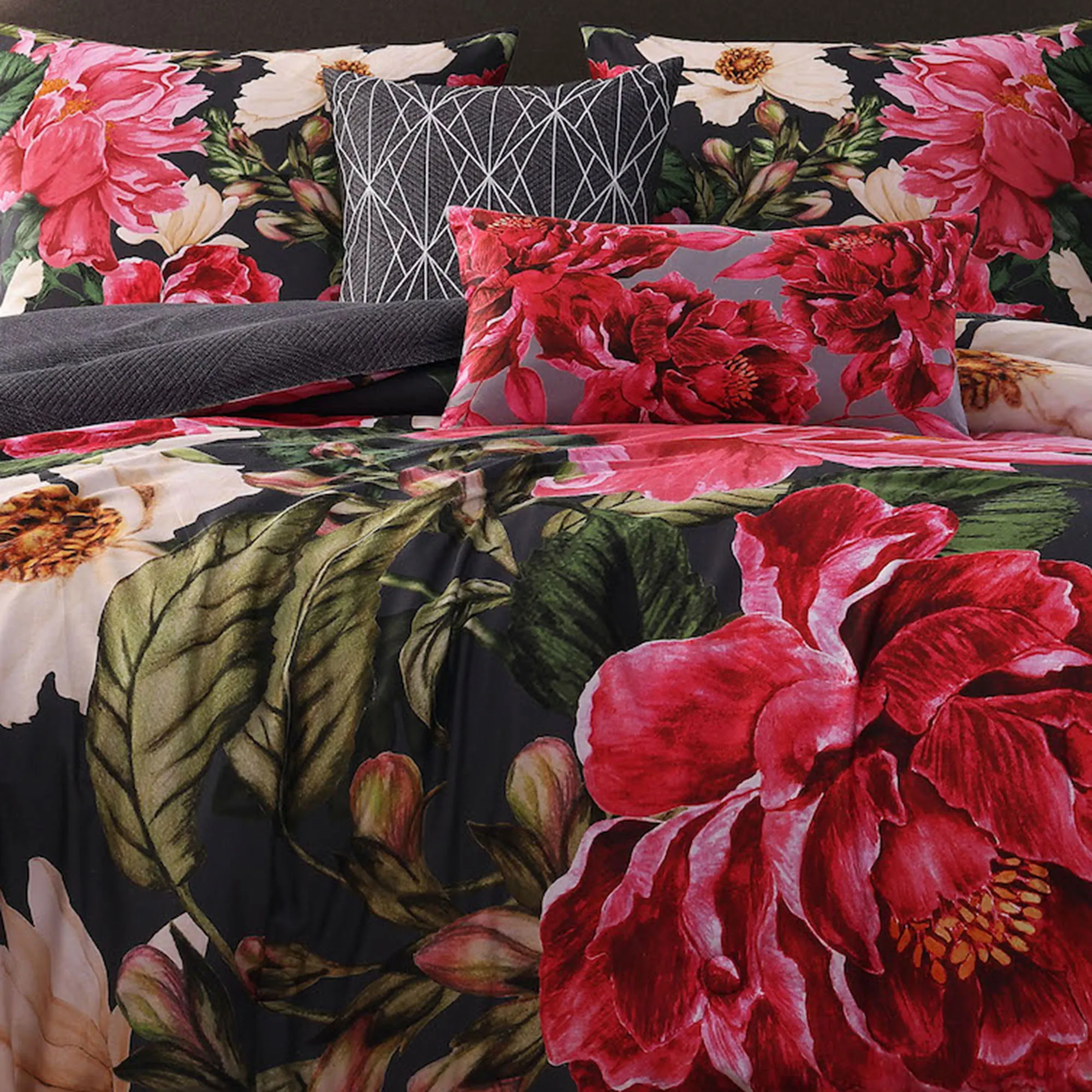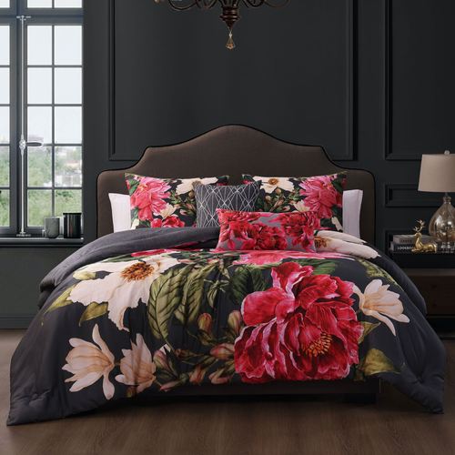 Grand blossoms unfurl majestic petals upon the Flower Garland Bedding. The 5-piece Bed Set includes a comforter, 2 shams, and 2 decorative pillows. In printed shades of crimson, raspberry, ivory, and cream, the lovely oversized flowers create a layered look along with greenery upon the dark charcoal cotton sateen ground. Oversized floral comforter reverses to dark charcoal herringbone. Click on the Details tab to read about the other items. Fill is polyester. Machine washable; spot clean the pillows. Imported.