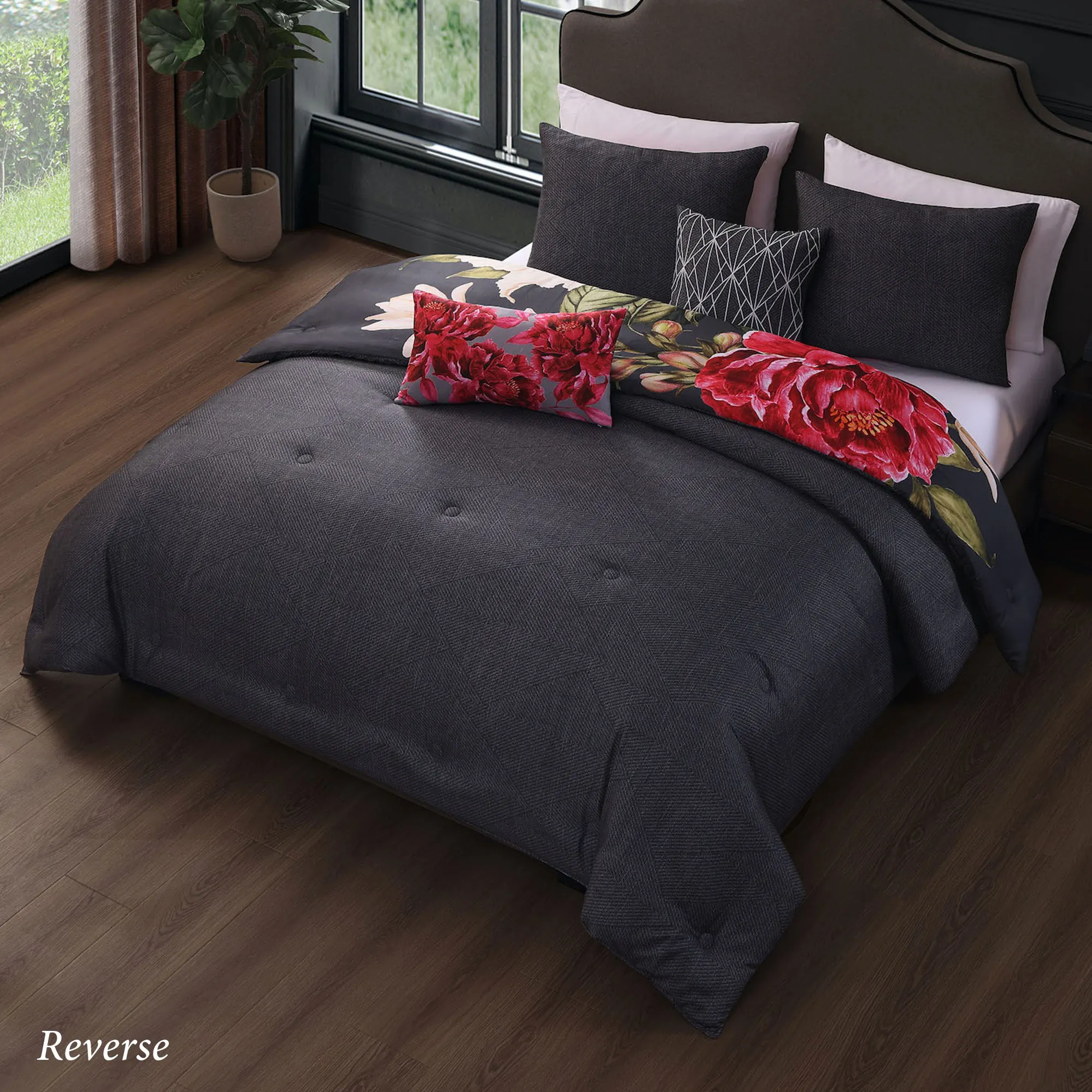 Flower Garland Reversible Dark Charcoal 5 pc Comforter Bed Set