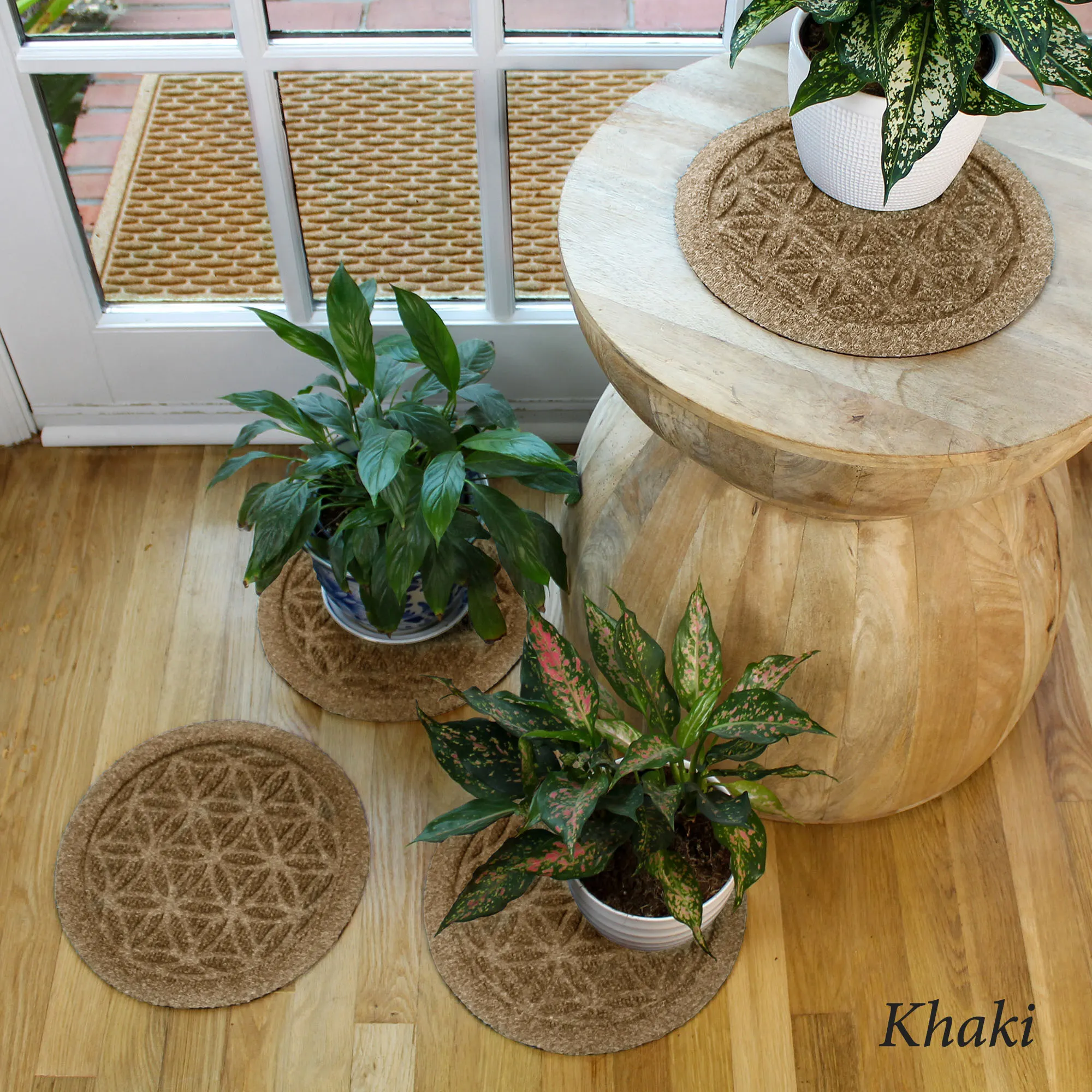 Keep your space clean and give your plants beautiful resting spots indoors or outdoors year round with the Flower of Life Plant Trivet Set. Proudly made in the USA, the PET polyester trivets feature pressed molded floral-esque designs, a unique Water Dam border, and durable skid-resistant rubber backing. The WaterHog(R) exclusive Water Dam rubber border keeps dirt and water on the mat and not your floor. Accents are mildew-, mold-, and rot-resistant to keep your plants happy and healthy. The 12" Trivet Set is sold as a 4-piece set. The 17" Trivet Set is sold as a 2-piece set. Shake or hose off to clean.
