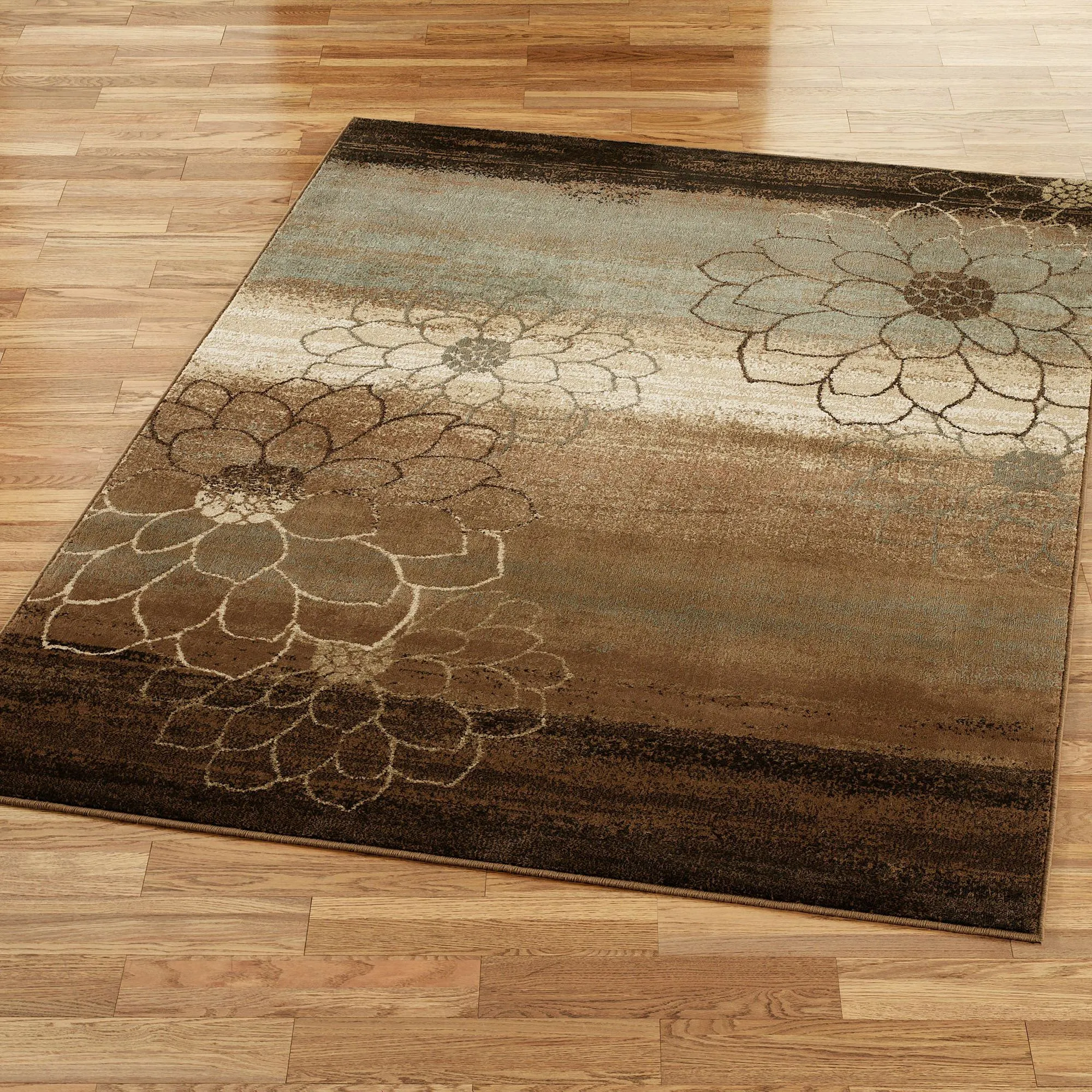The Flower Outline Area Rugs, machine-woven of .5" thick, heat-set polypropylene, feature shadowy outlines of dahlias on a subtly multicolored, variegated stripe background. Hues of browns, blue, and cream complete the palette of these sophisticated floral area rugs. We recommend professional cleaning by a rug cleaner. Imported.