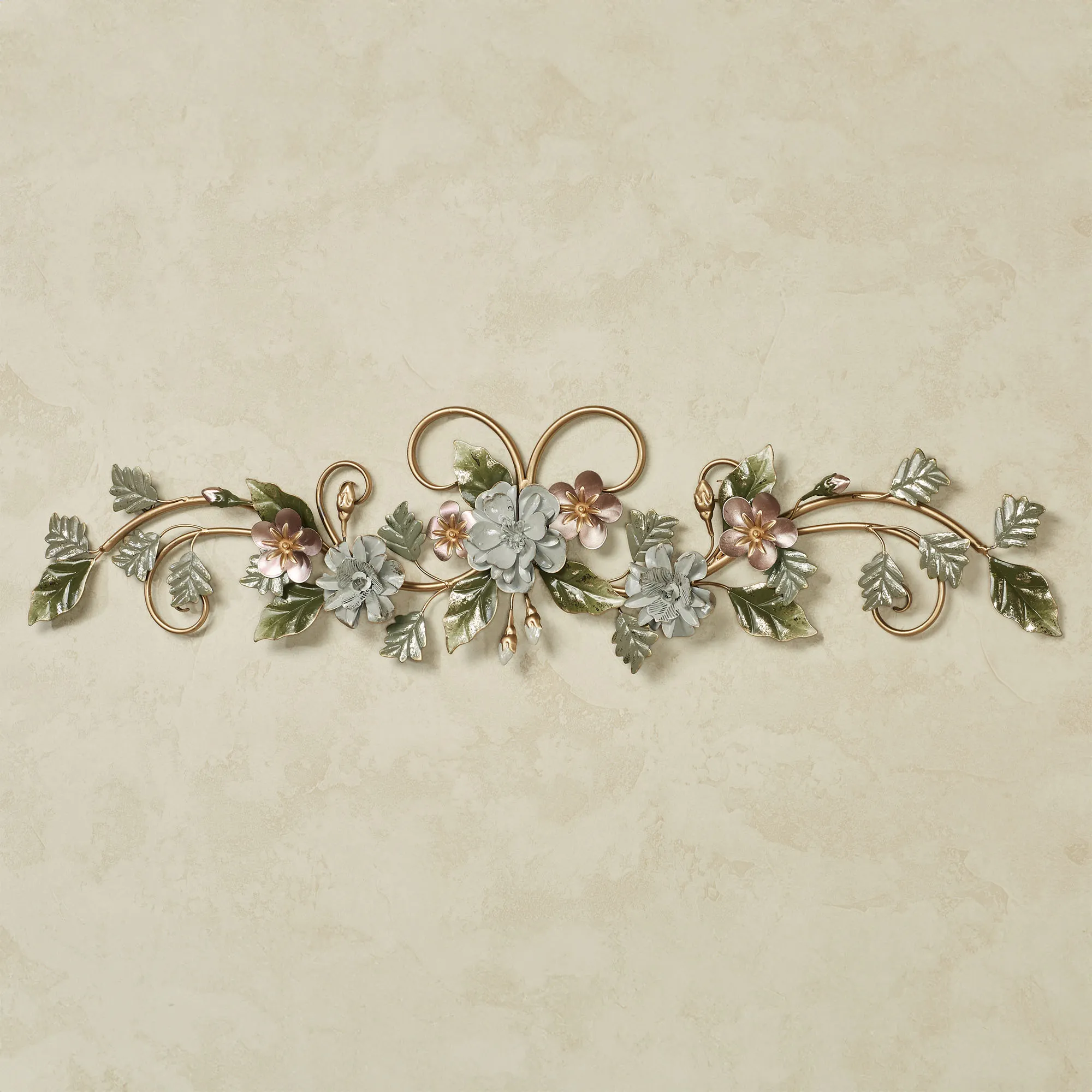 Beautiful blossoms and leaves among swirling scrolls flourish with Flowering Charm. This metal wall art topper is finished in shades of metallic pink, light gray, green, taupe, and gold. Measures 37"Wx2"Dx9.5"H.