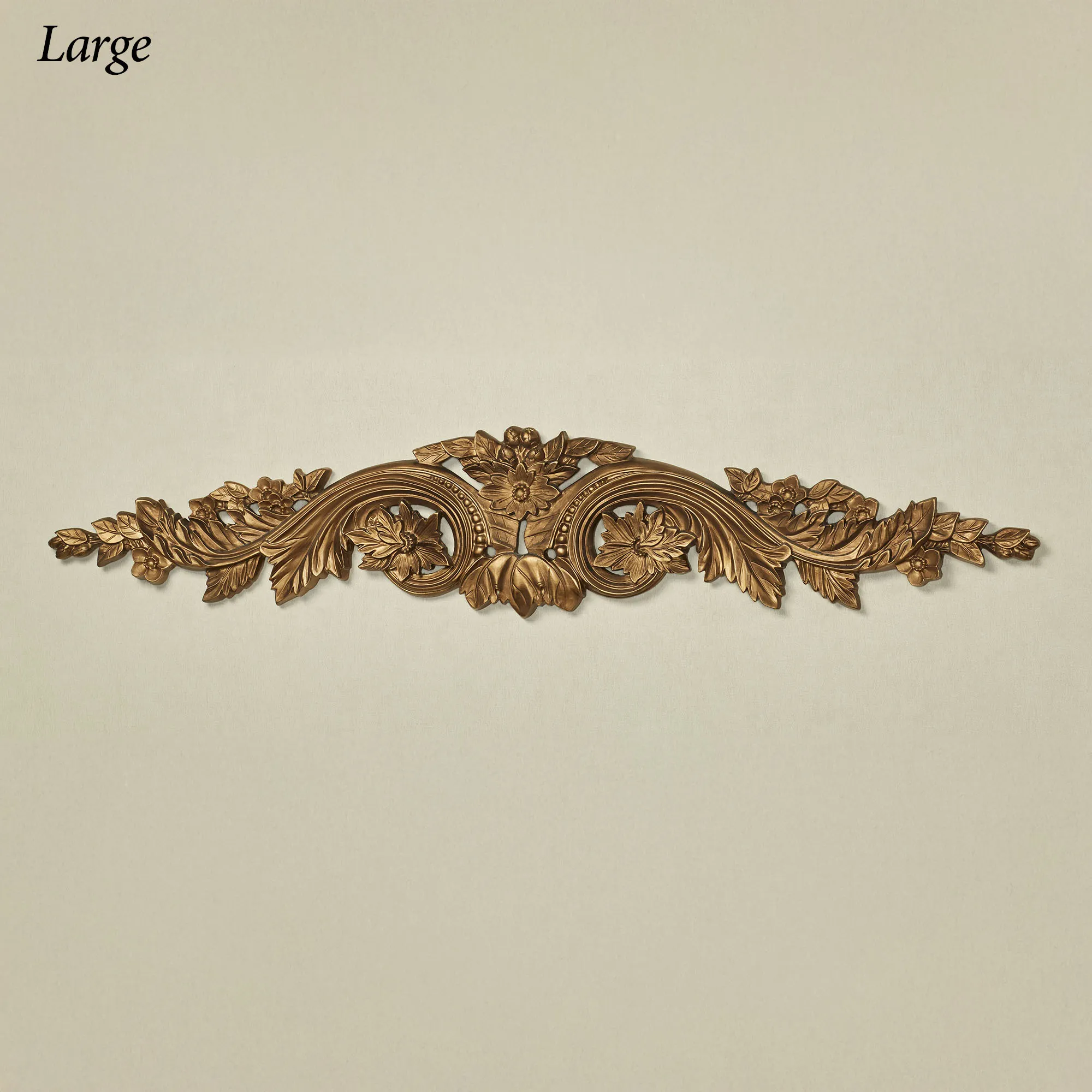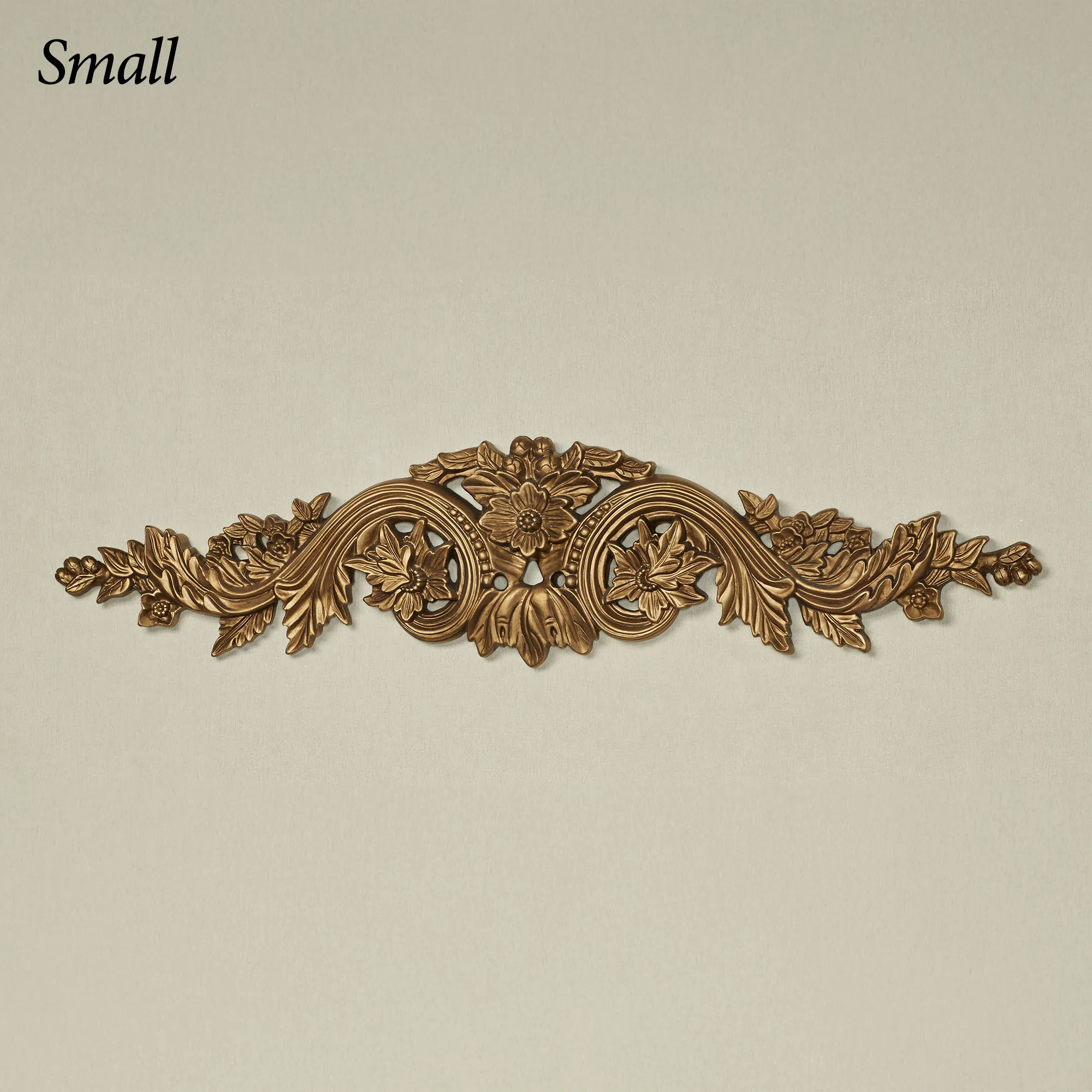The handpainted Flowering Medallion Aged Gold Wall Topper crowns a doorway or artwork with a beautiful elegance. Finished in aged gold and crafted from resin, the openwork wall accent features lovely flowers, classic acanthus leaves, and beaded scrolls. Small measures 32"Wx1.5"Dx7.5"H. Large measures 48"Wx1.5"Dx9"H.