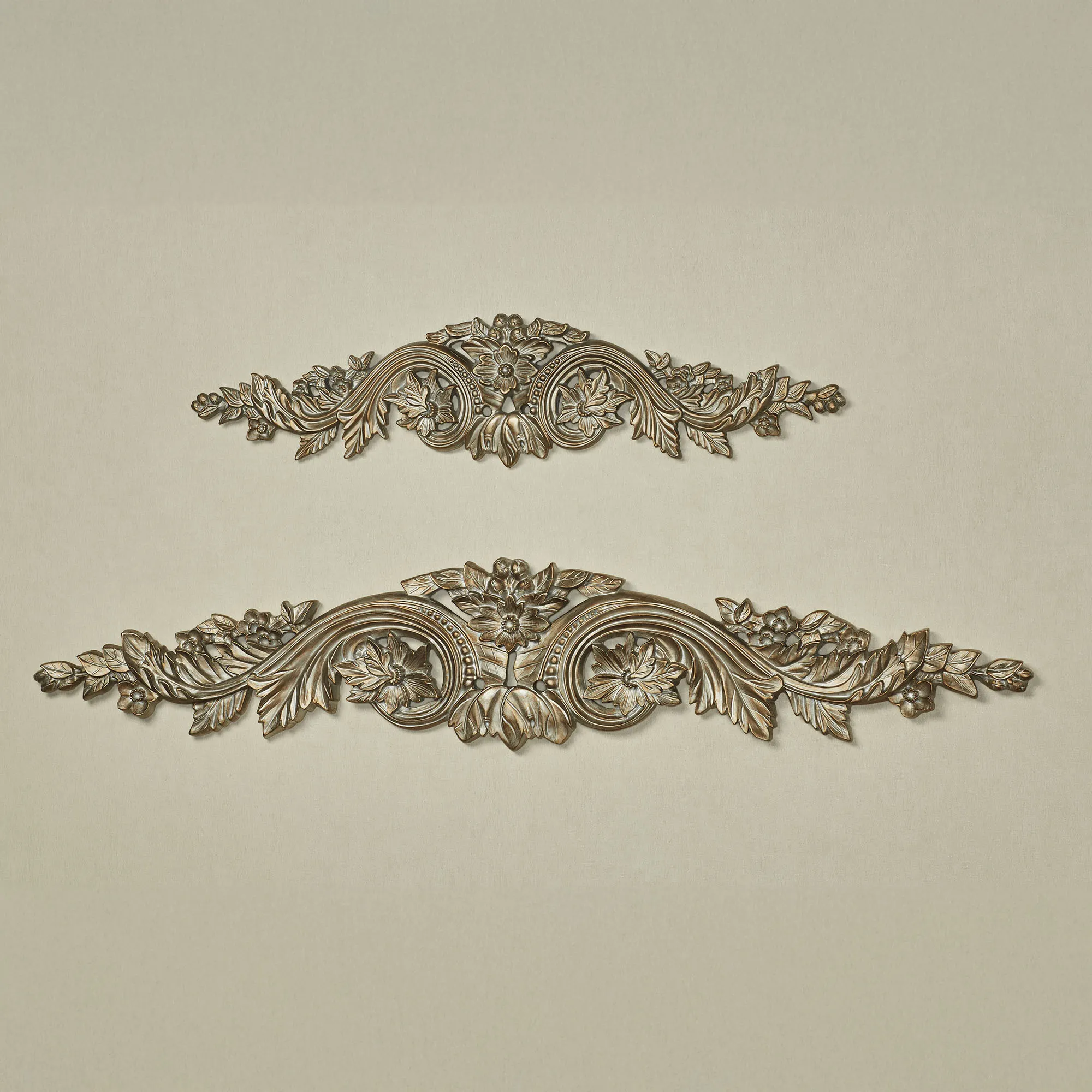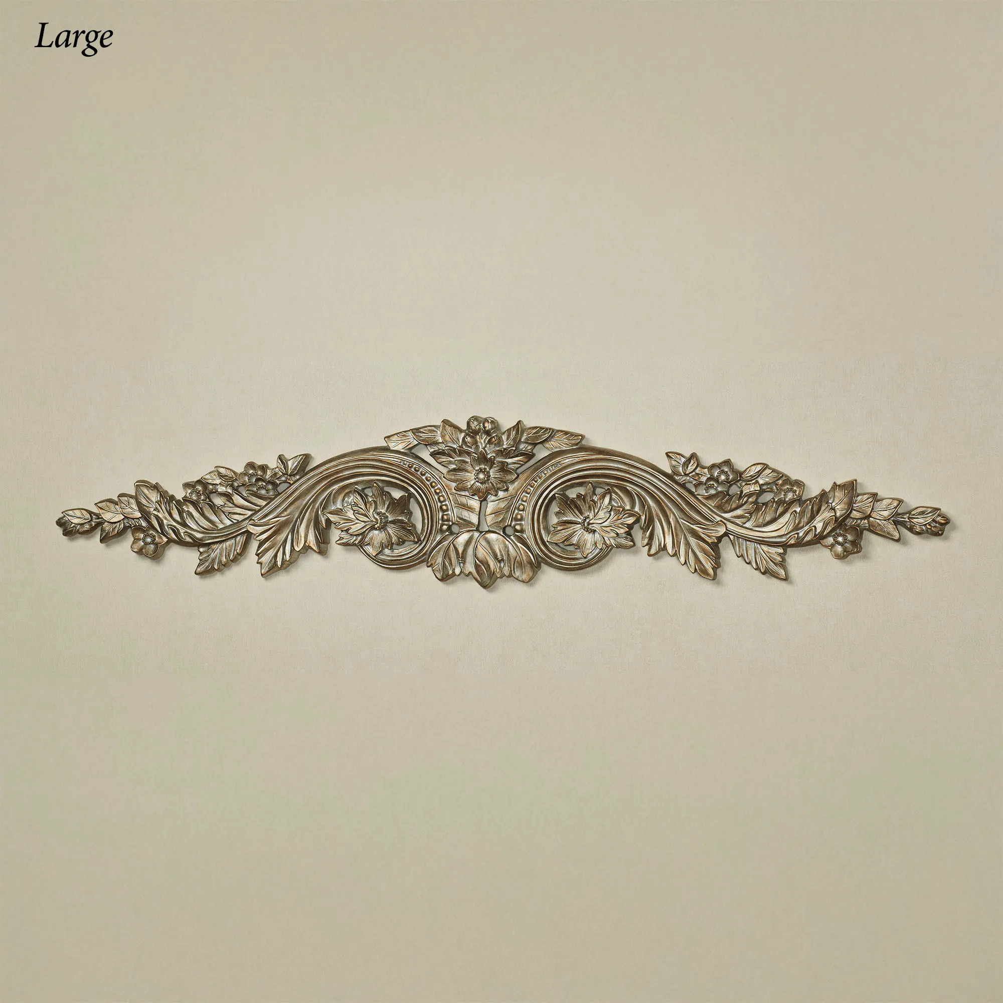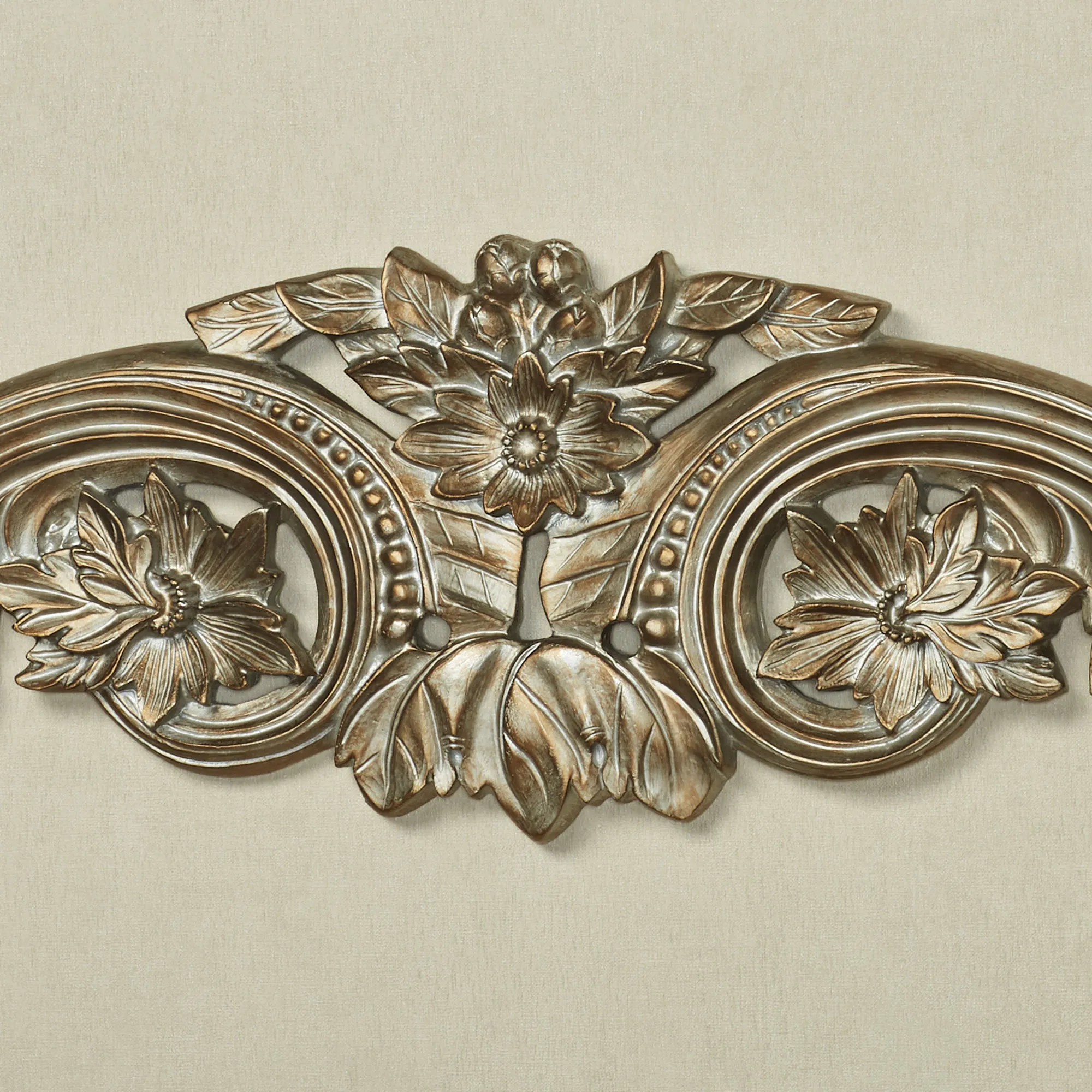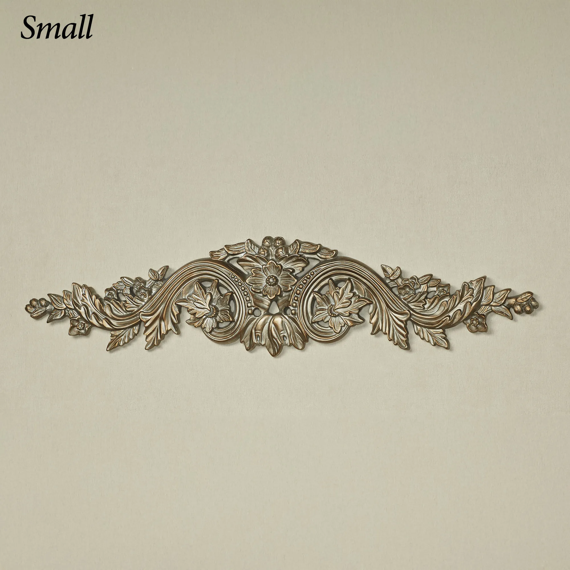The handpainted Flowering Medallion Platinum Wall Topper crowns a doorway or artwork with a beautiful elegance. Finished in platinum and crafted from resin, the openwork wall accent features lovely flowers, classic acanthus leaves, and beaded scrolls. Small measures 32"Wx1.5"Dx7.5"H. Large measures 48"Wx1.5"Dx9"H.